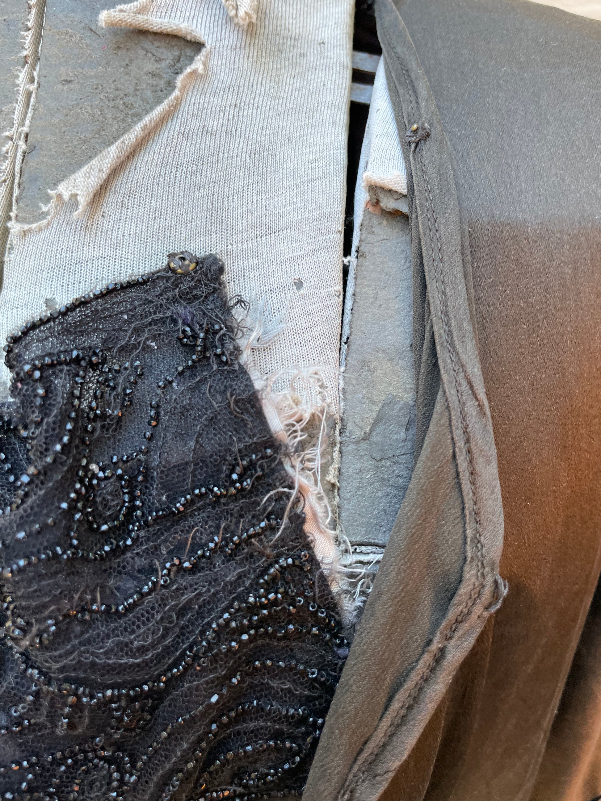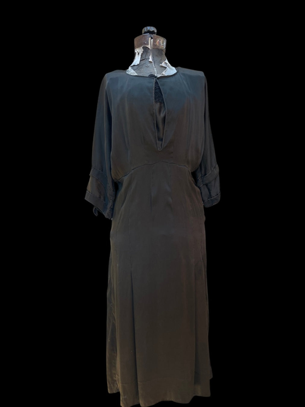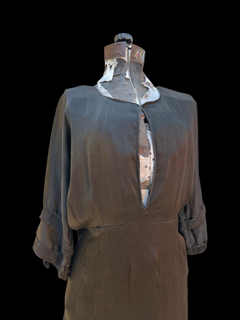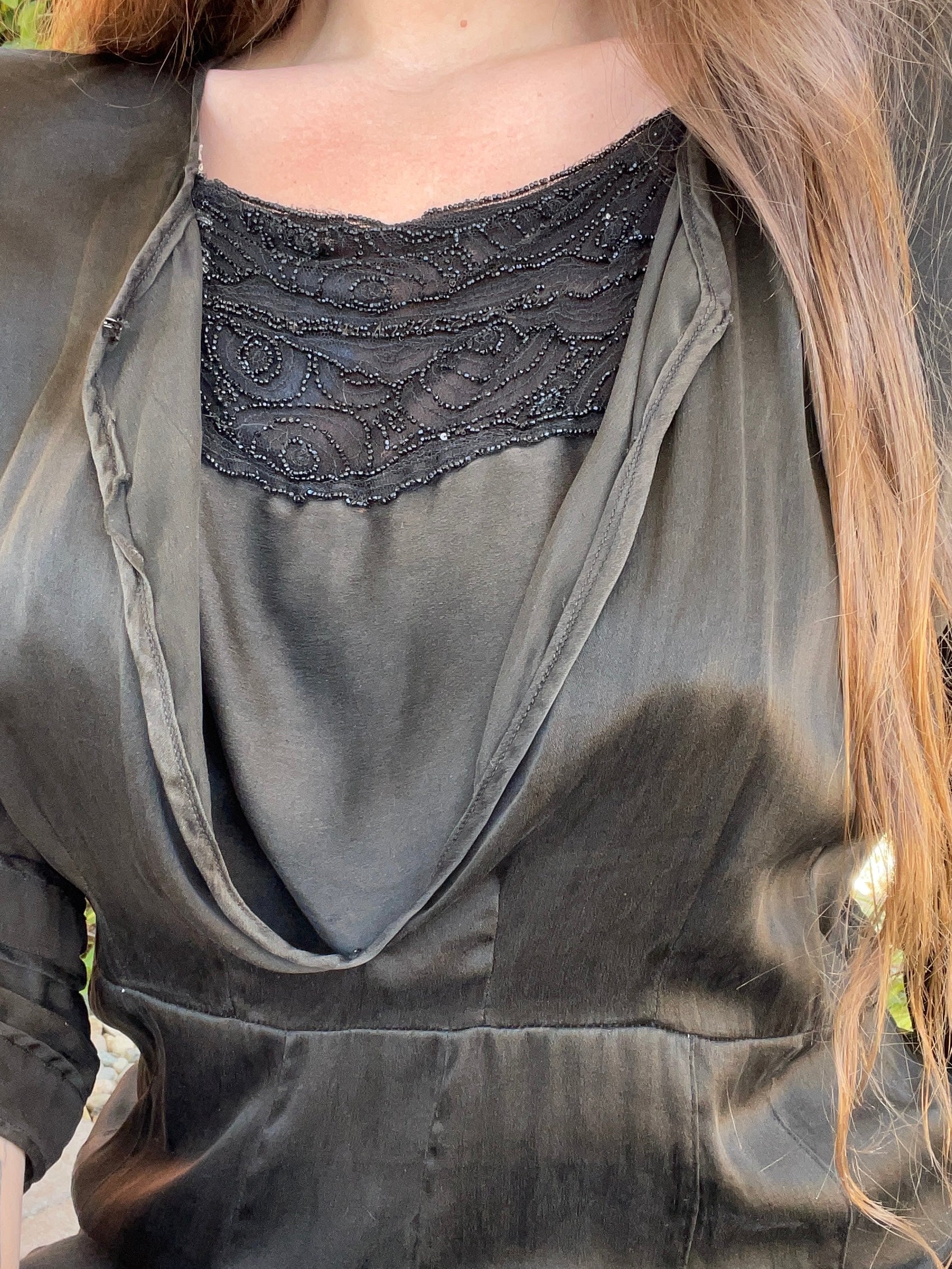 Gorgeous 1910s era charmeuse liquid bronzey-black midi length dress with peekaboo beaded modesty panel and a simple hook and eye that closes at the top ( beaded panel could easily be taken out so there is a skin peekaboo keyhole instead. 3/4 length sleeves and a slim pleated skirt.