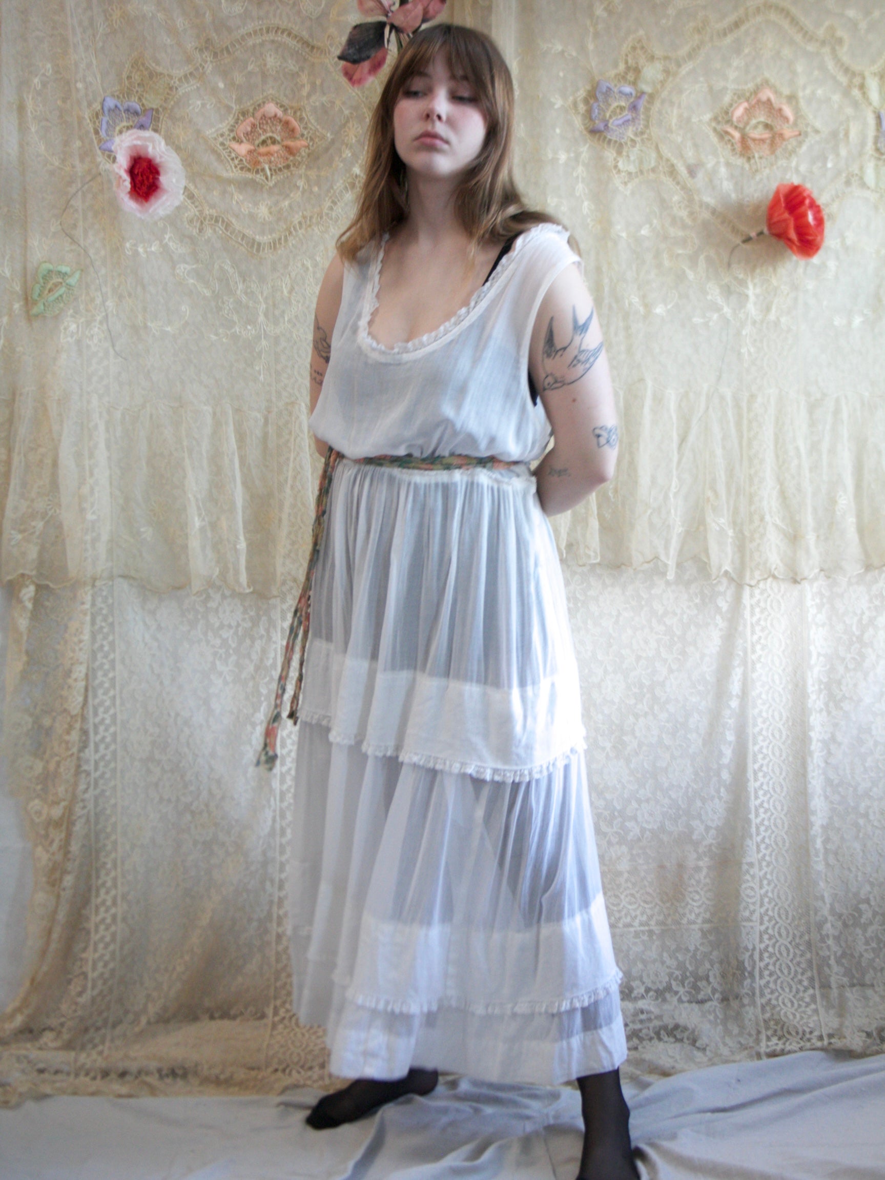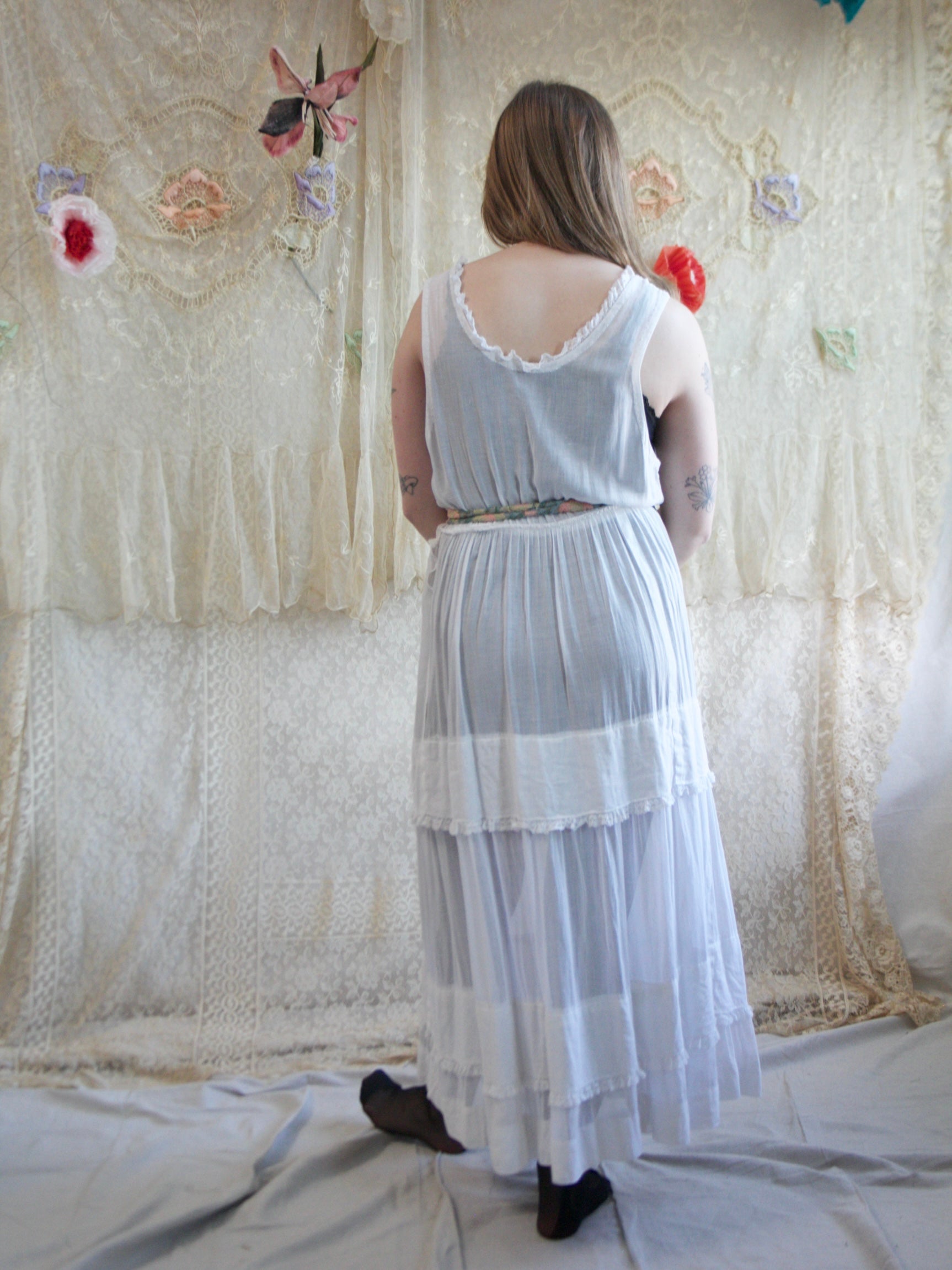 Antique 1920s semi sheer cotton lawn dress with lace trim and tiered skirt. Dropped armholes with side seam closures with a hook and eye and snap combination.