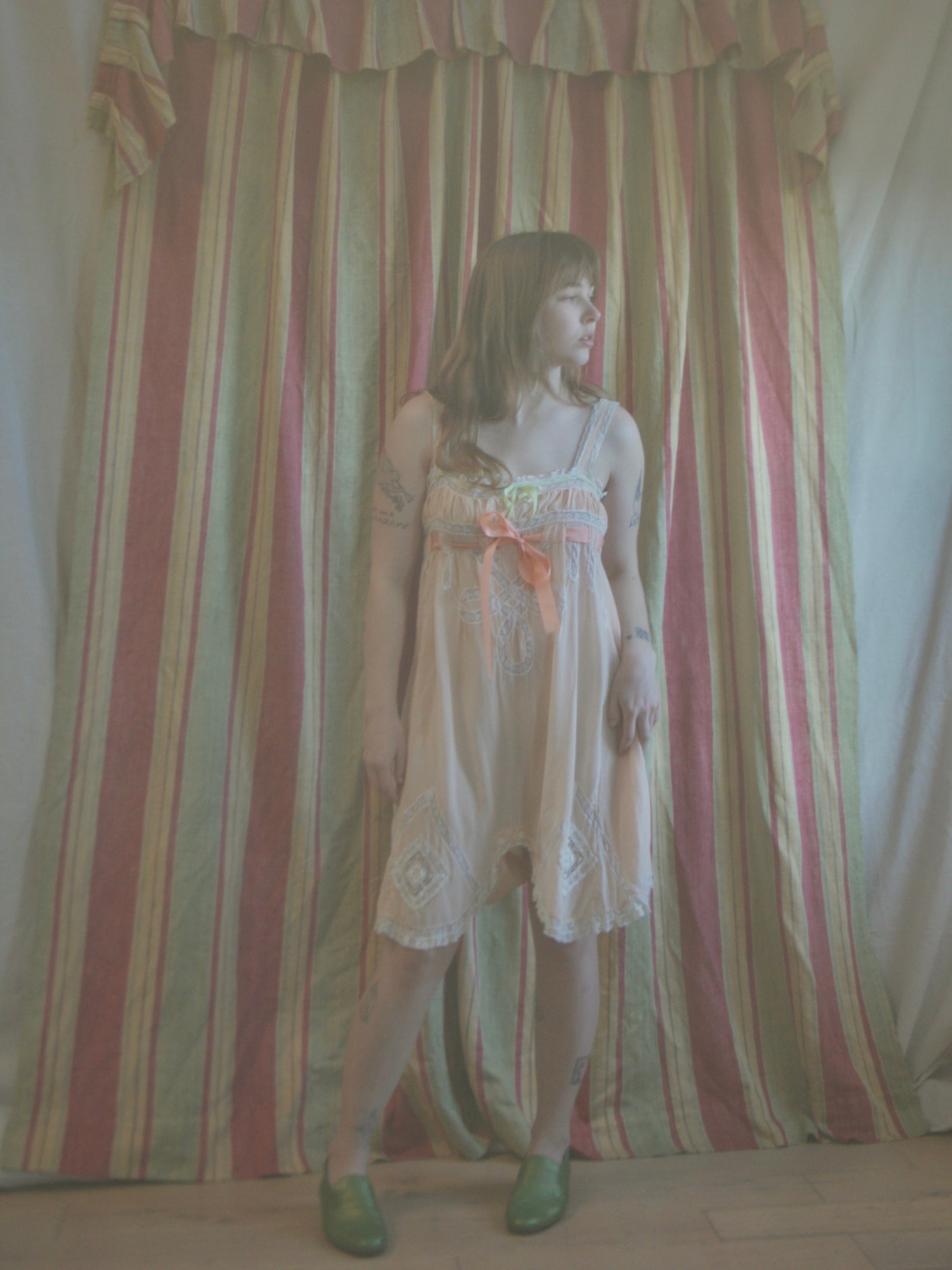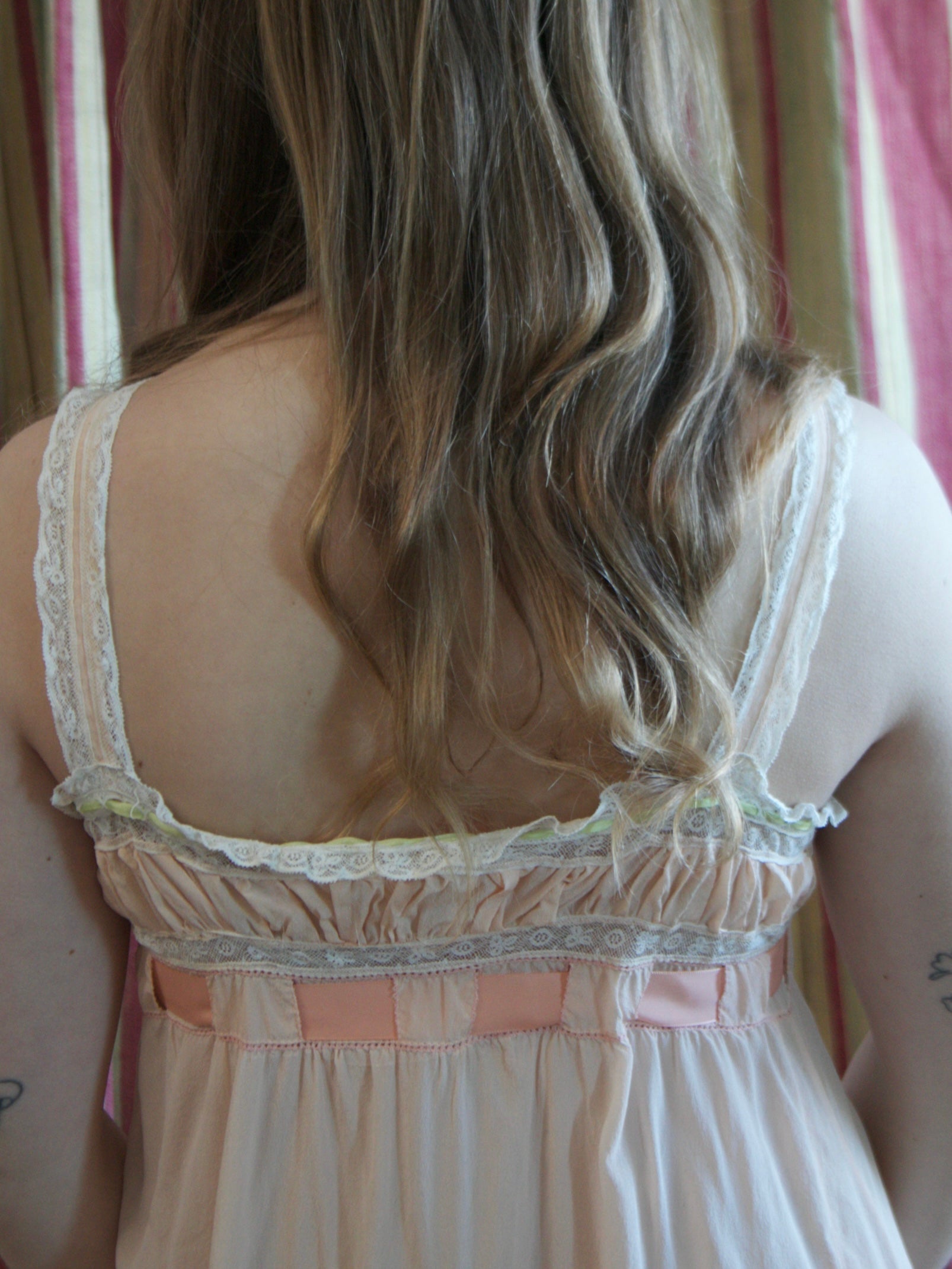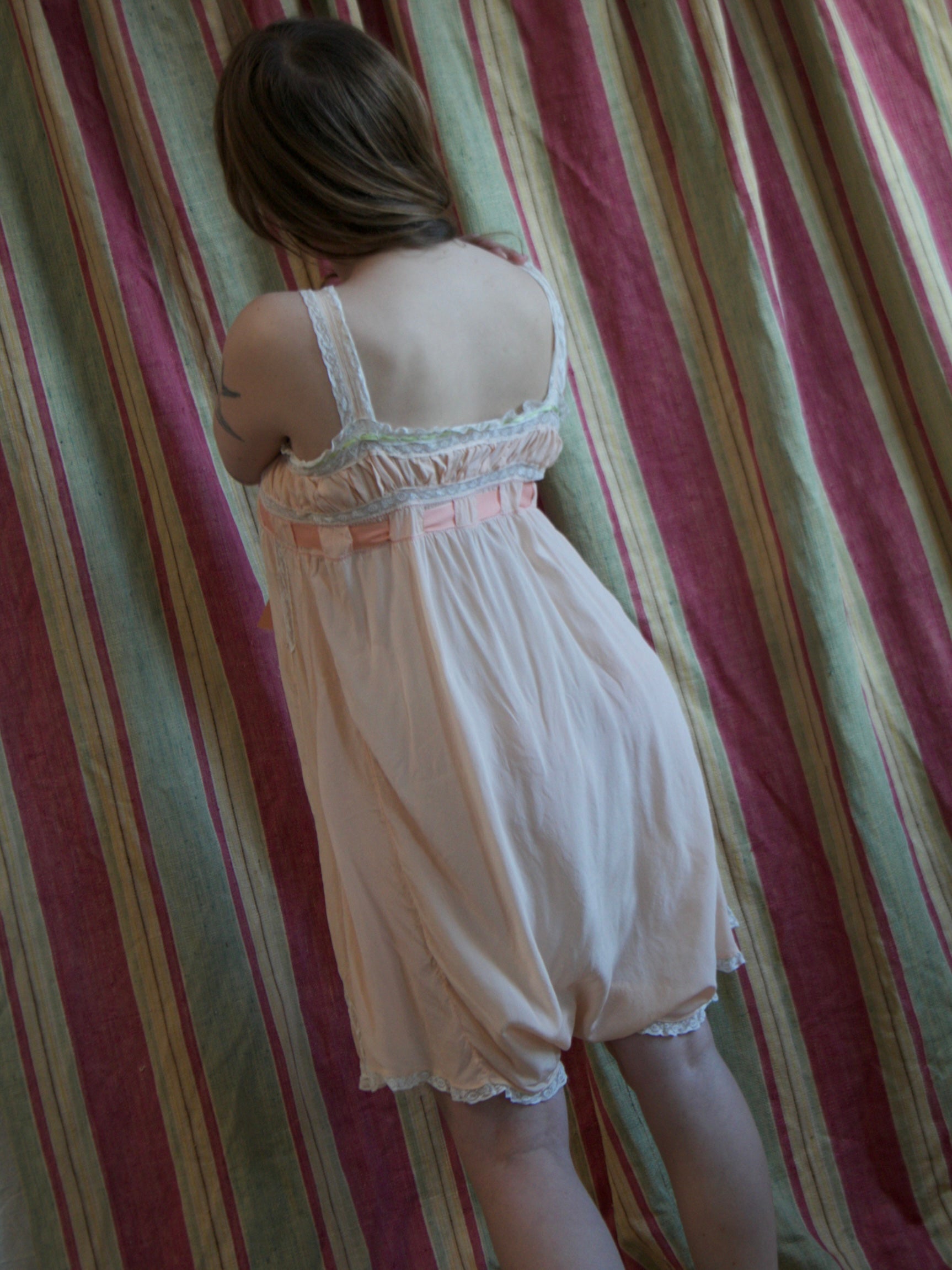 Antique 1920s pale coral-pink silk crepe step in with insertion lace and gathered empire style bust-line with woven ribbon at top and larger rayon satin ribbon at waistline. Dropped crotch for east with two mother of pearl buttons at the crotch seam.