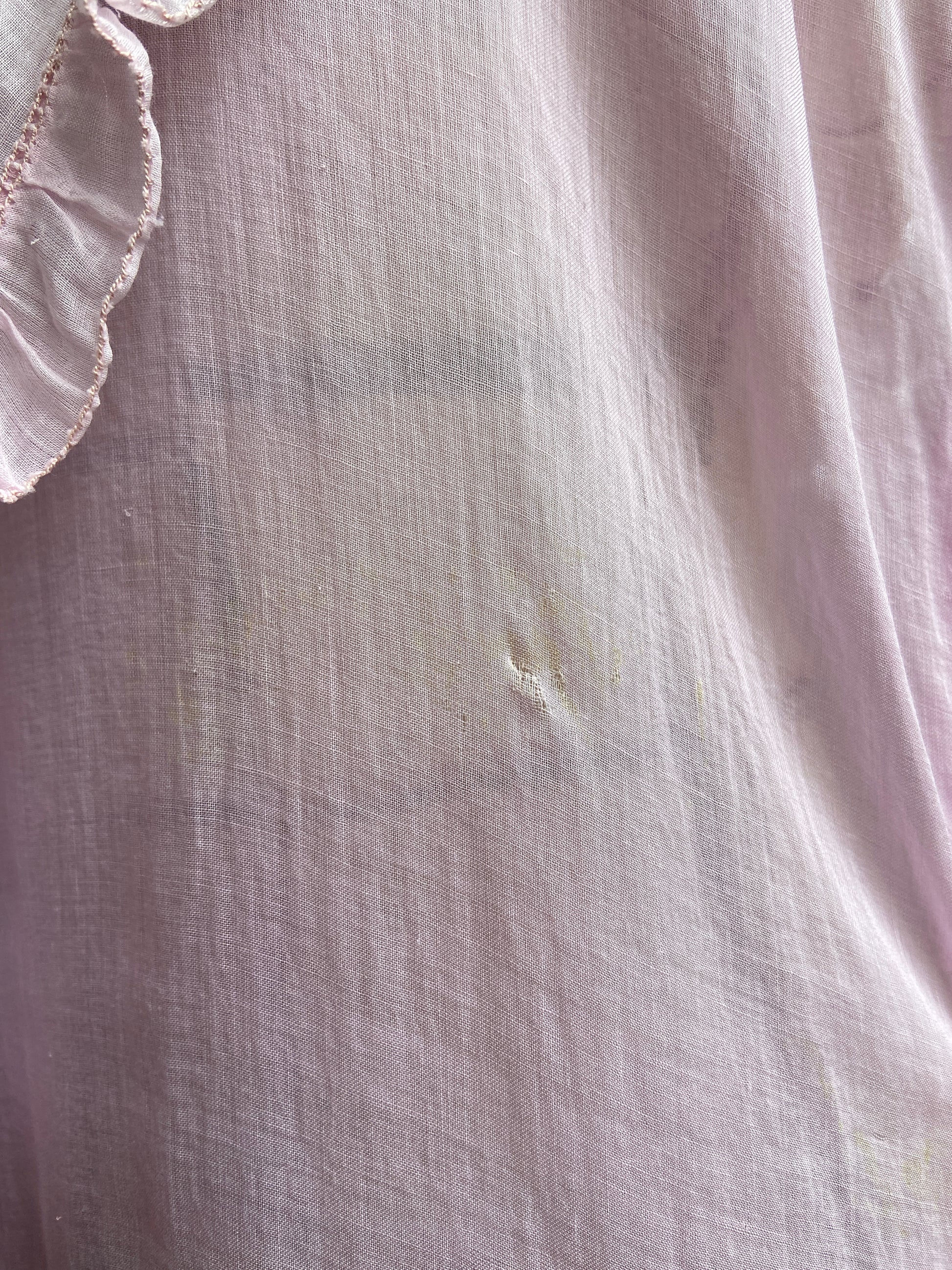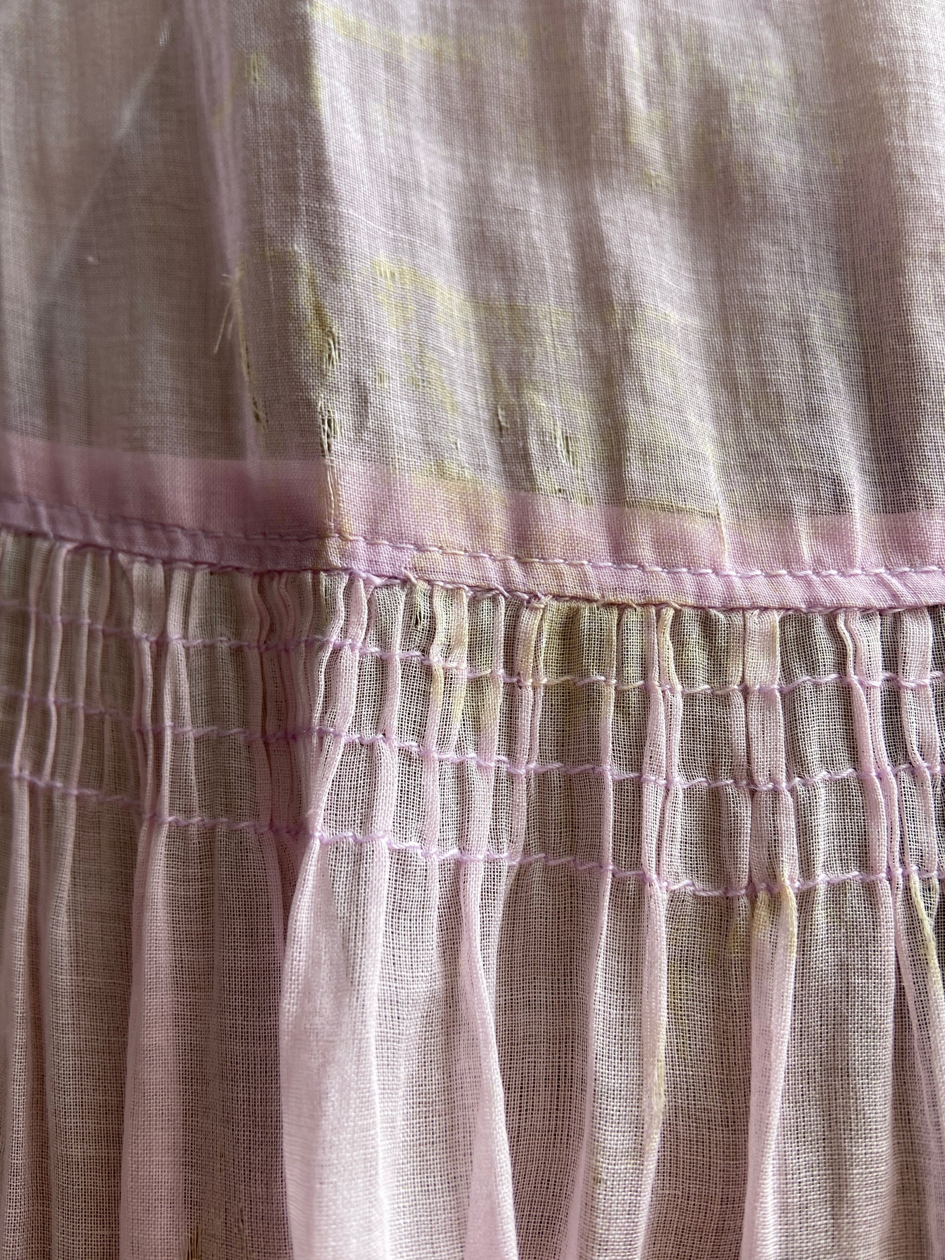 1920s light and airy lavender lower basket embroidered cotton voile dress with sailor style collar. Hand sewn detailing, smocking at waistline and flower basket embroidery on front an back.