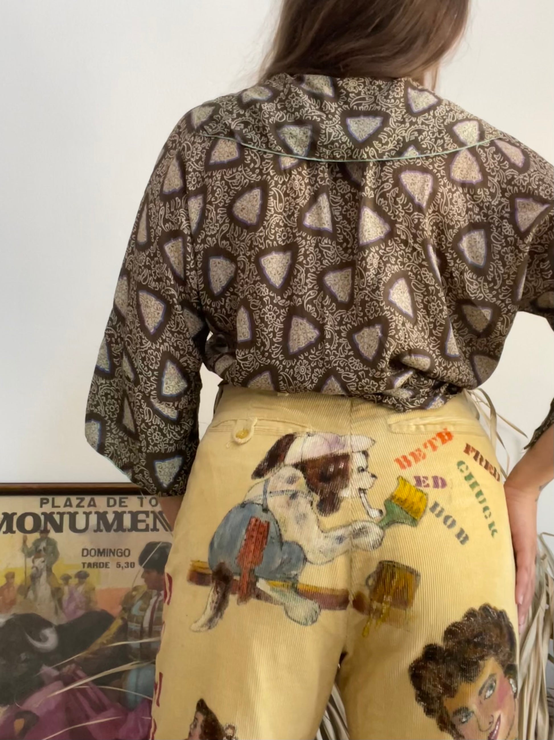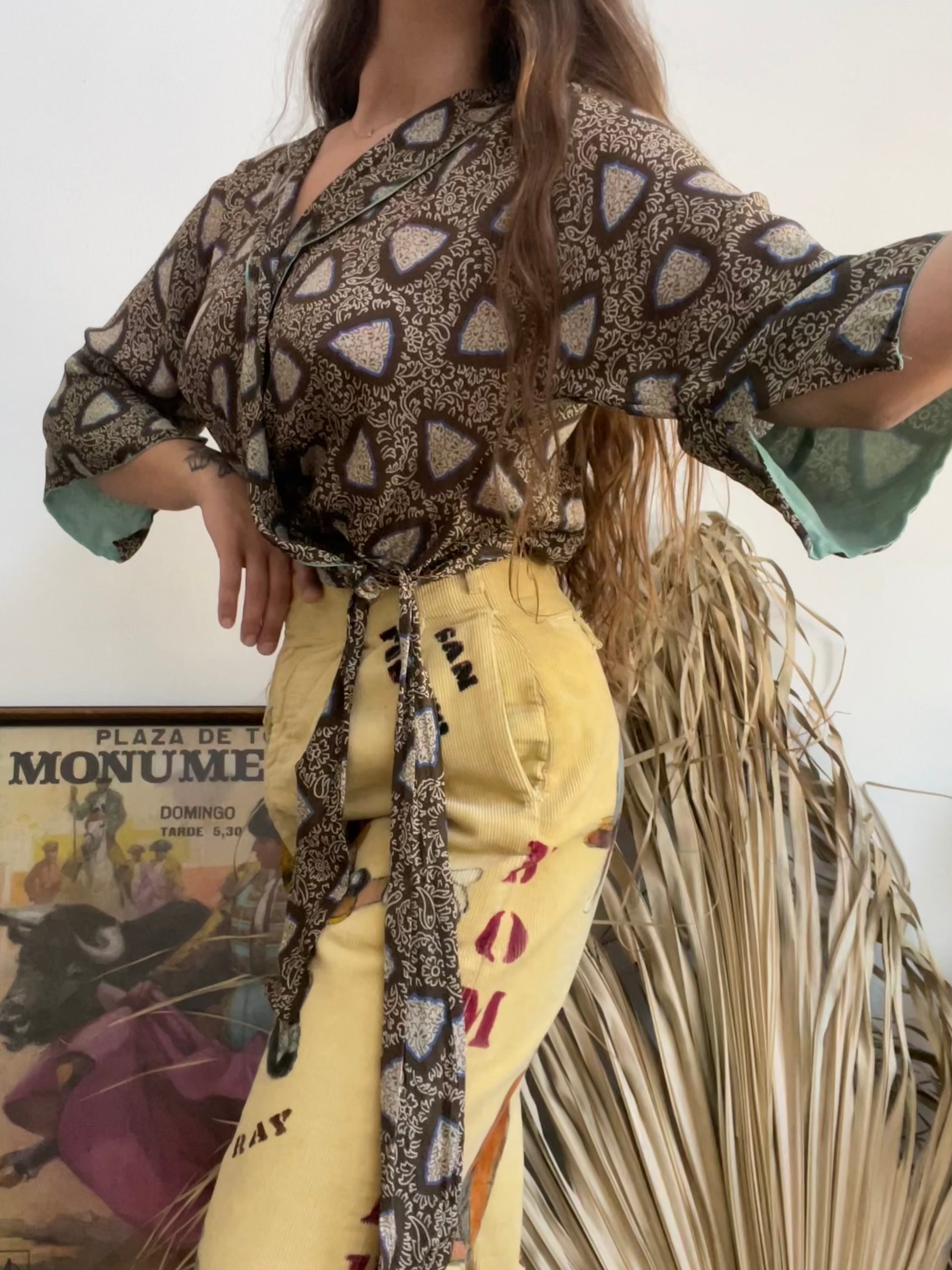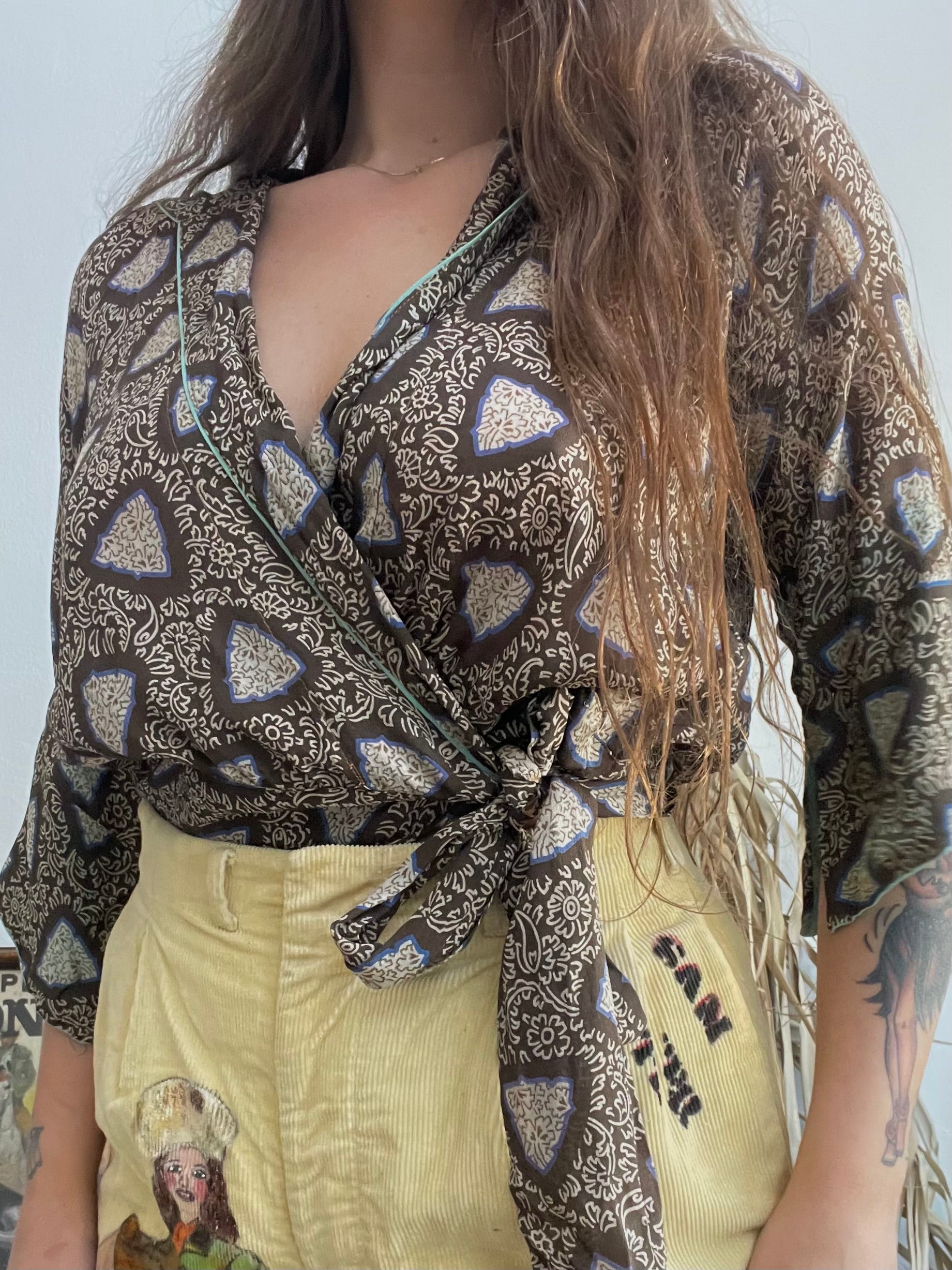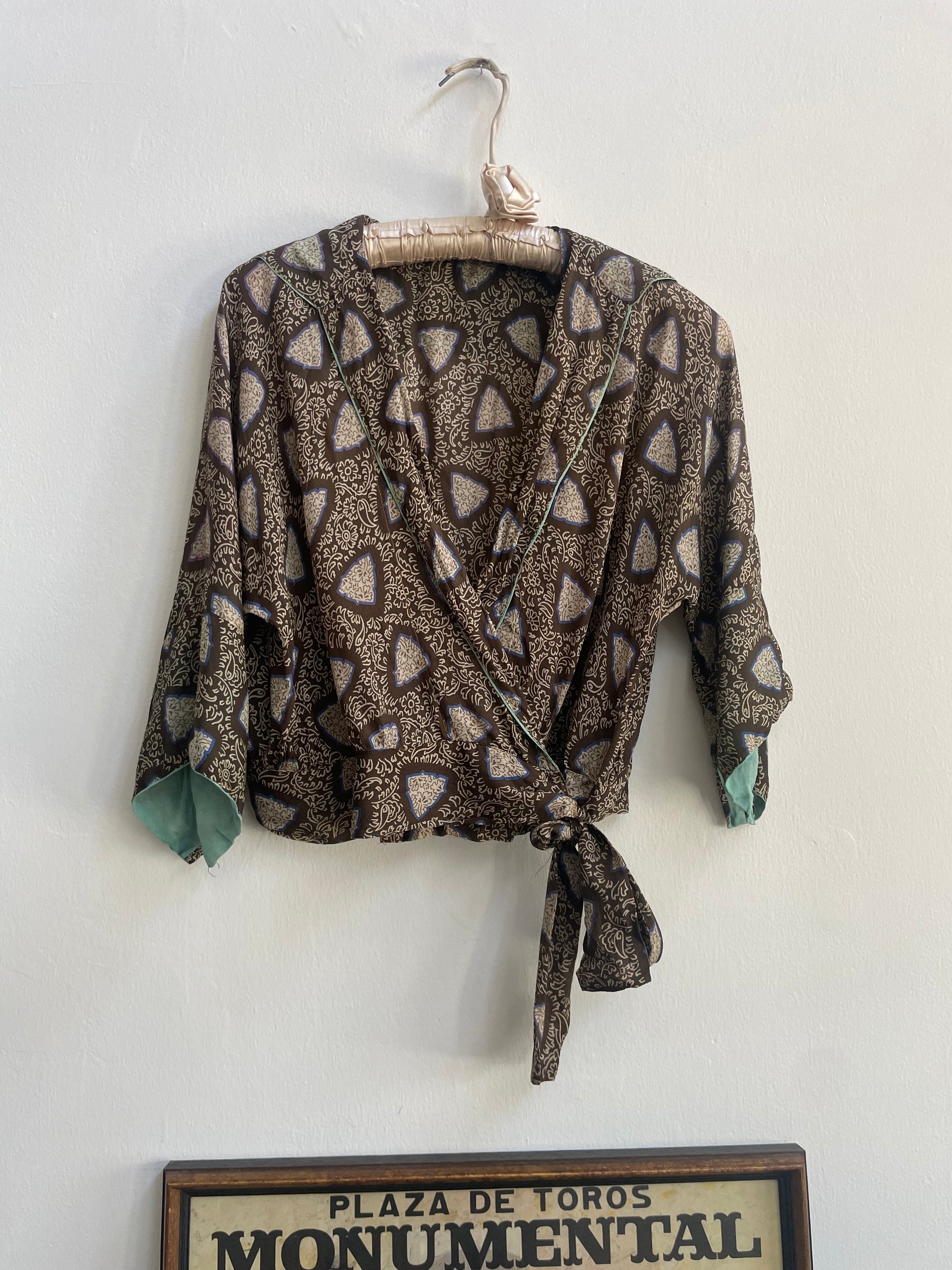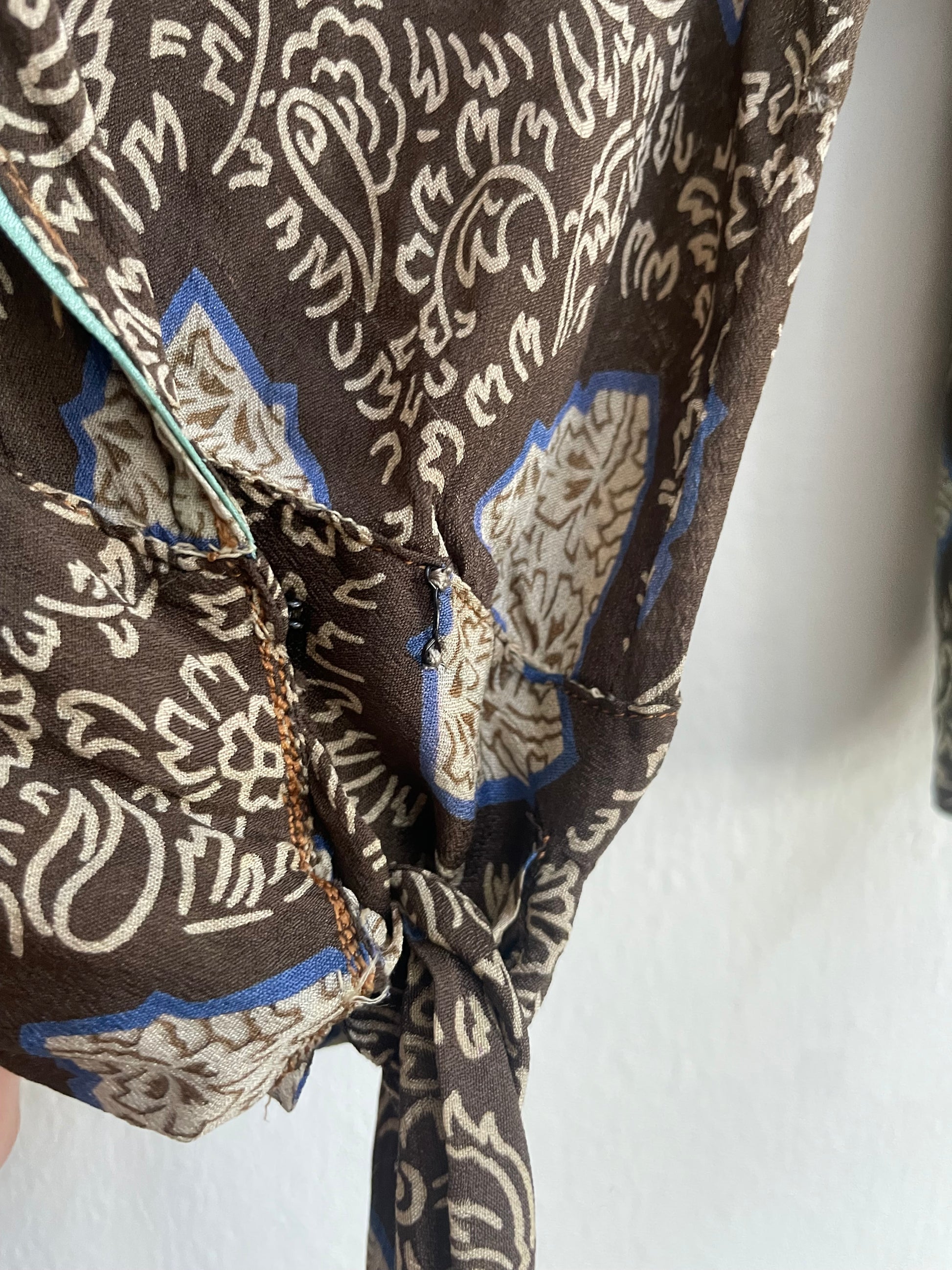 Very ethereal and easy to wear, a great 1920s printed acorn brown chiffon wrap style blouse with hook and eye closures at the waist in two spots with a tie, plunging V neck with a snap closure option, and angel sleeves with baby blue silk chiffon lining