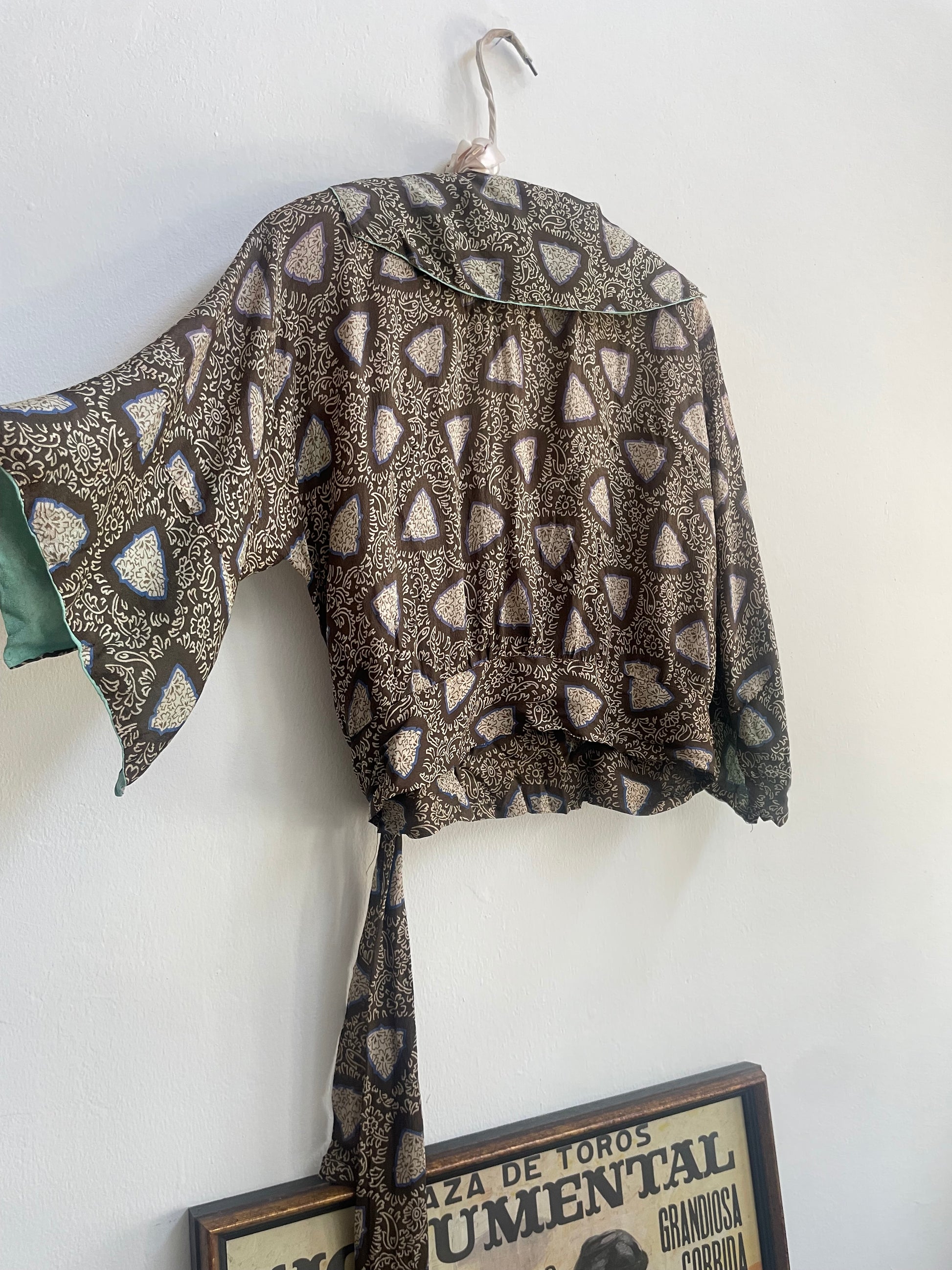 1920s Printed Chiffon Wrap/ Tie Waist Angel Sleeve Blouse