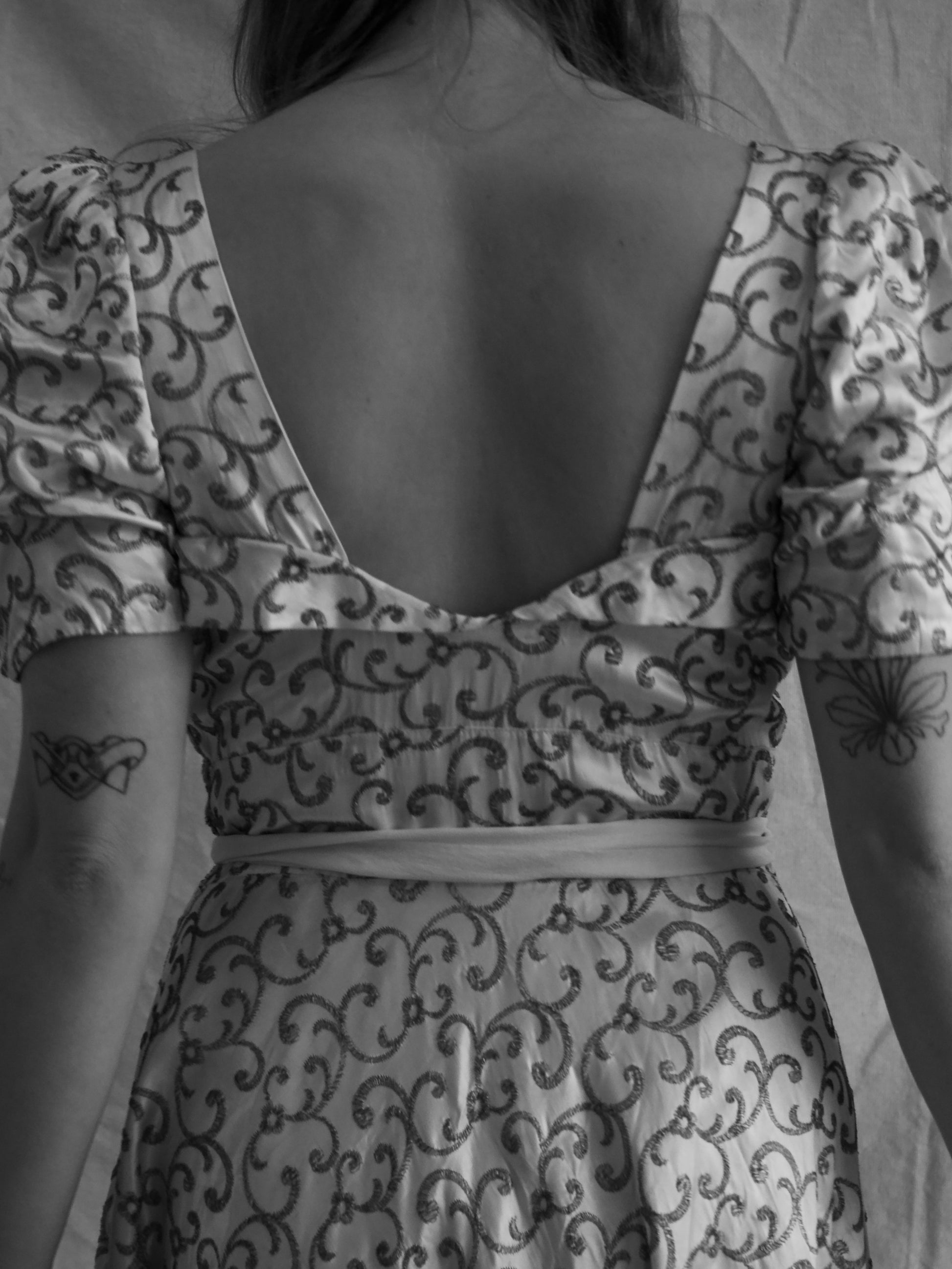 1930s-1940s candlelight silk satin lamé embroidered gown with a sweetheart neckline, ruched bodice, and puff sleeves. Side seam zipper closure with a full-sweeping skirt. By ‘Kalmour’