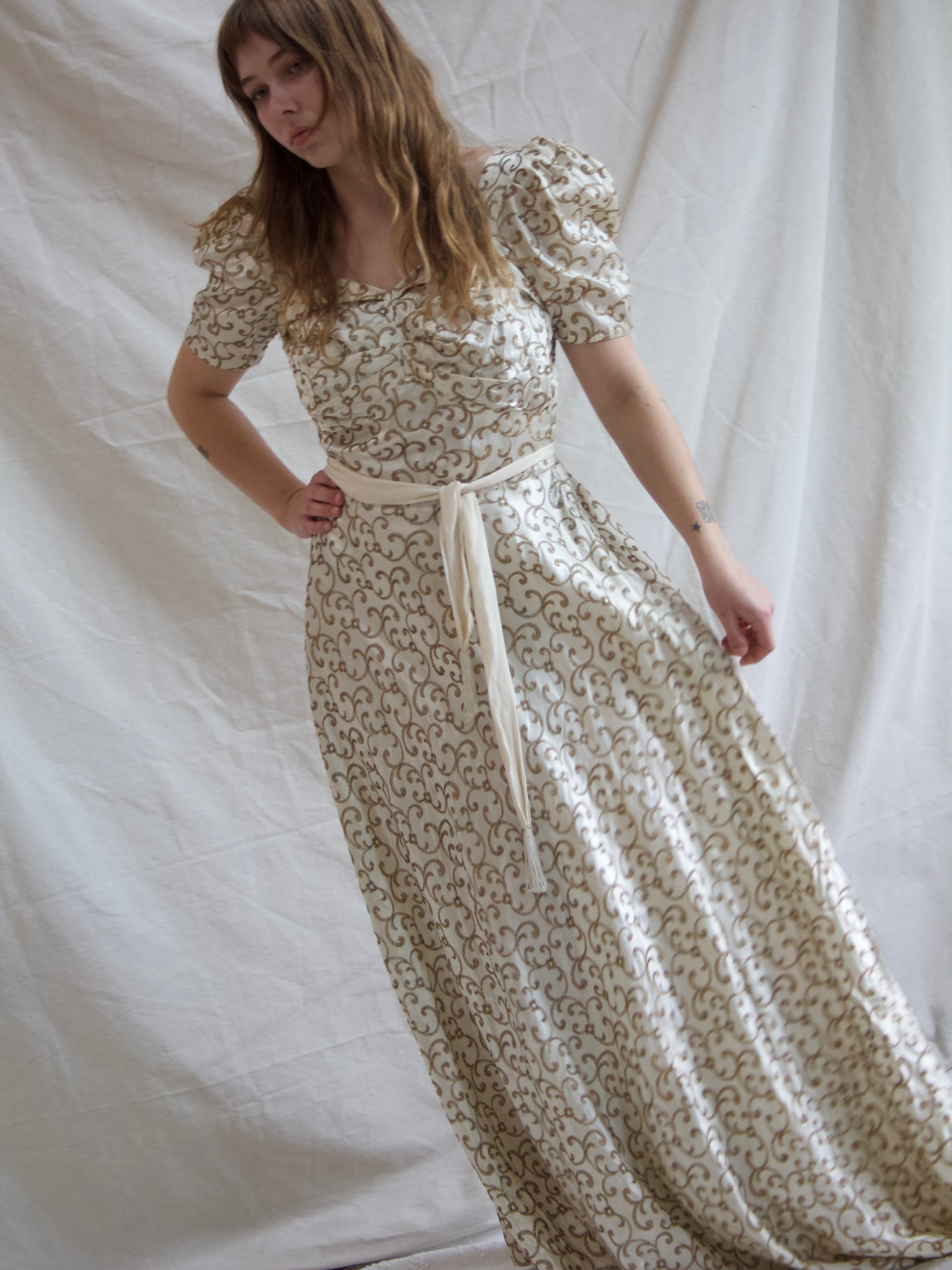 1930s Candlelight Silk Satin Lamé Embroidered Puff Sleeve Sweetheart Gown