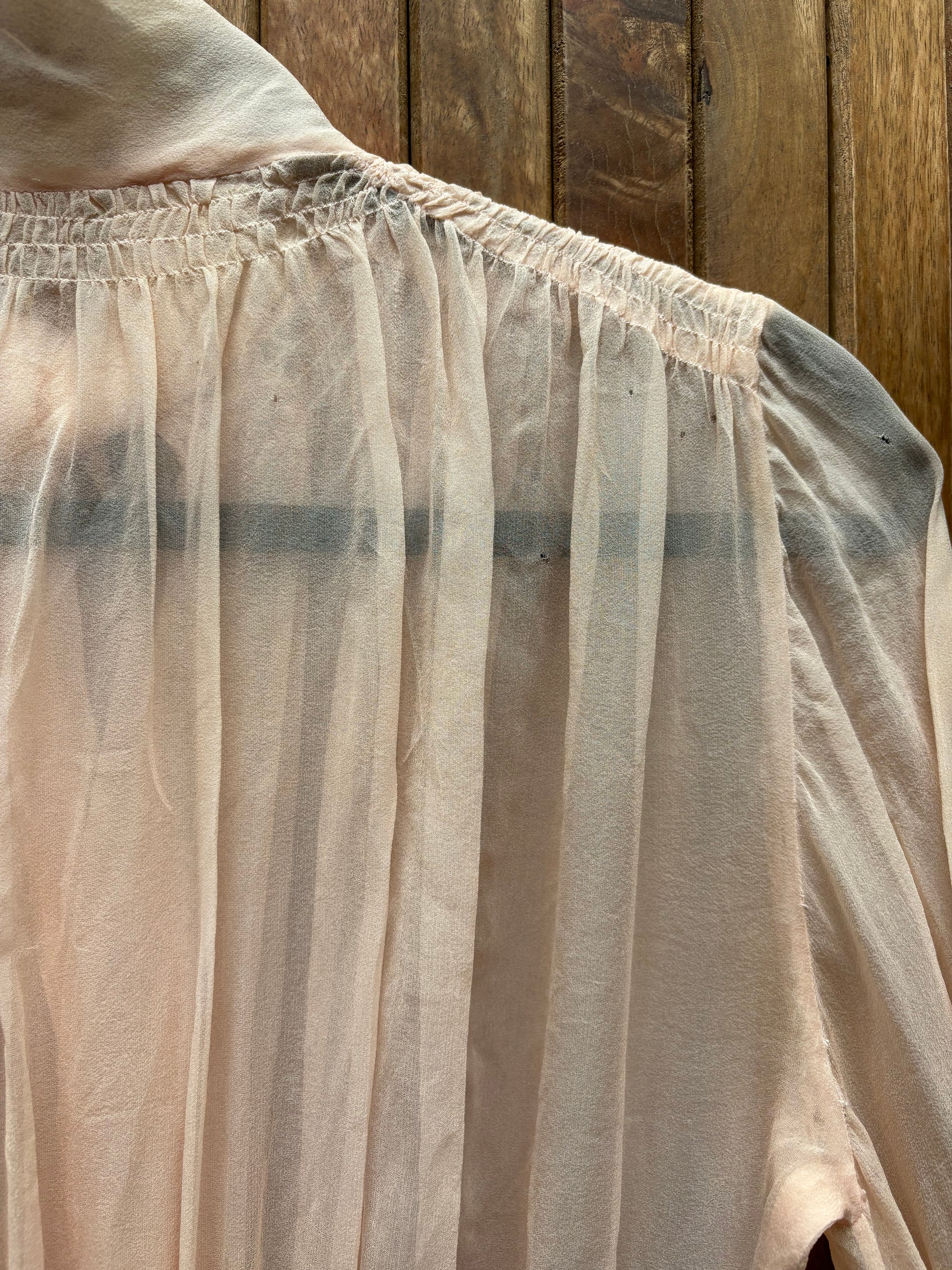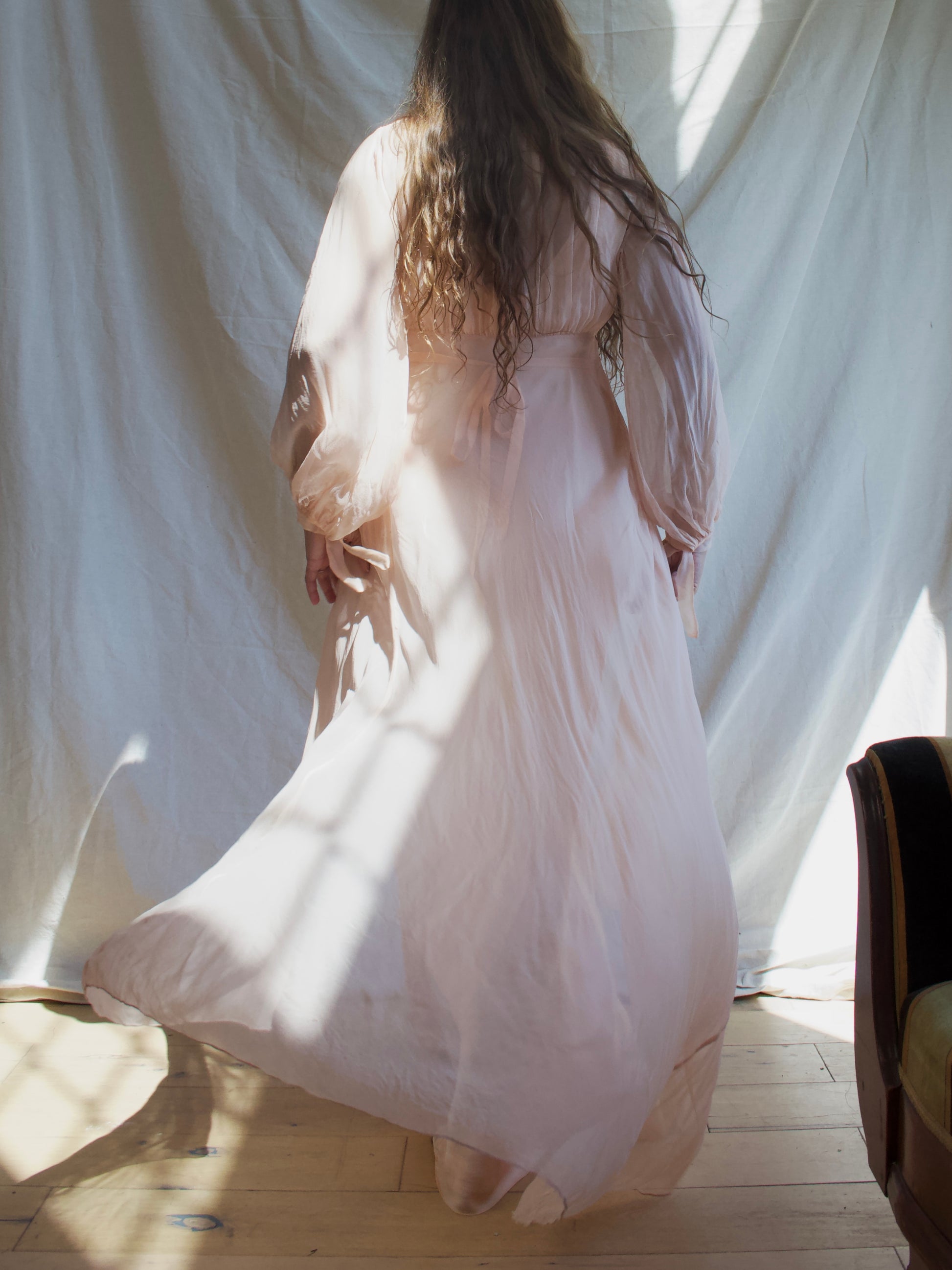 Stunning 1930s pale pink chiffon trained peignoir with smocking at shoulders and waist, voluminous bishop sleeves, three button closures at waist, and neck ties.