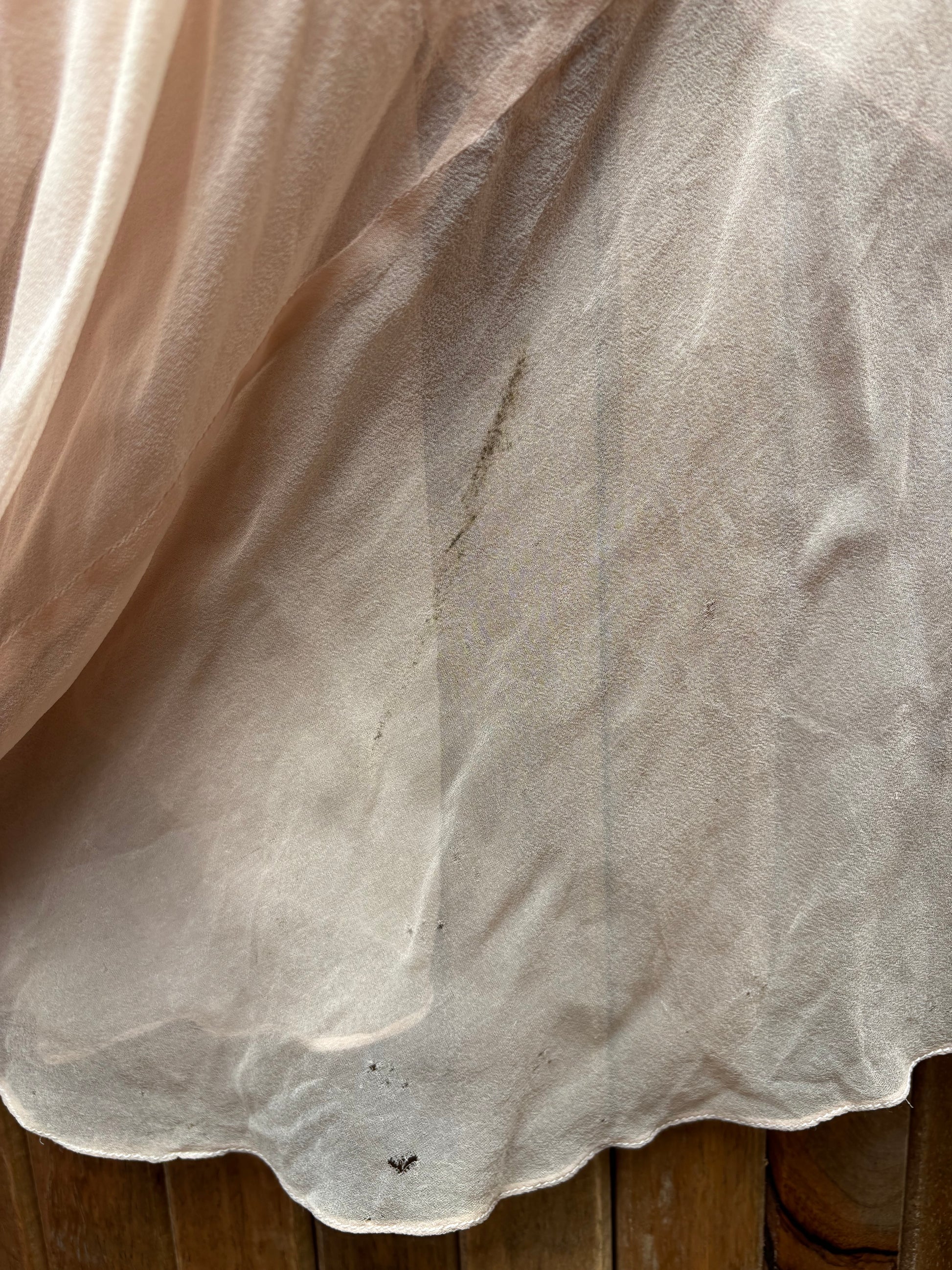 Condition: Good for age, with some minor flaws. Tiny pin holes scatted, mostly along hem in one area, two marks on back skirt hem. Presents beautifully on
