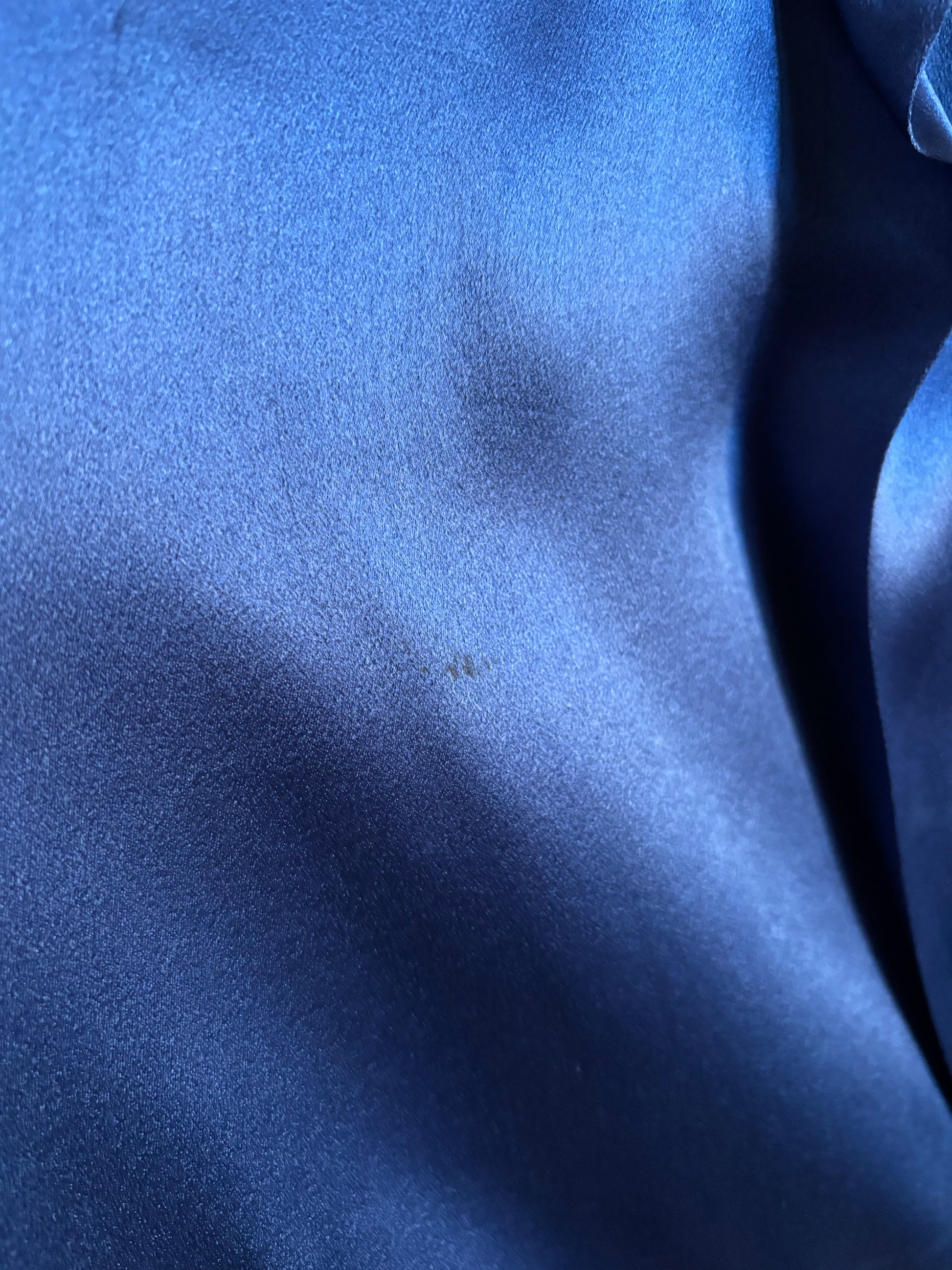 Absolutely stunning 1930s vibrant cobalt blue silk charmeuse plunging neckline capelet style blouse with large shell buttons and loop closures at waist with cut out sides and decorative shell buttons on the lapels. Most likely part of a two piece gown set originally, but I love this piece on its own.