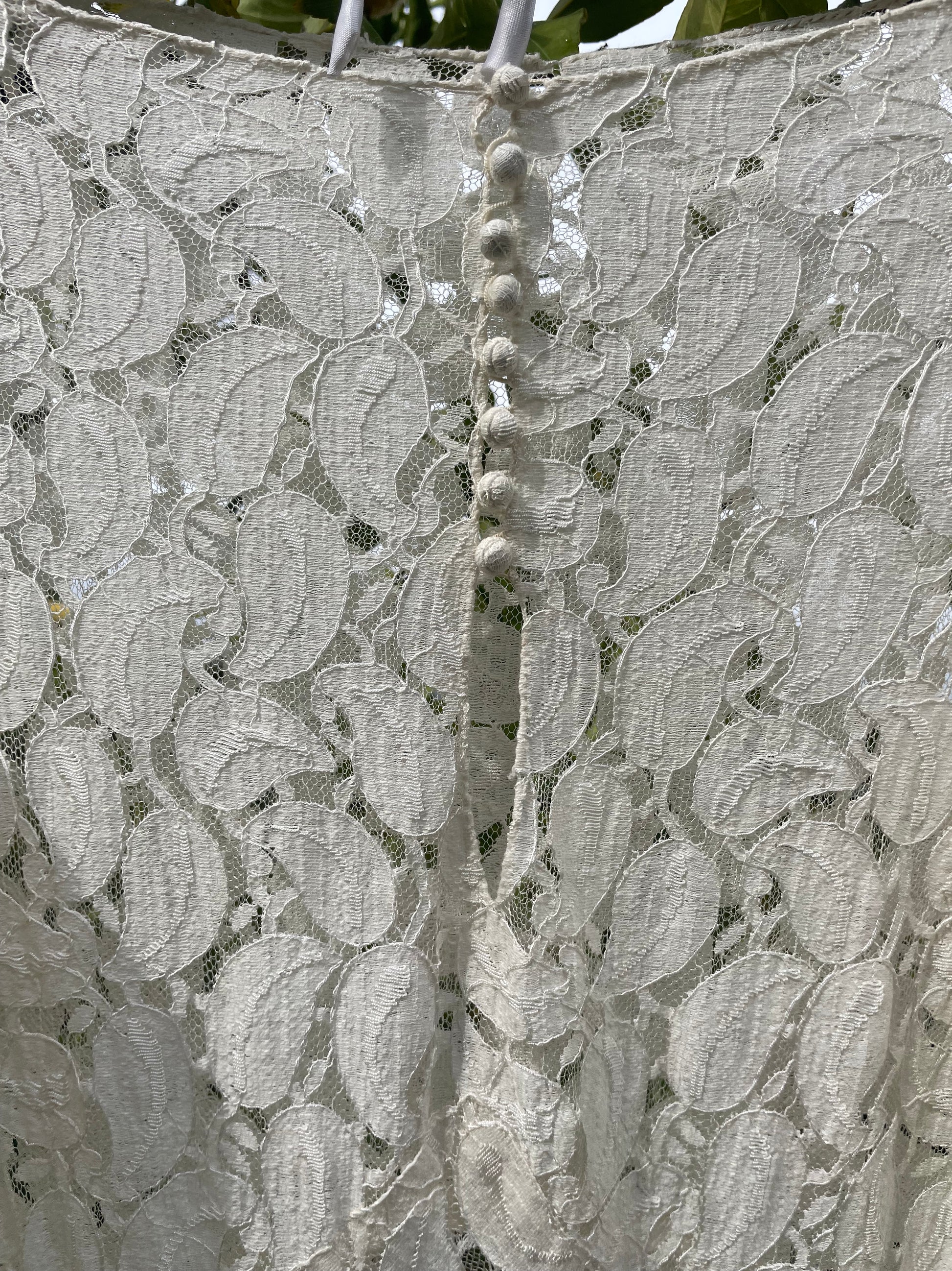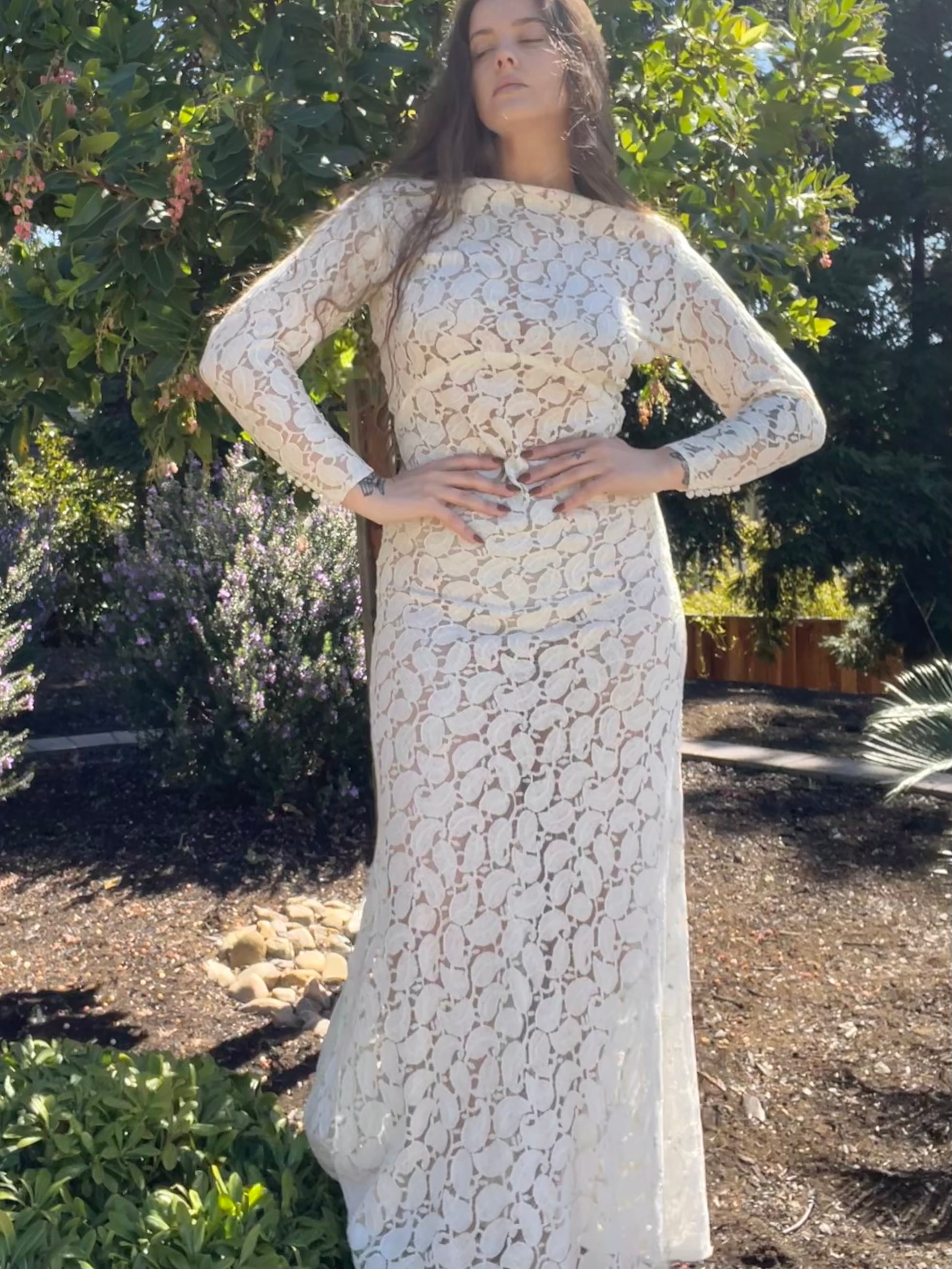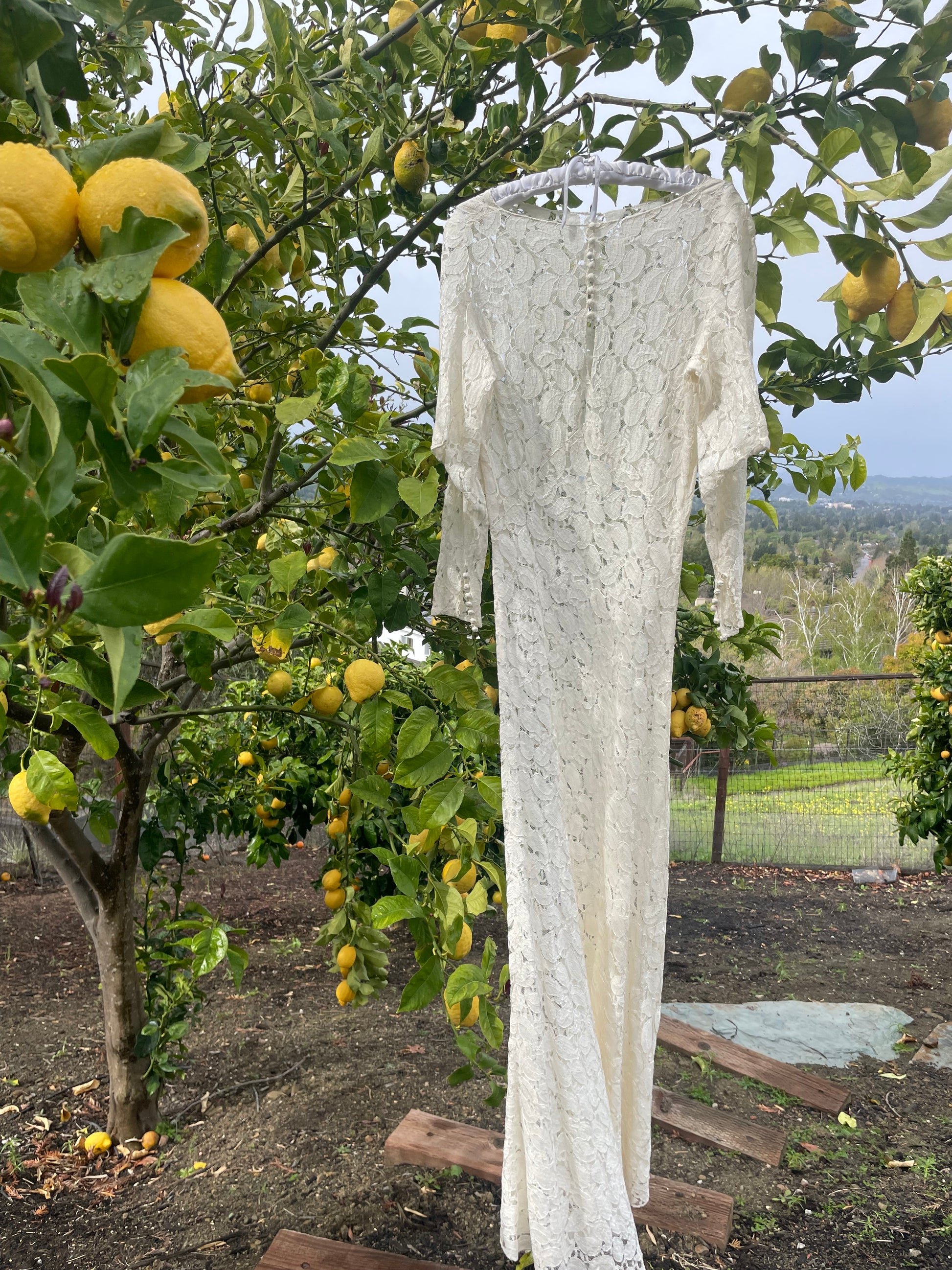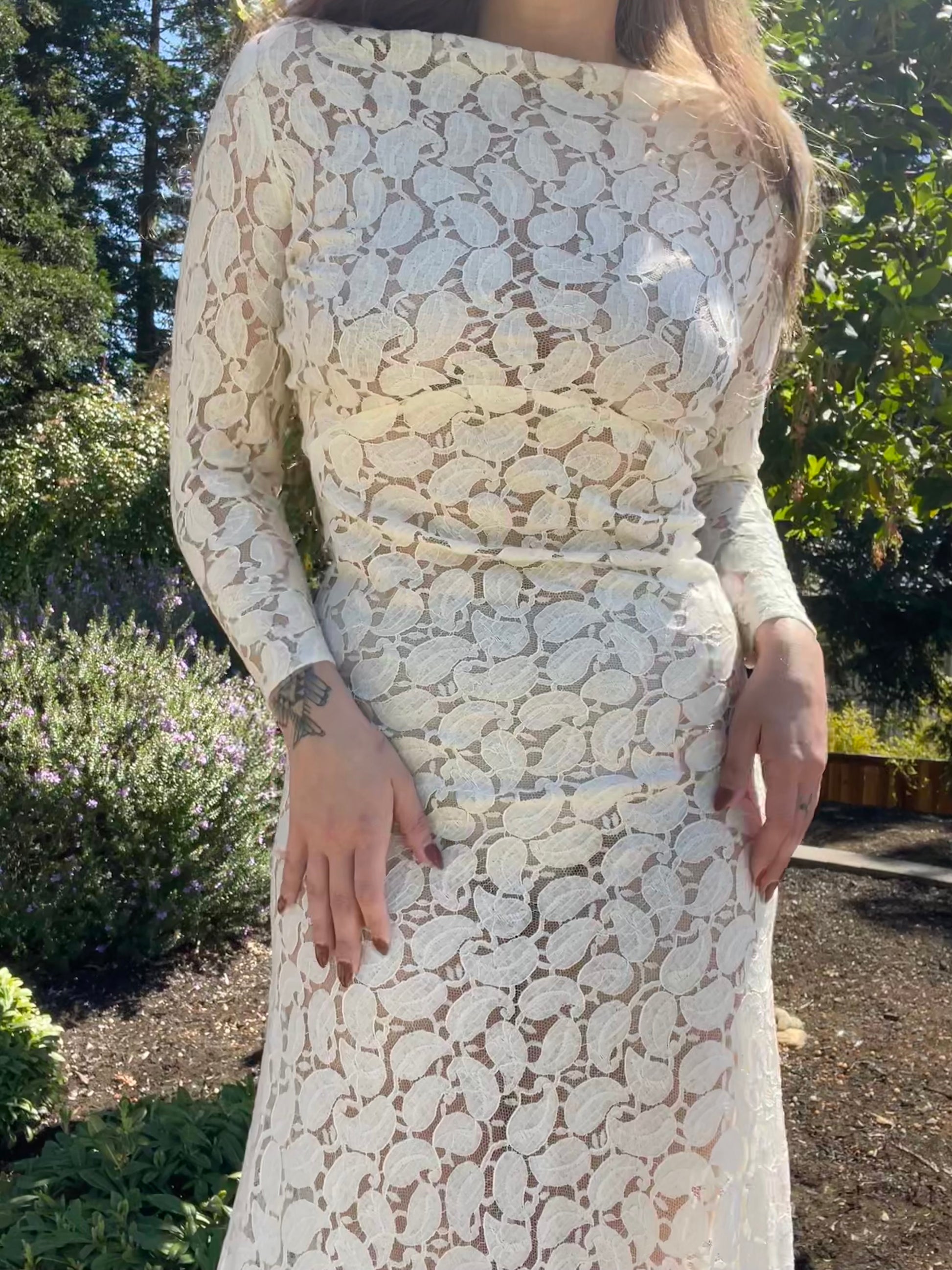 Stunning and classic 1930s bridal gown made of an eggshell lace. Features a sweeping neckline that skims the collar bones and shoulders with long sleeves that have exaggerated shoulder points, as well as deco seaming. Fabric covered buttons at the nape of back neck down to a small keyhole, wrists have fabric covered buttons as well to be able to get on and off easier. Lace breathes and stretches with ease. Wear for your special day or for any occasion