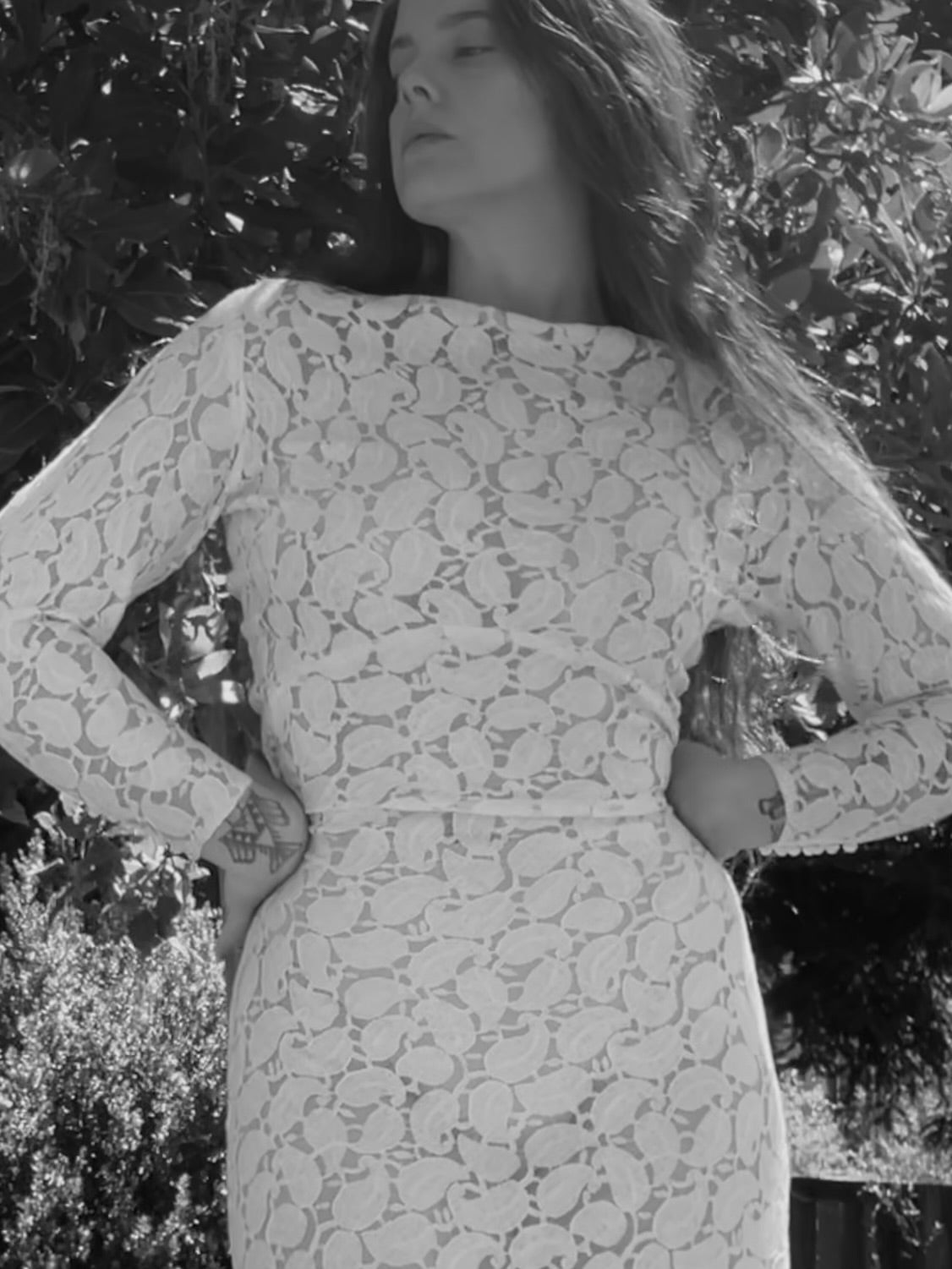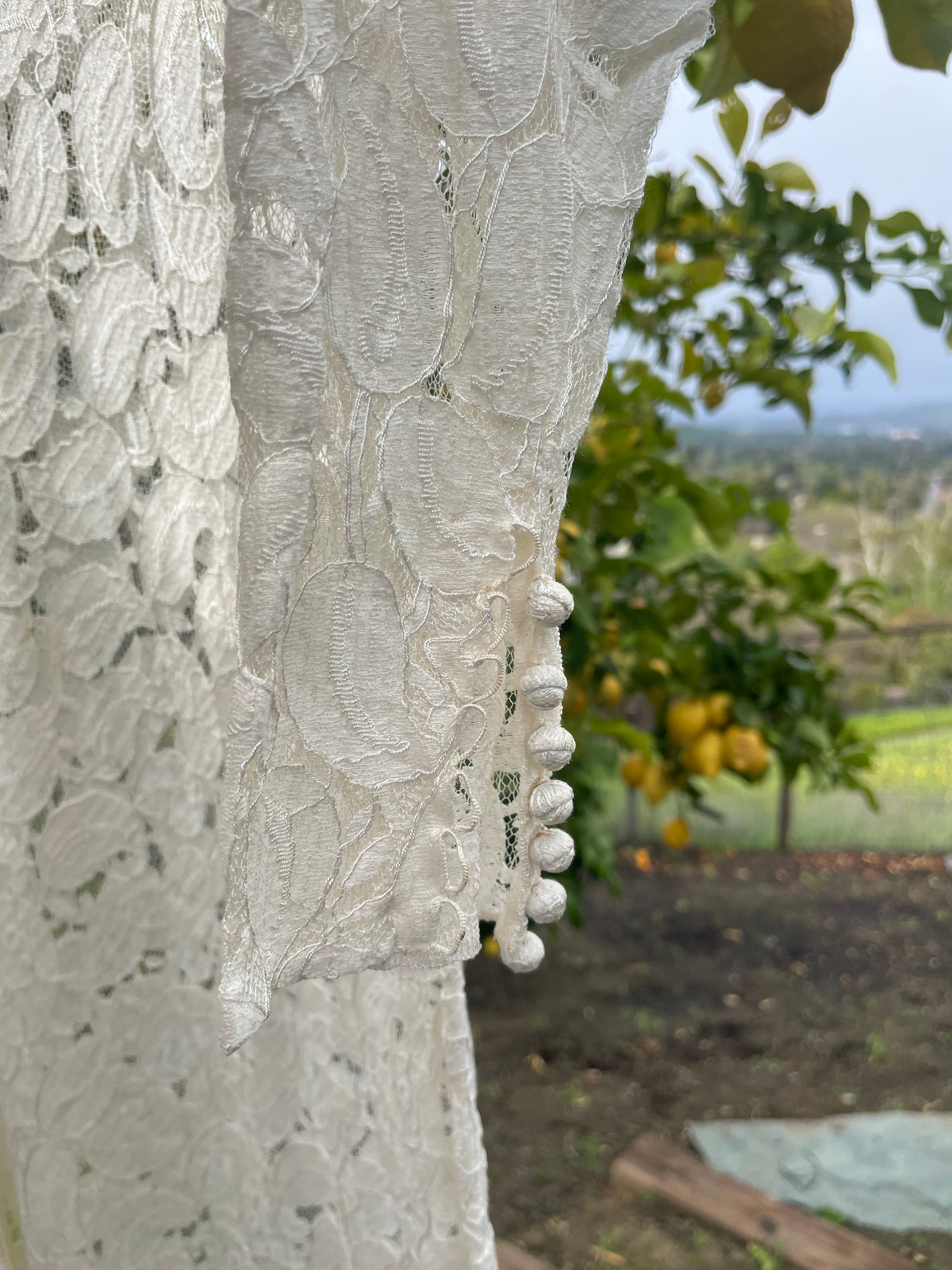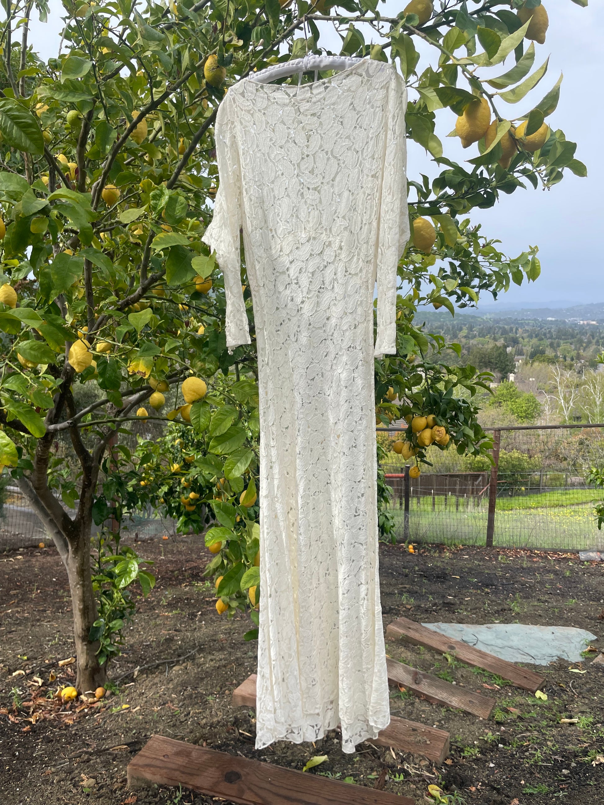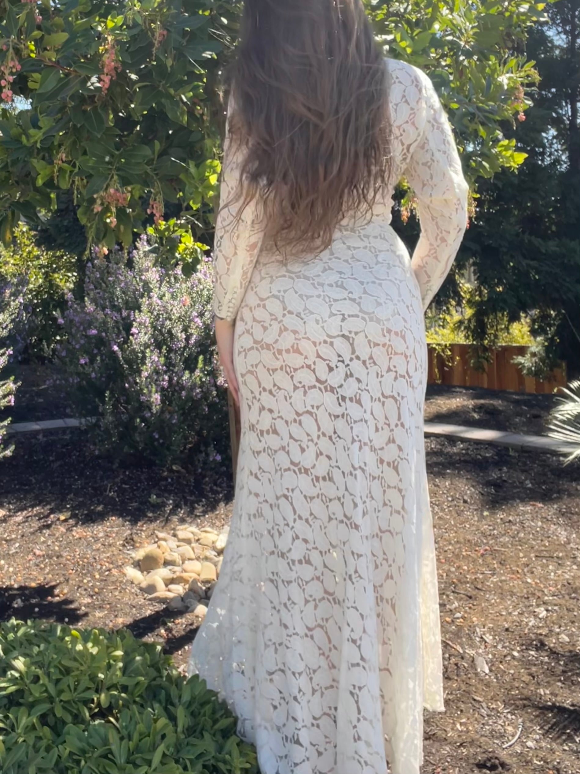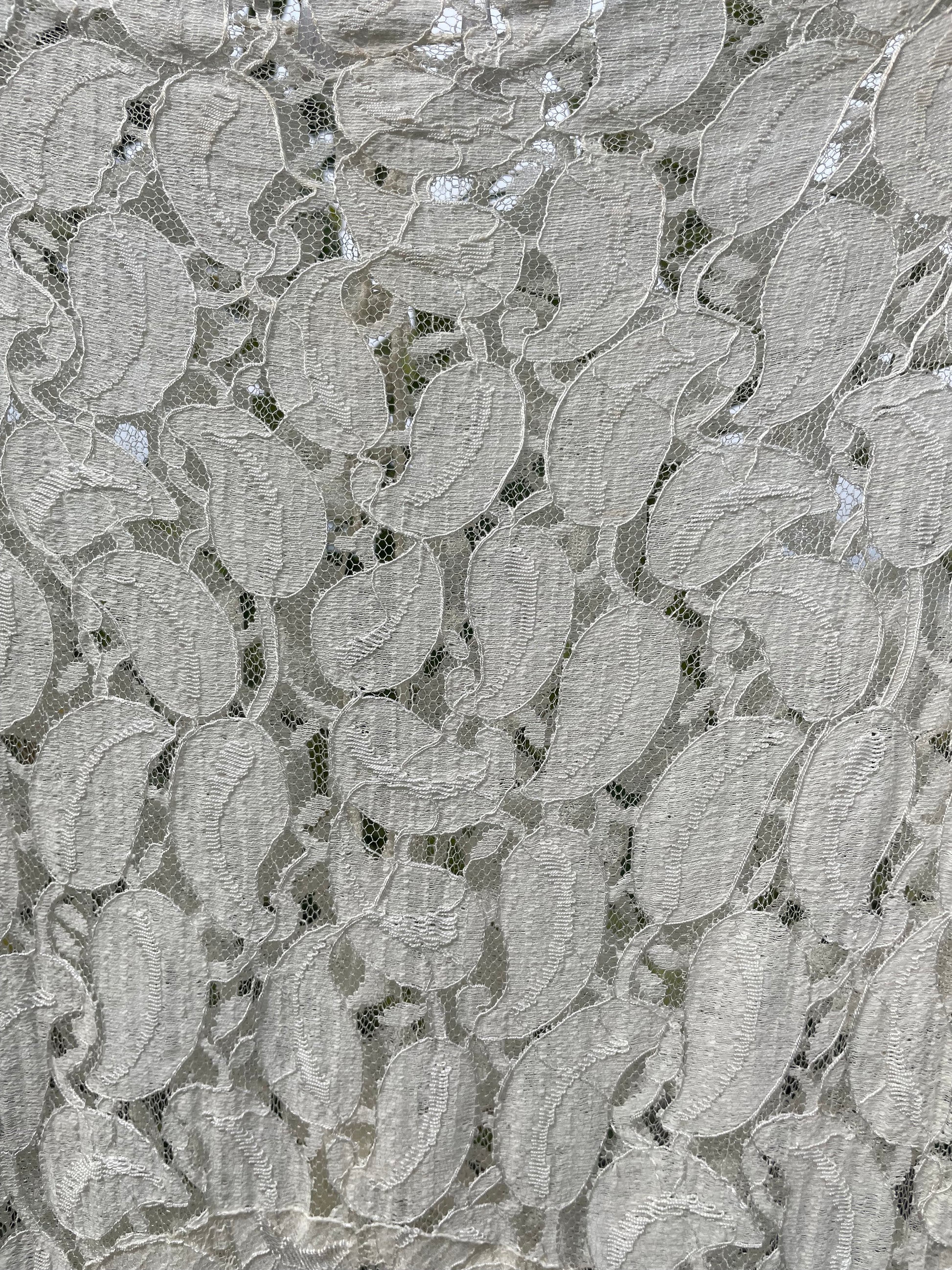 Stunning and classic 1930s bridal gown made of an eggshell lace. Features a sweeping neckline that skims the collar bones and shoulders with long sleeves that have exaggerated shoulder points, as well as deco seaming. Fabric covered buttons at the nape of back neck down to a small keyhole, wrists have fabric covered buttons as well to be able to get on and off easier. Lace breathes and stretches with ease. Wear for your special day or for any occasion