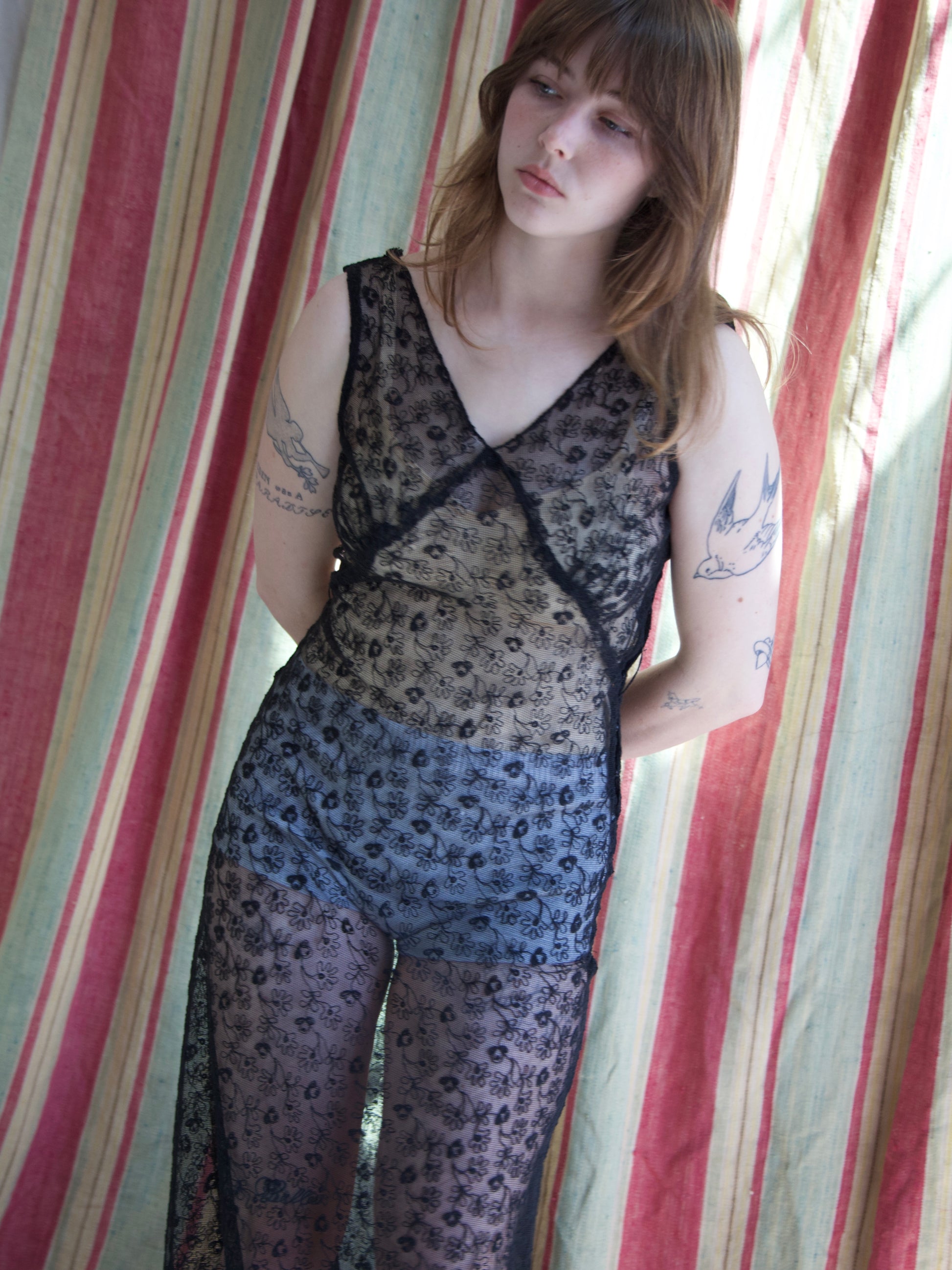 1930s inky black embroidered net dress with low, cross-over style back, and V neckline. Snaps at side seam with a full skirt