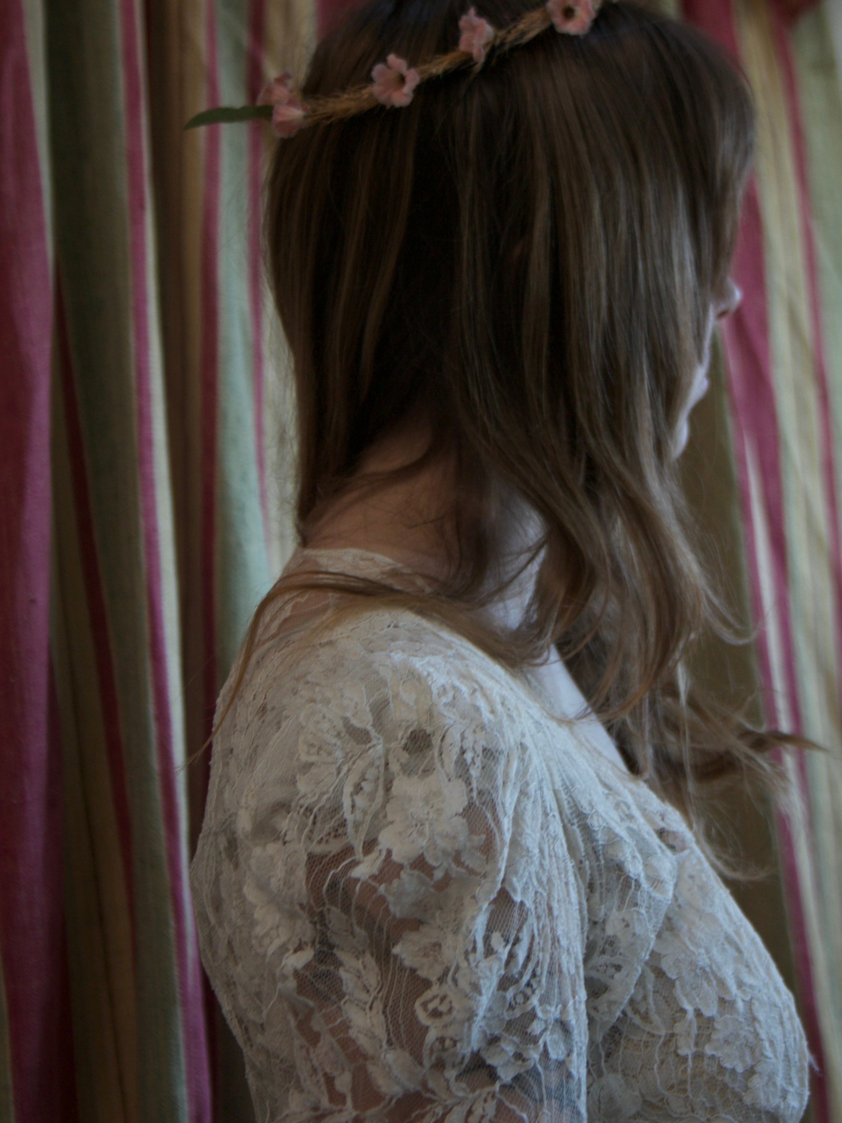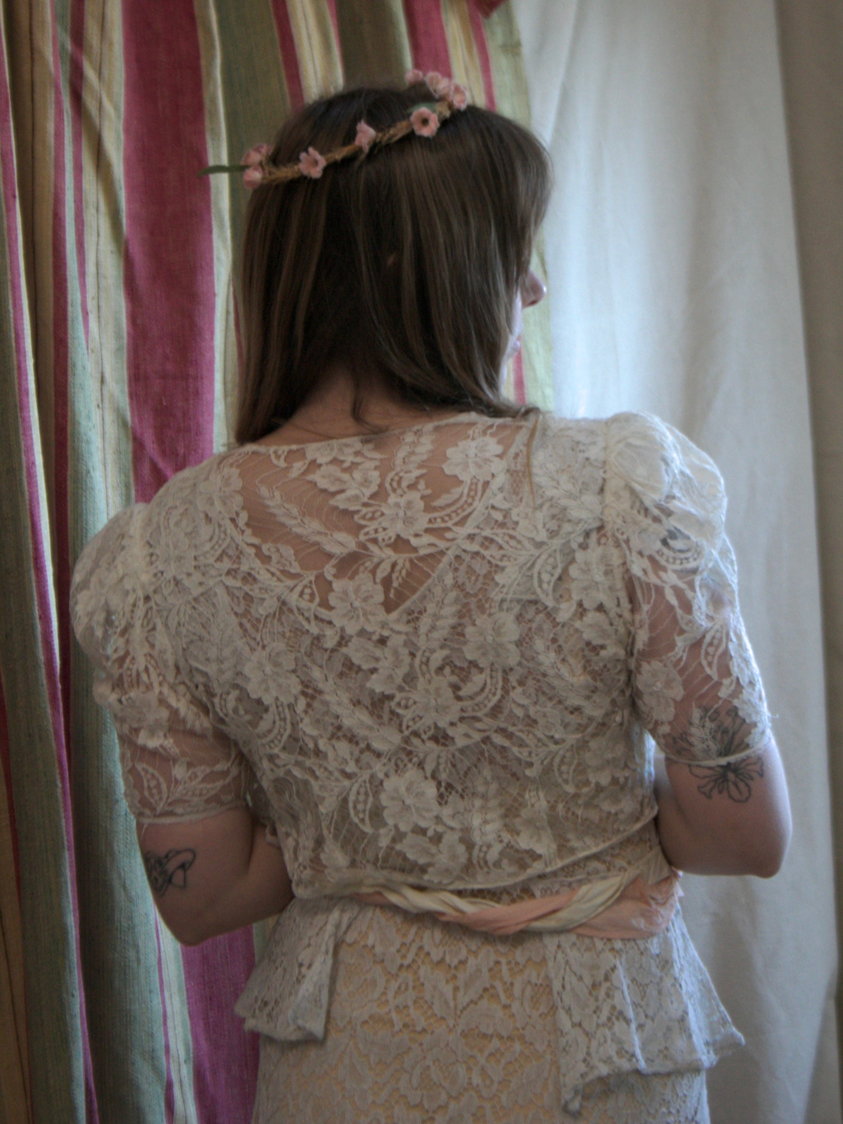 Late 1930s ivory lace cropped bolero with padded puff sleeves, and open front.