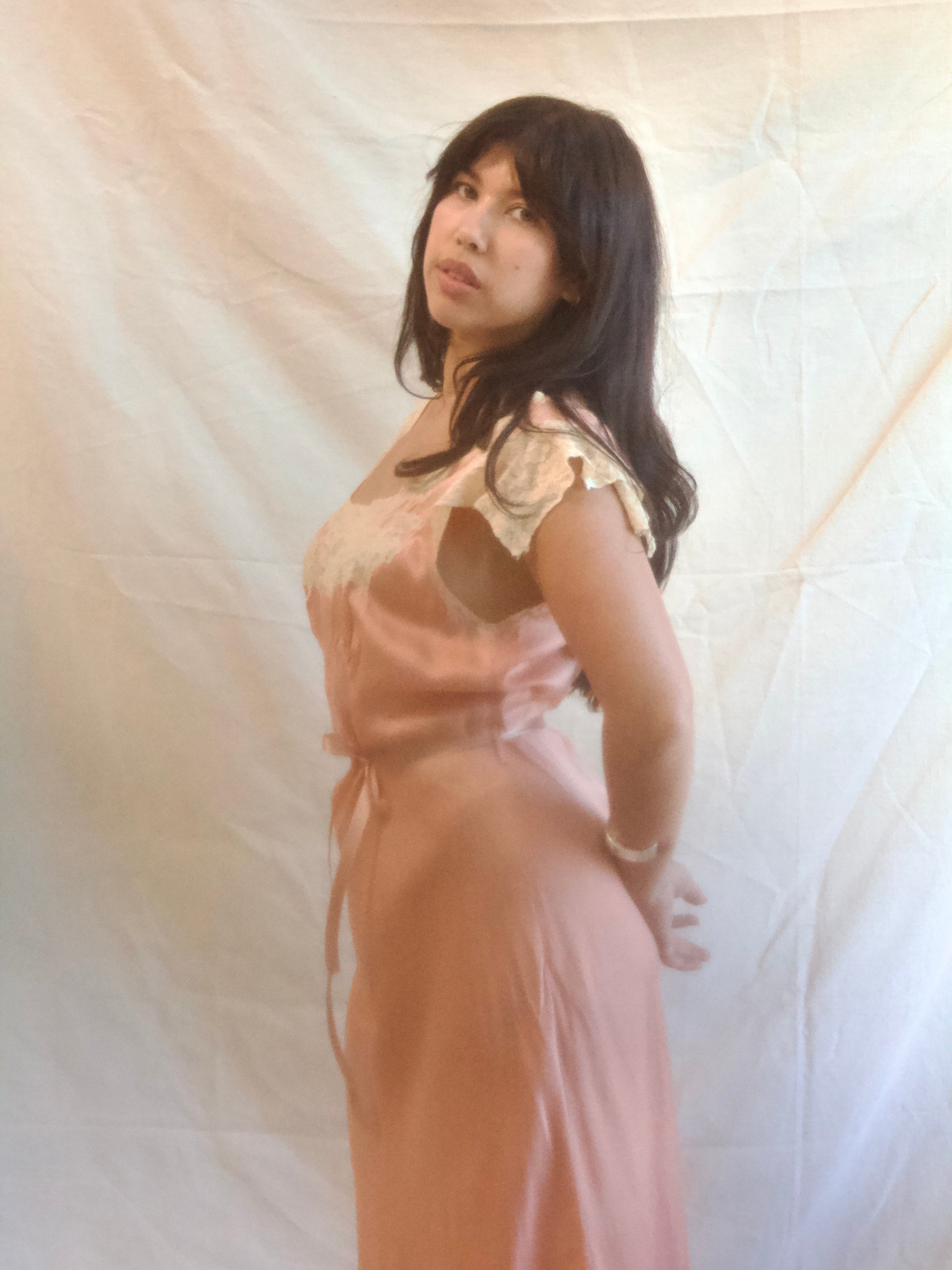 Truly stunning 1930s salmon pink bias cut silk slip dress with lace trim and cap sleeves. Comes with the original brained belt ( was lost in translation to the photoshoot and therefore not shown on model, but pictured in third photo.)