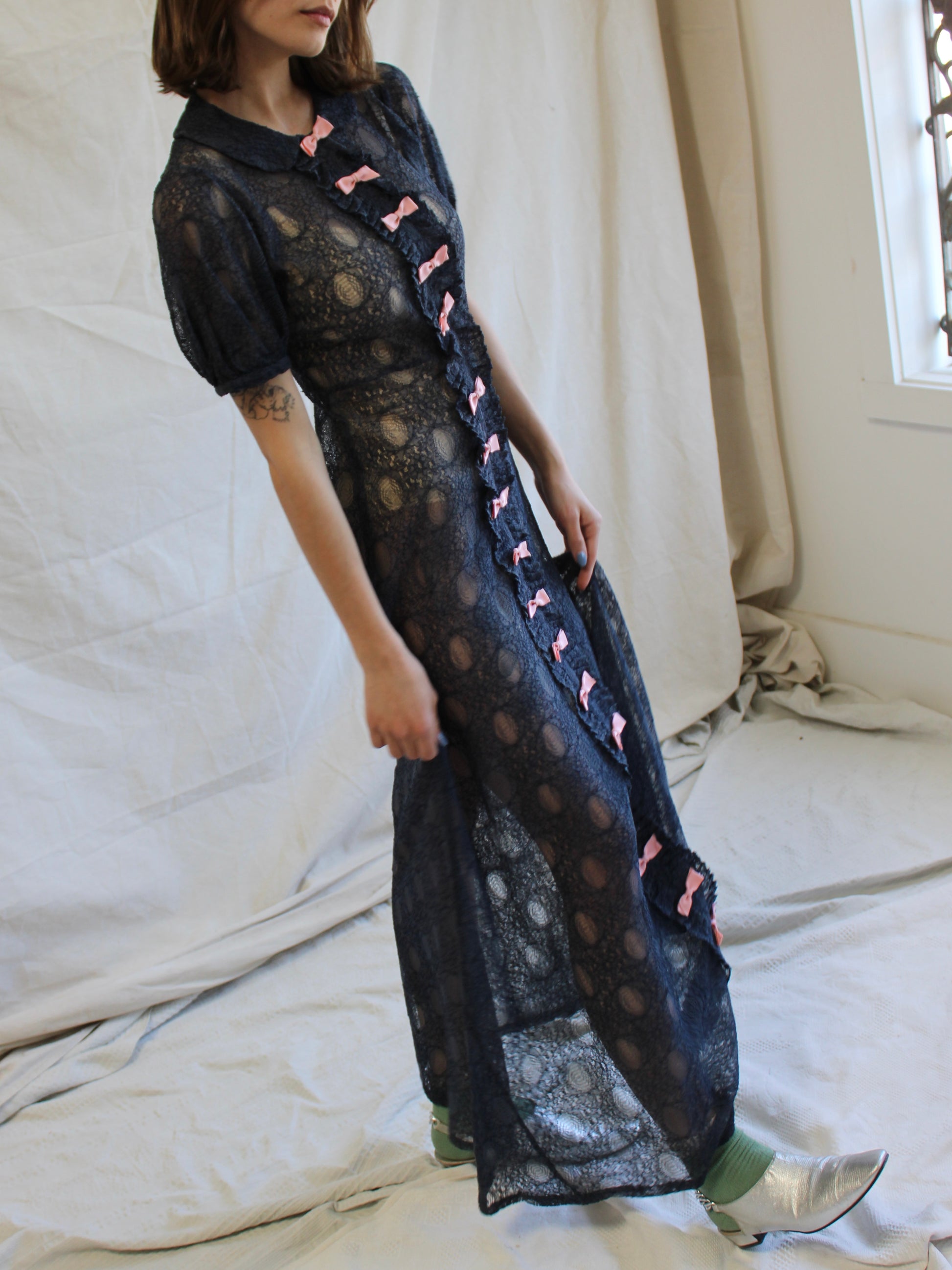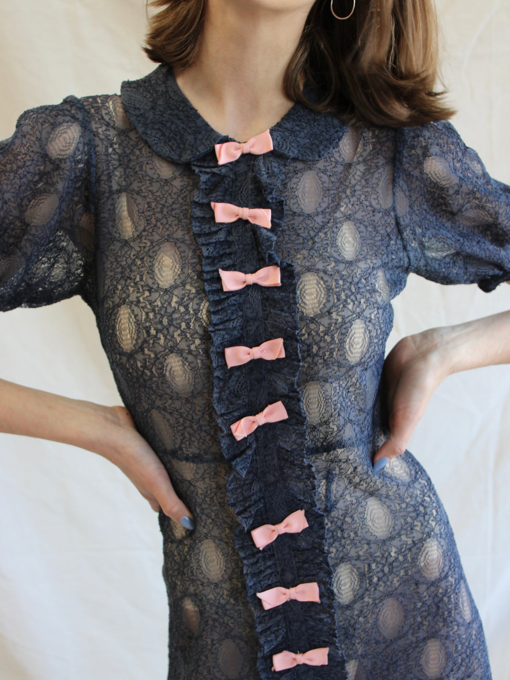 Incredible 1930s deep navy blue embroidered net floor length dress with contrasting pink bows down the length of the front of the dress. Puffed sleeves with a ruffle placket underneath bows ( non-functional just decorative.) Pulls on over head with no side closures, only a snap closure at neckline