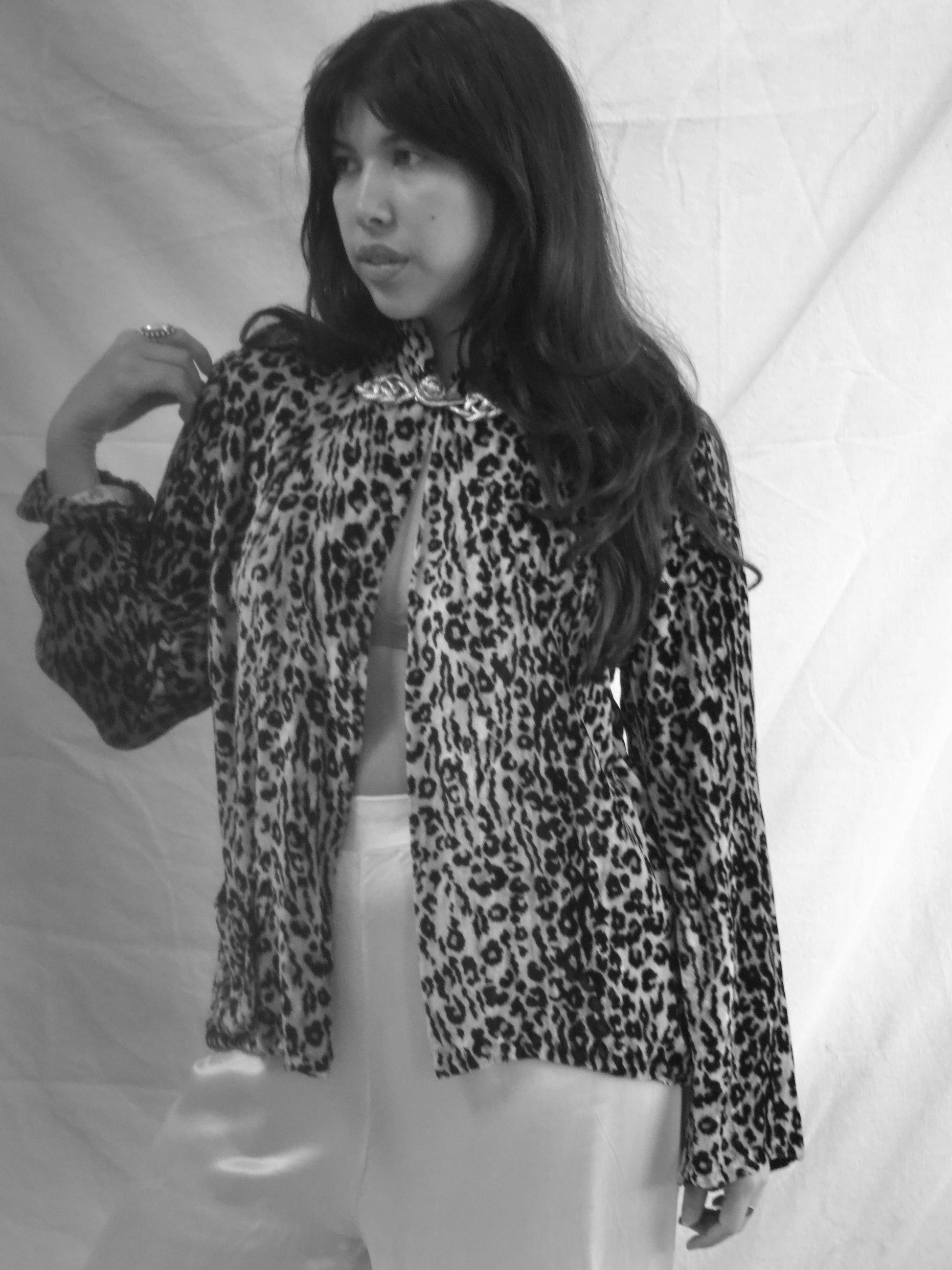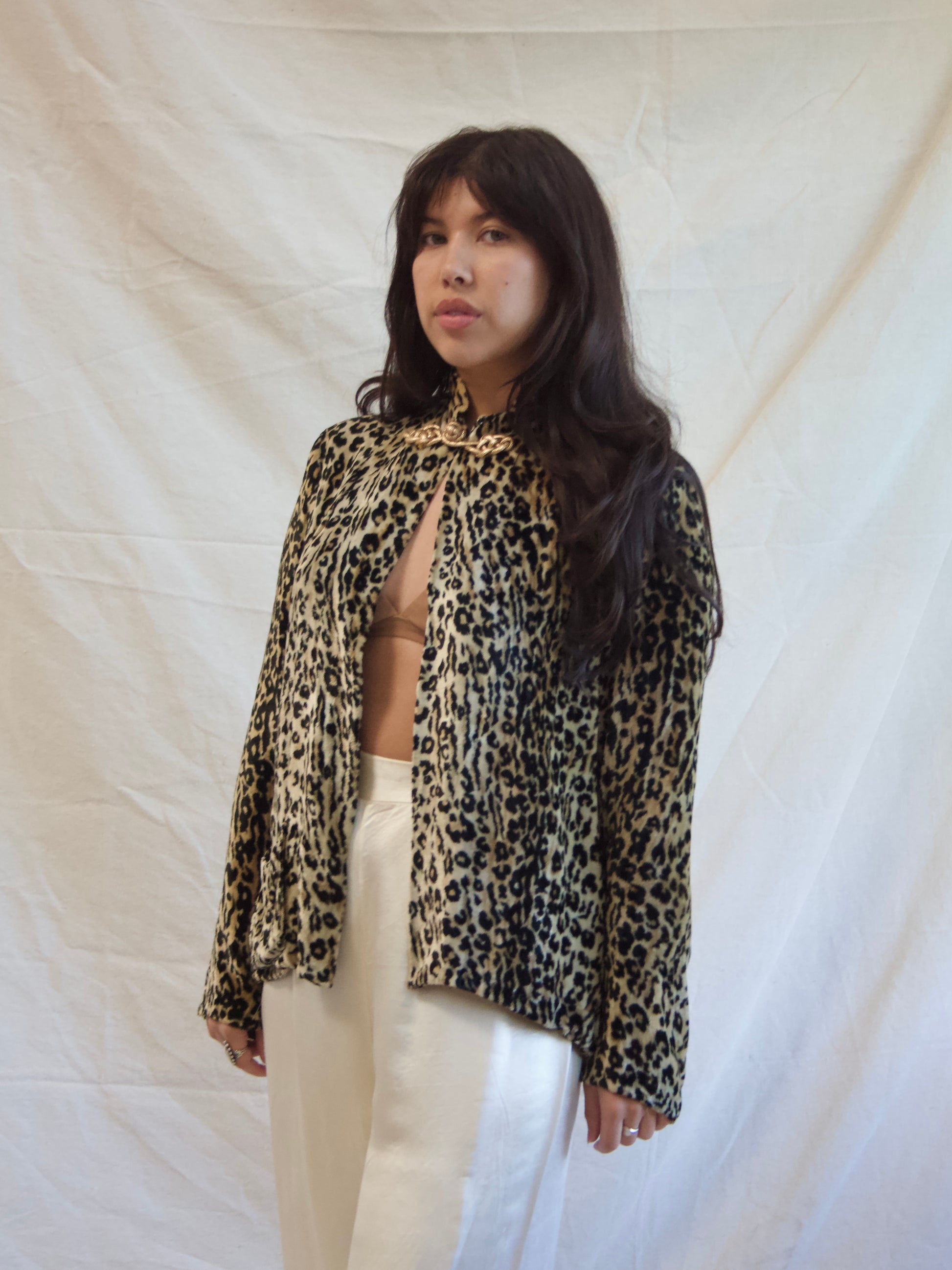 40s-50s leopard print plush velvet mandarin collar blouse with single lamé frog closure at the neckline and a single patch front pocket at the hem