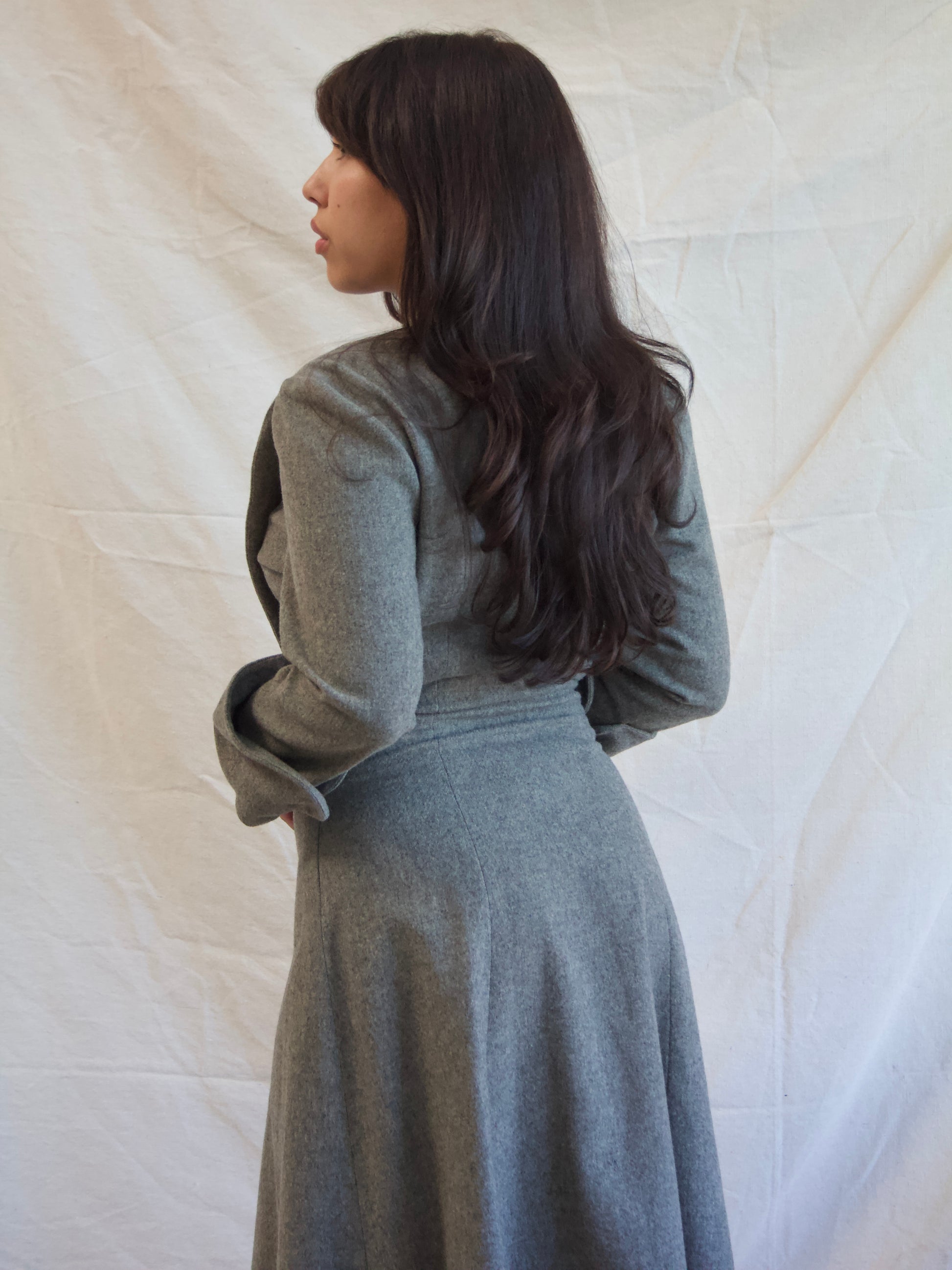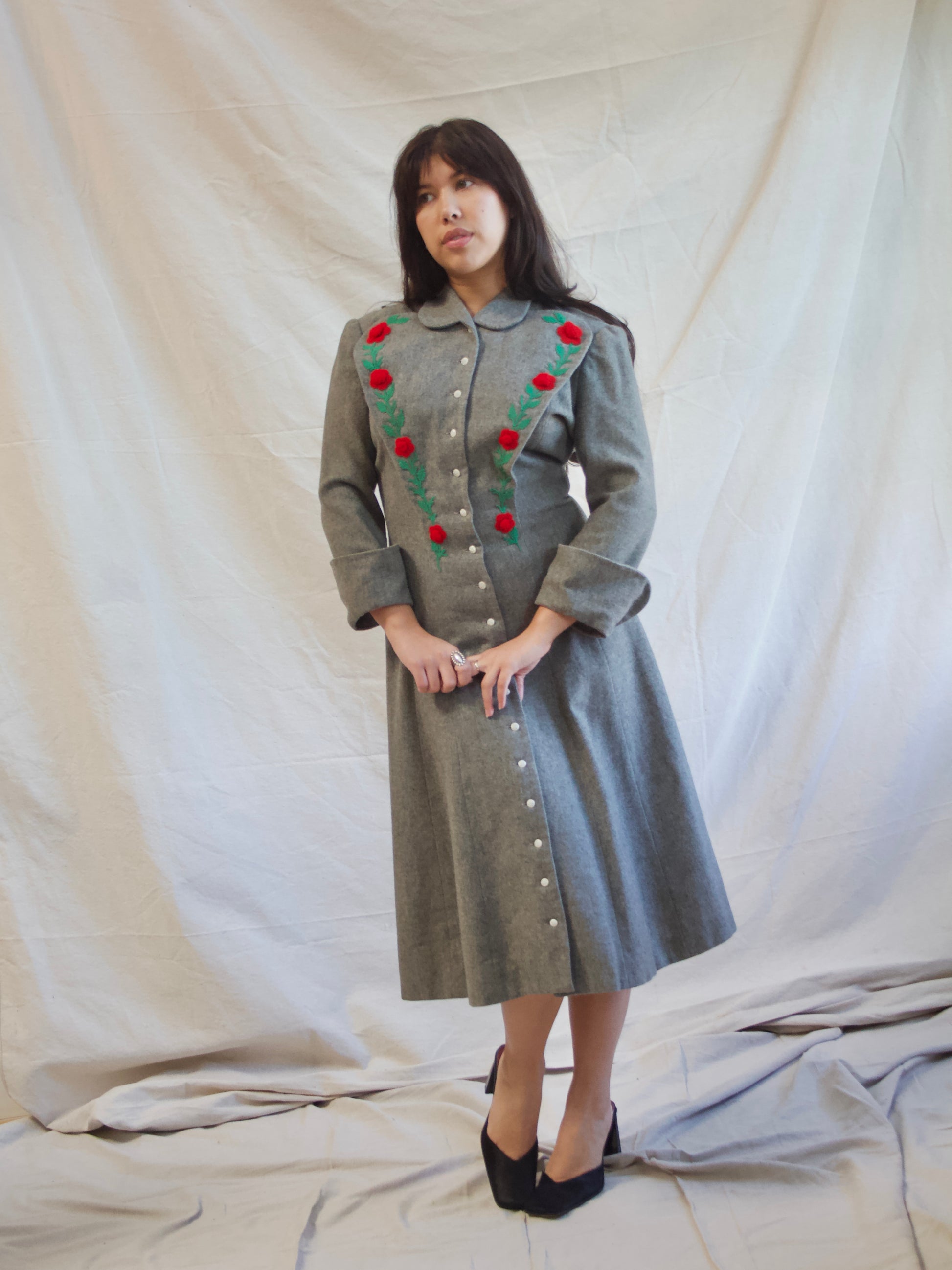 1940s 3D Rose and Embroidered Slate Grey Wool Button Front Dress