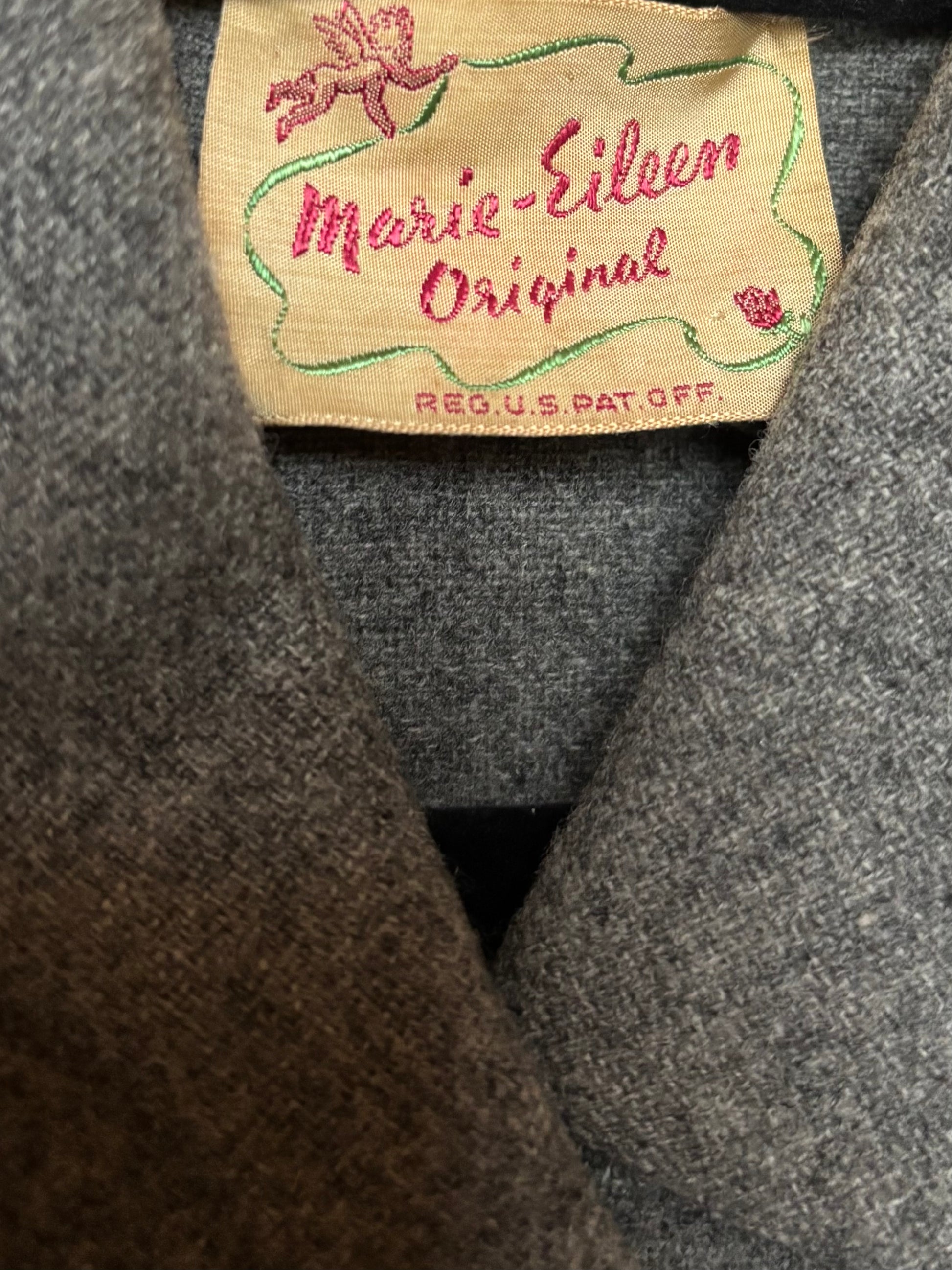 Stunning ‘Marie-Eileen Original’ 1940s slate grey wool fit 'n flare style dress with tiny pearlescent buttons down the entire center front, with 3/4 length sleeves and beautiful 3D yarn roses and chain stitched stems. Could be fully un-buttoned and worn like a jacket as well