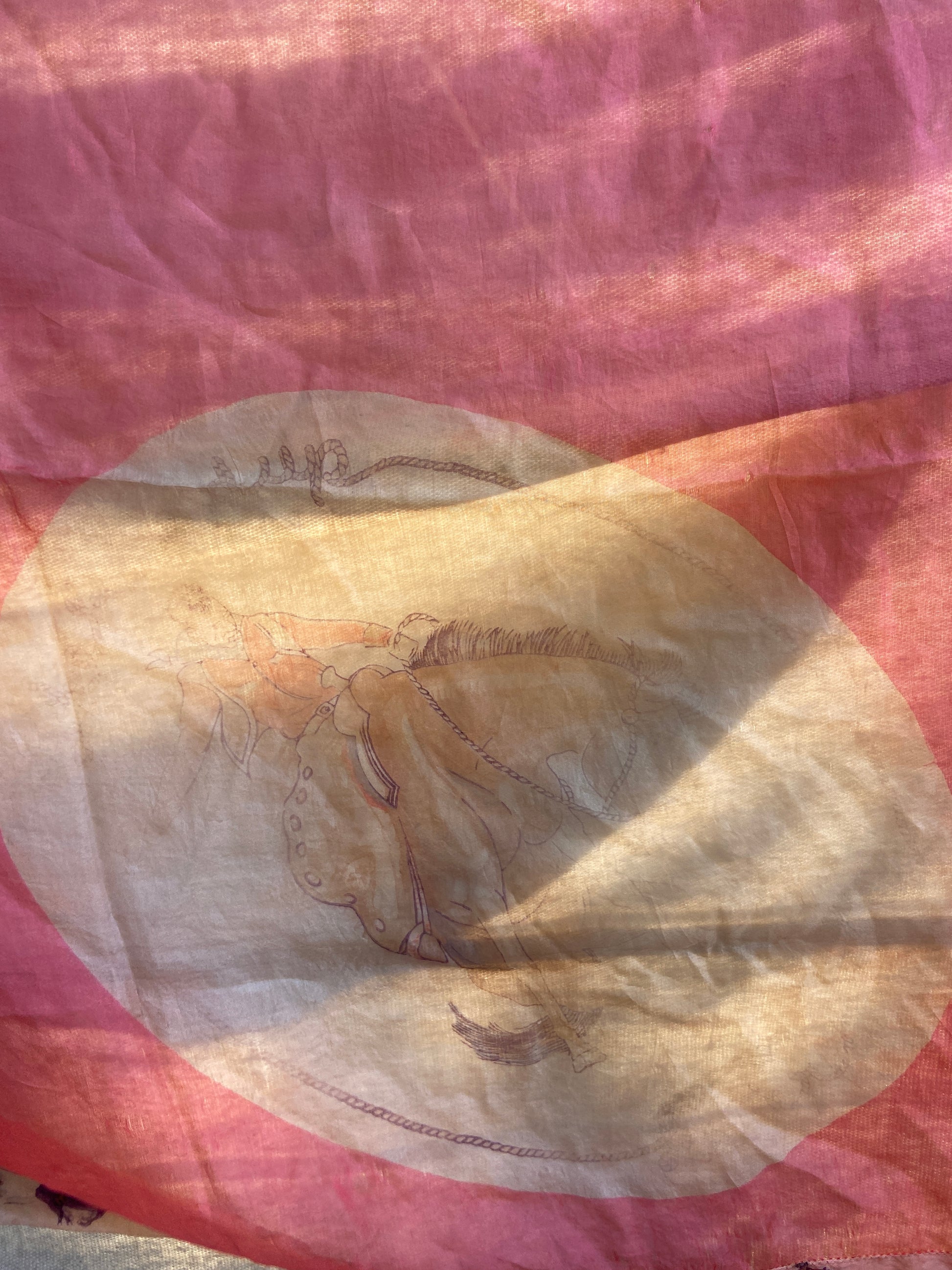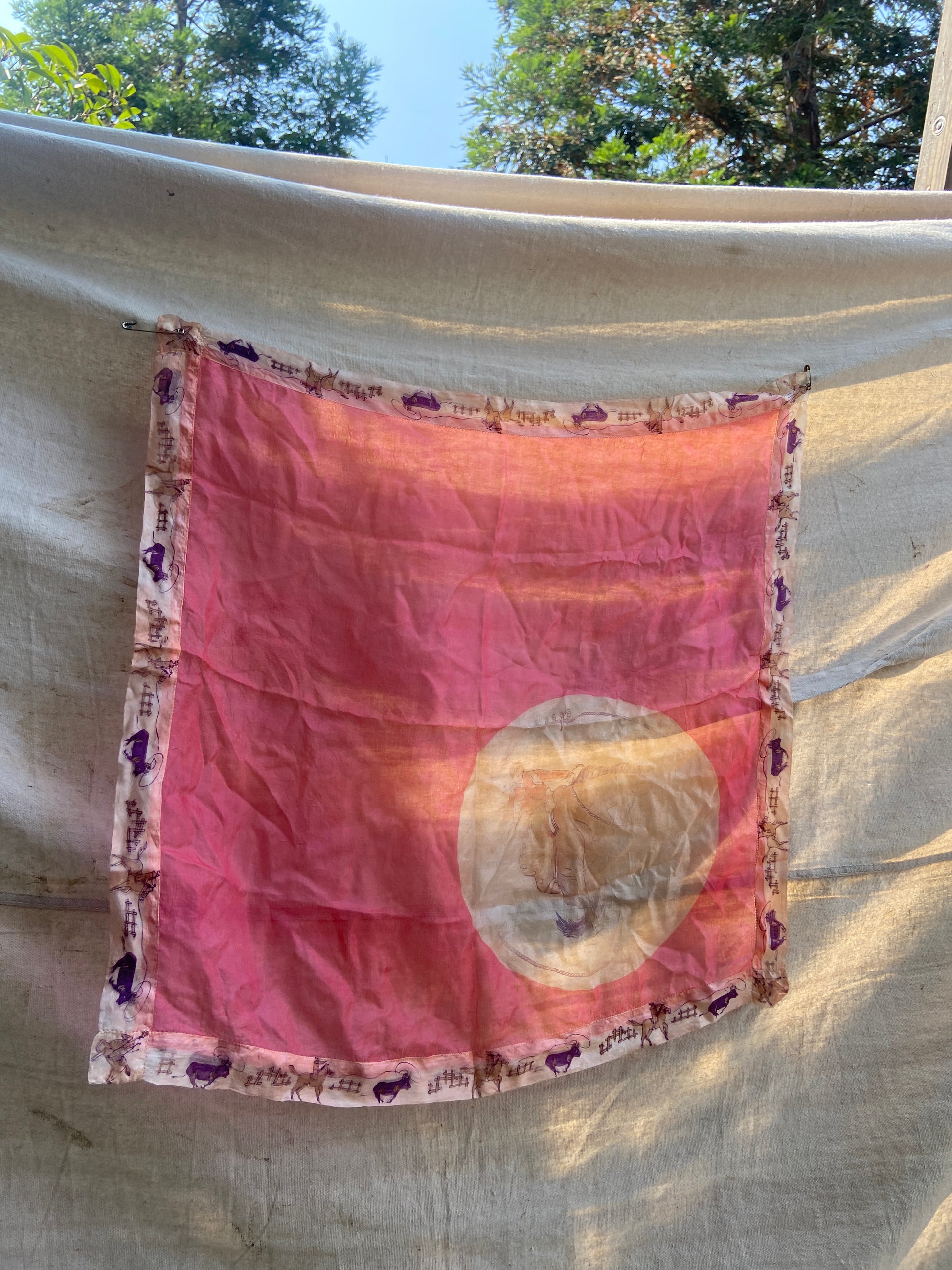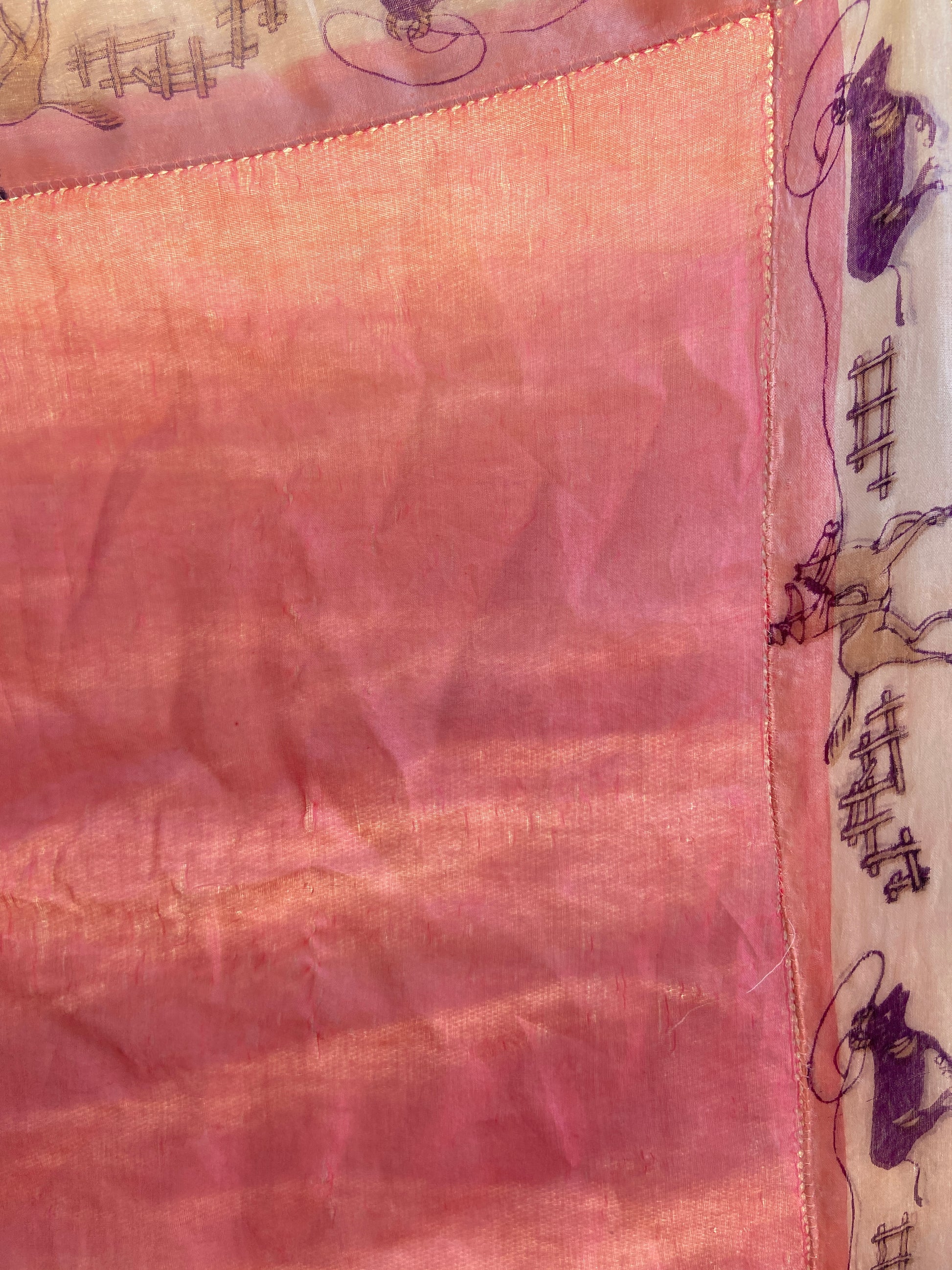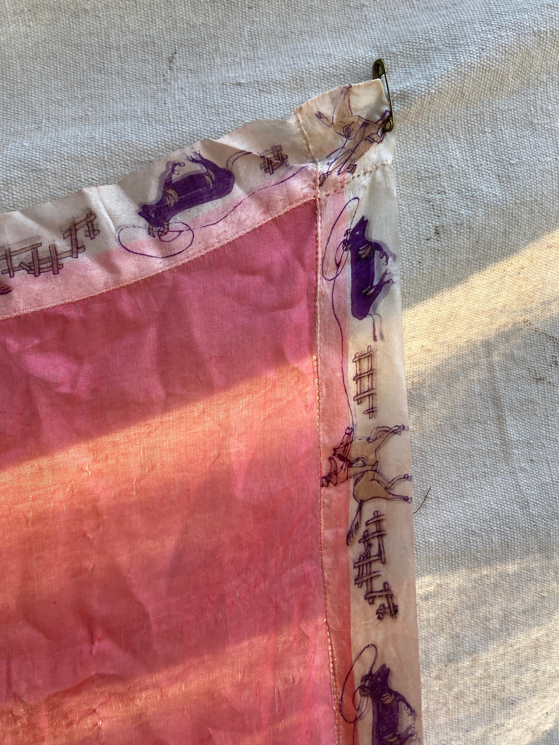 Faded to perfection, mid century 'Pendleton Round Up' souvenir silk scarf. Features a print of a bucking cowboy with faded writing " Ride Em Cowboy" and 'The Round Up"