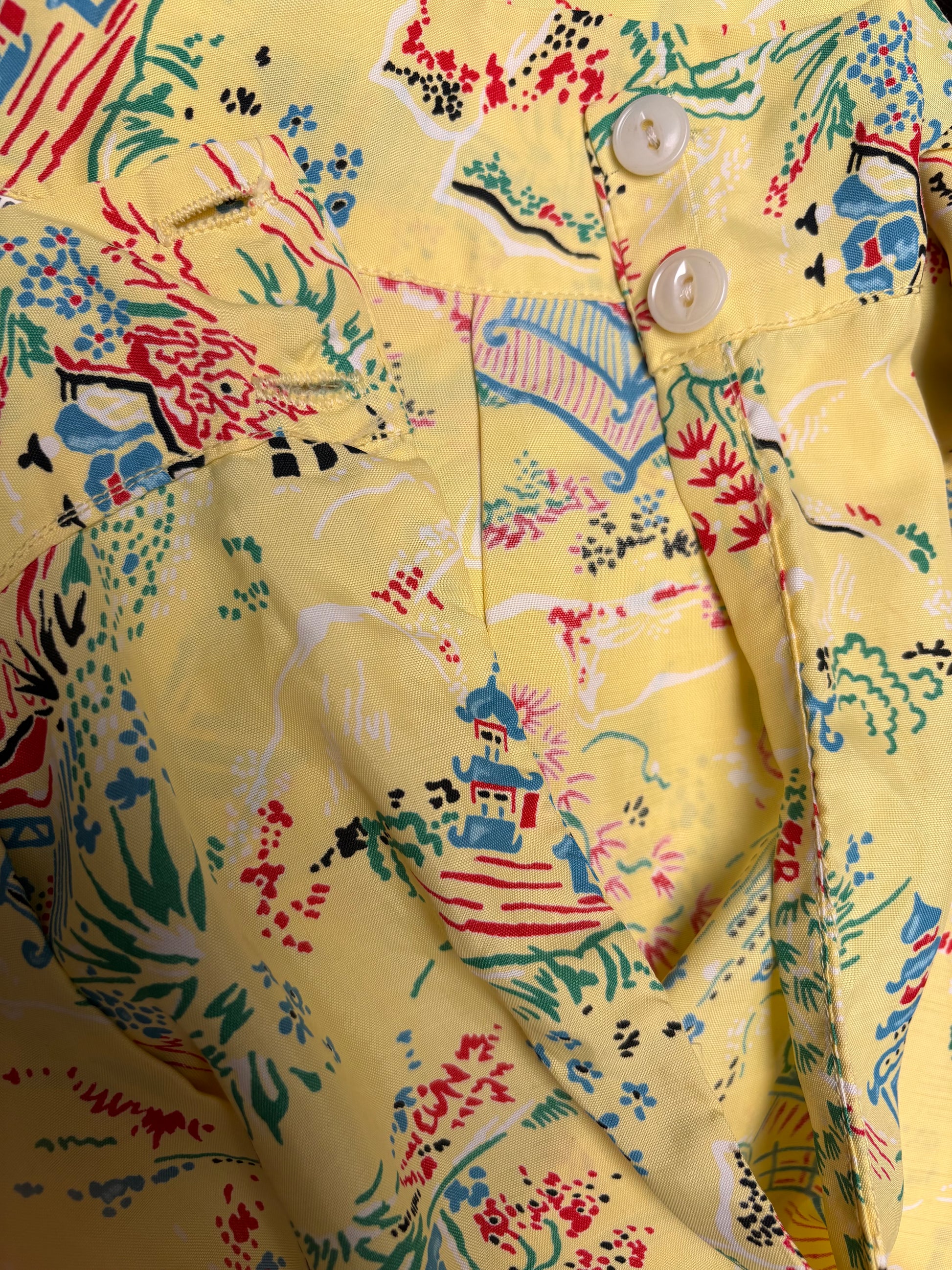1940s side button novelty Asian print lemon yellpw rayon wide leg pants. Look great worn at high waist as well as lower on the waist