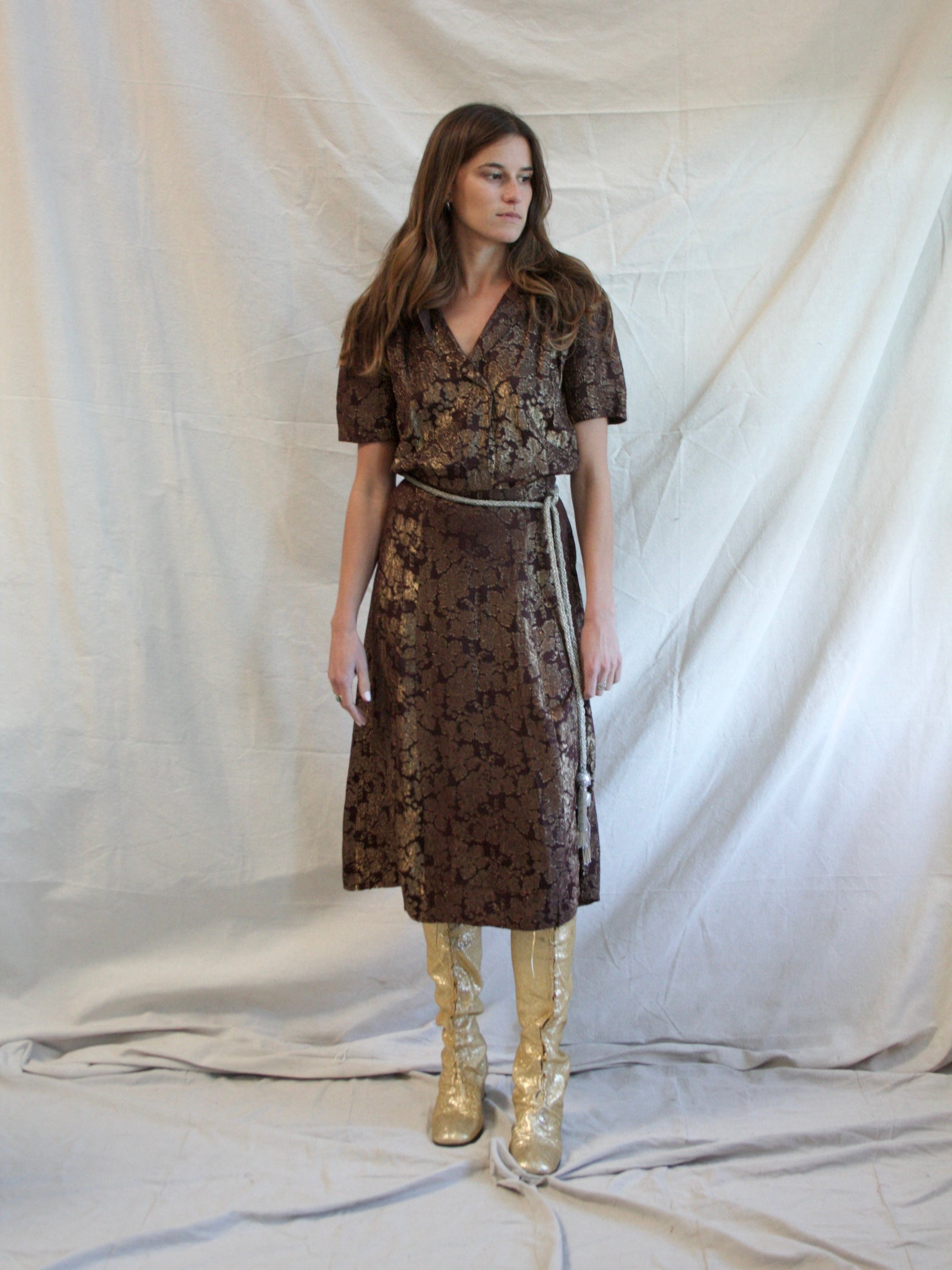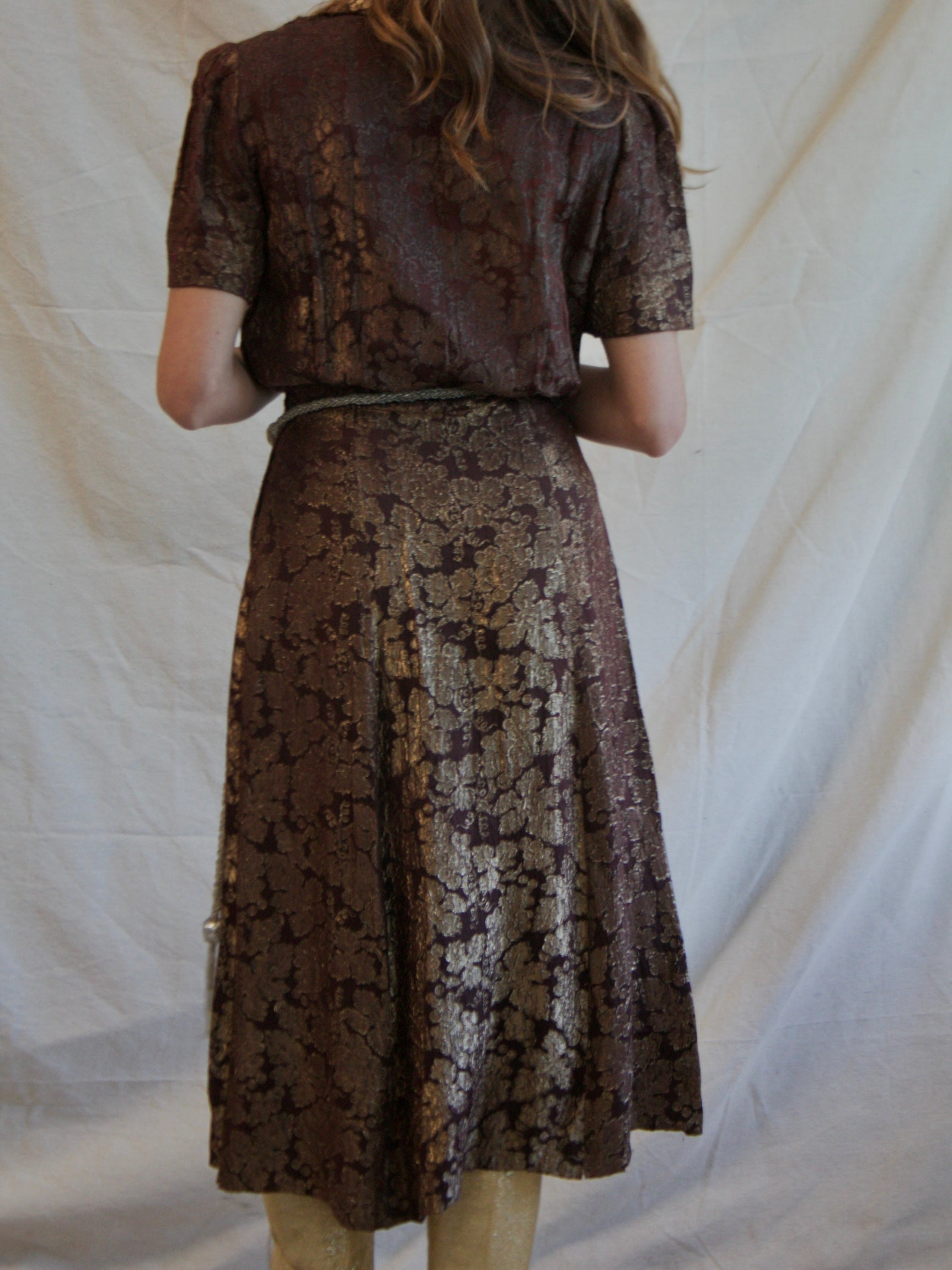 1940s Puff Sleeve Chocolate & Gold Lamé Dress