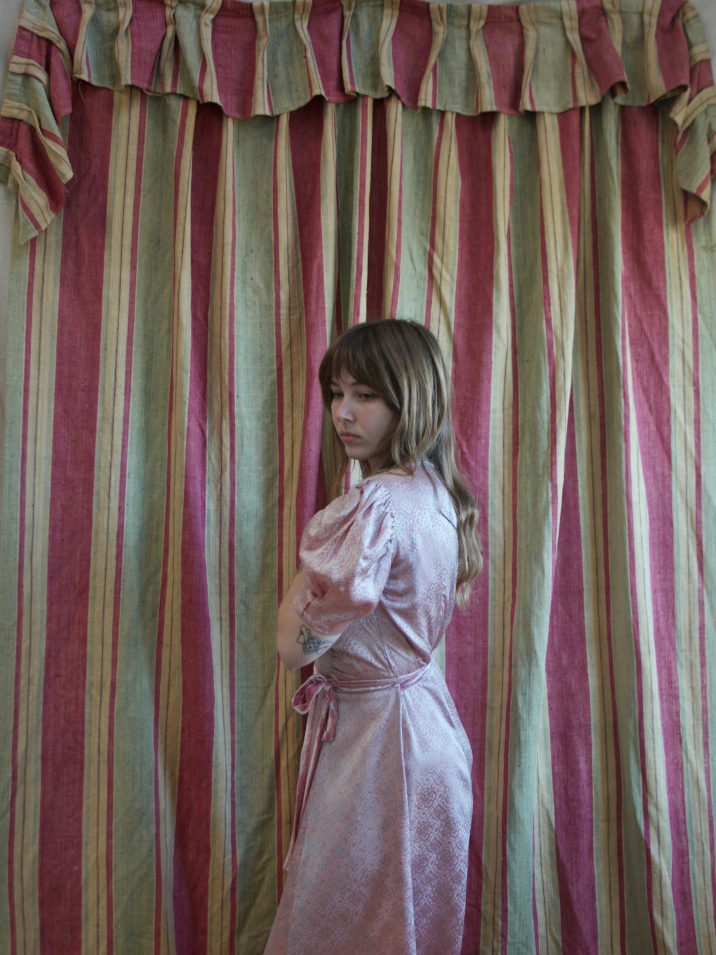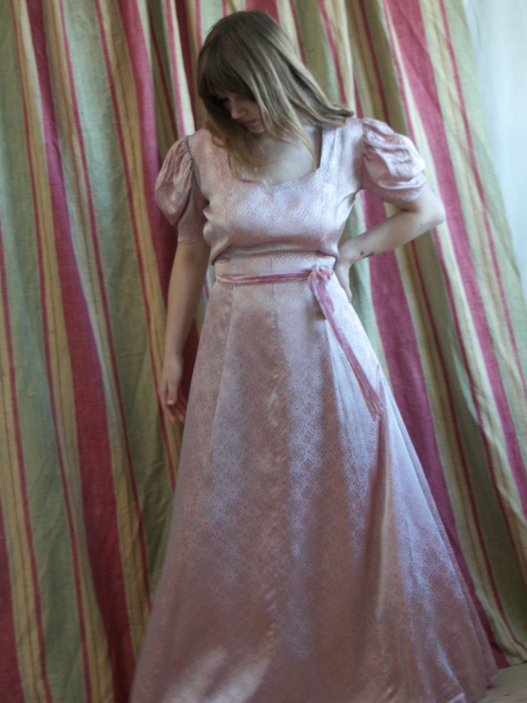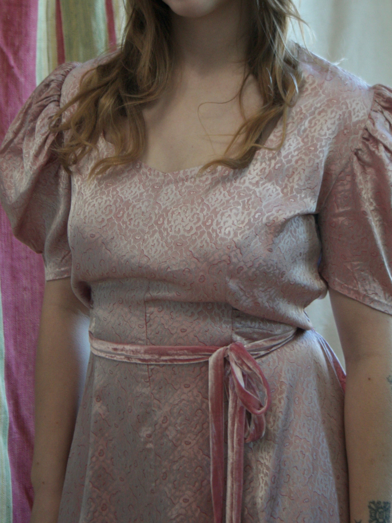 1930s-1940s mauve-pink printed rayon satin dress with gathered puff sleeves, ruched bodice, and silk velvet waist ties. There are no closures on this dress, so you must be able to pull on over head and allow at least 2 inches of wiggle room to get on.