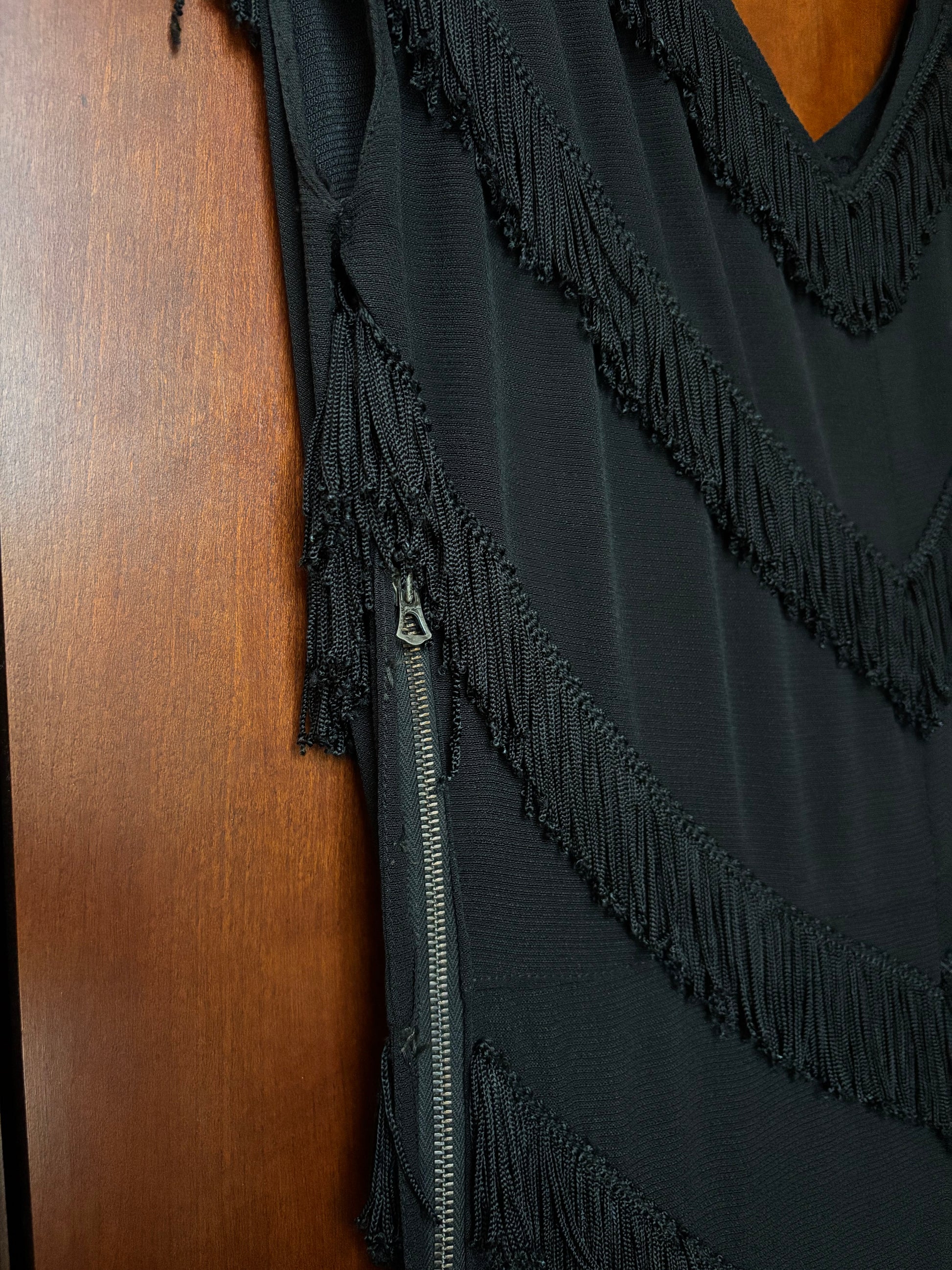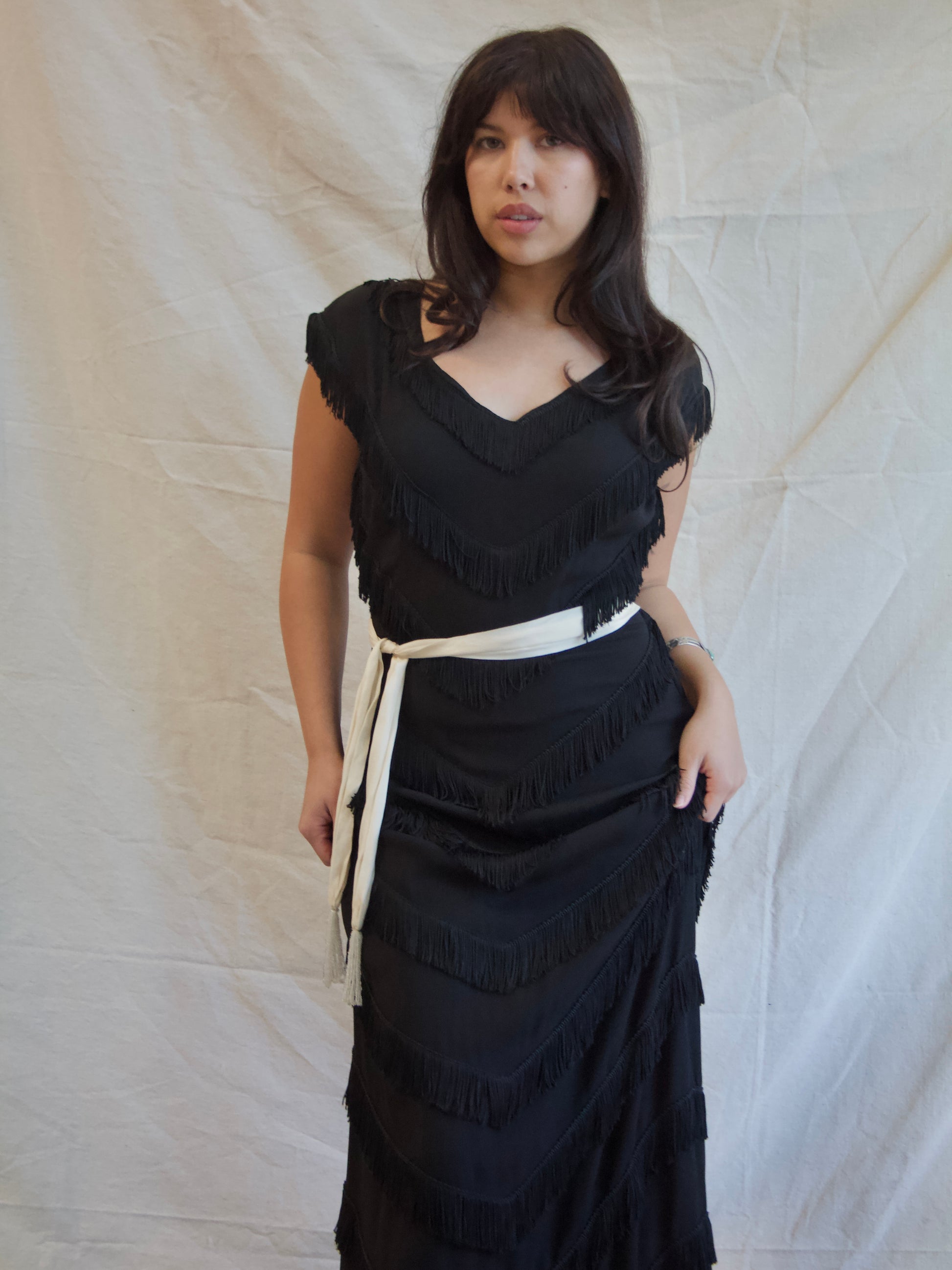 Stunning 1930s/1940s 'Bette Frances San Francisco' inky black rayon crepe fringe gown with slight train. Side seam bell zipper with hook and eye at side bust.