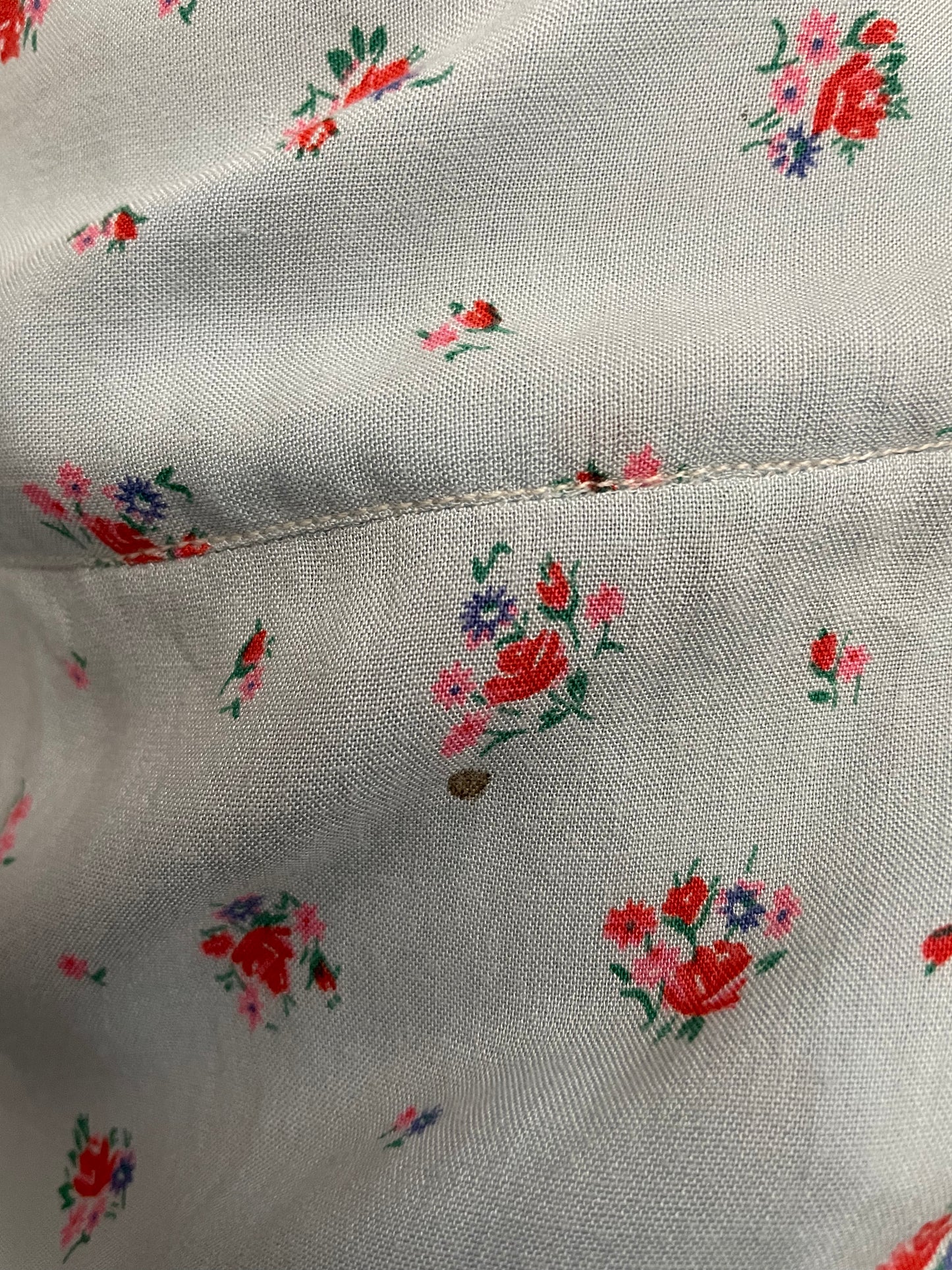 Condition: Good; discoloration mark on sleeve hems as shown that is somewhat camouflaged by the print, markings back near hem and small spot upper back