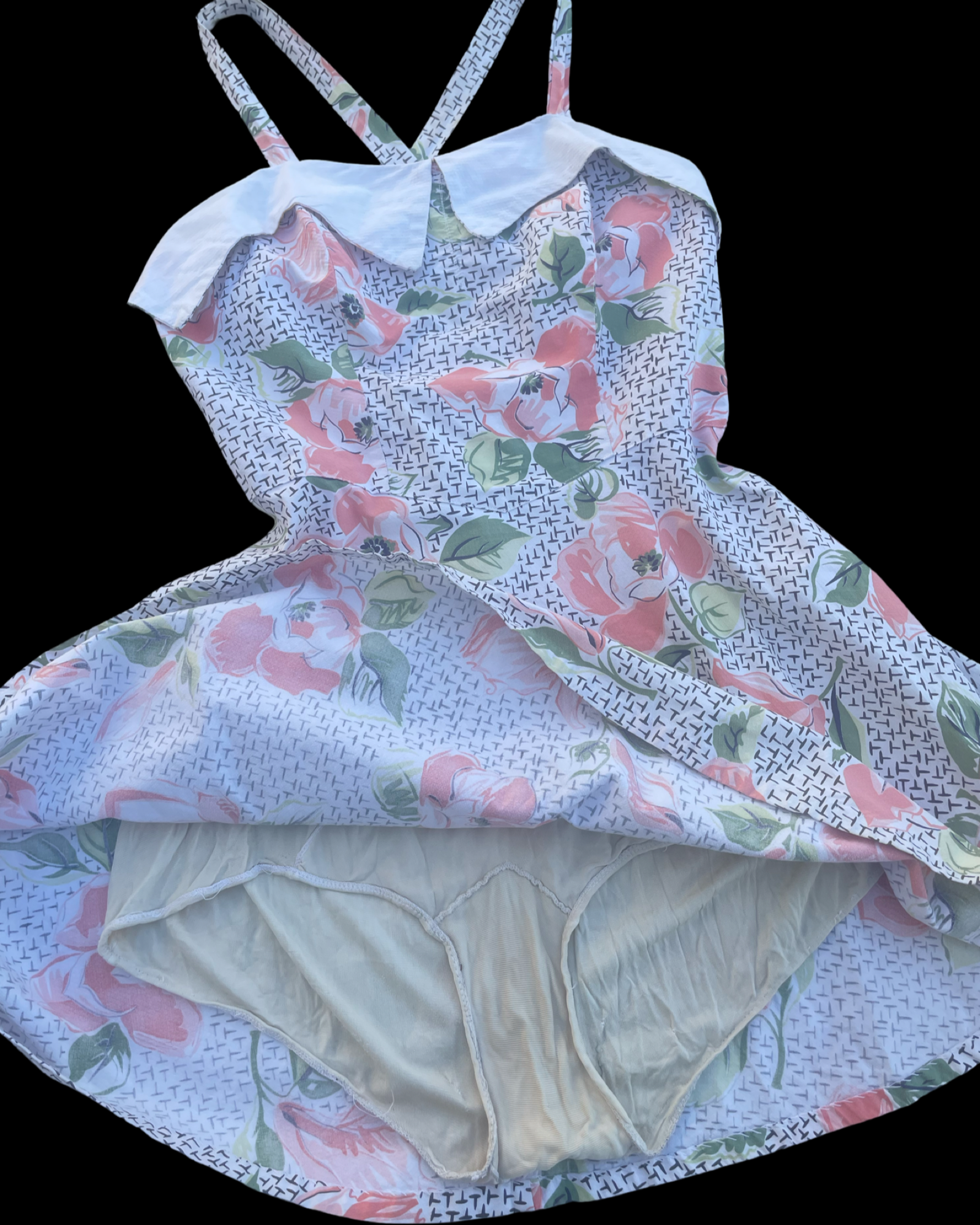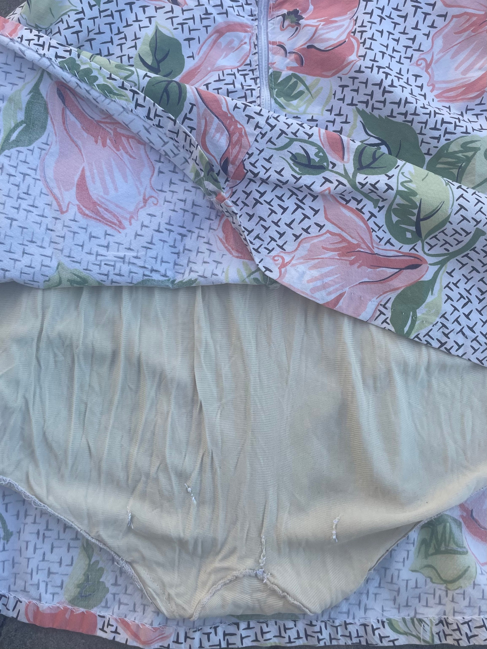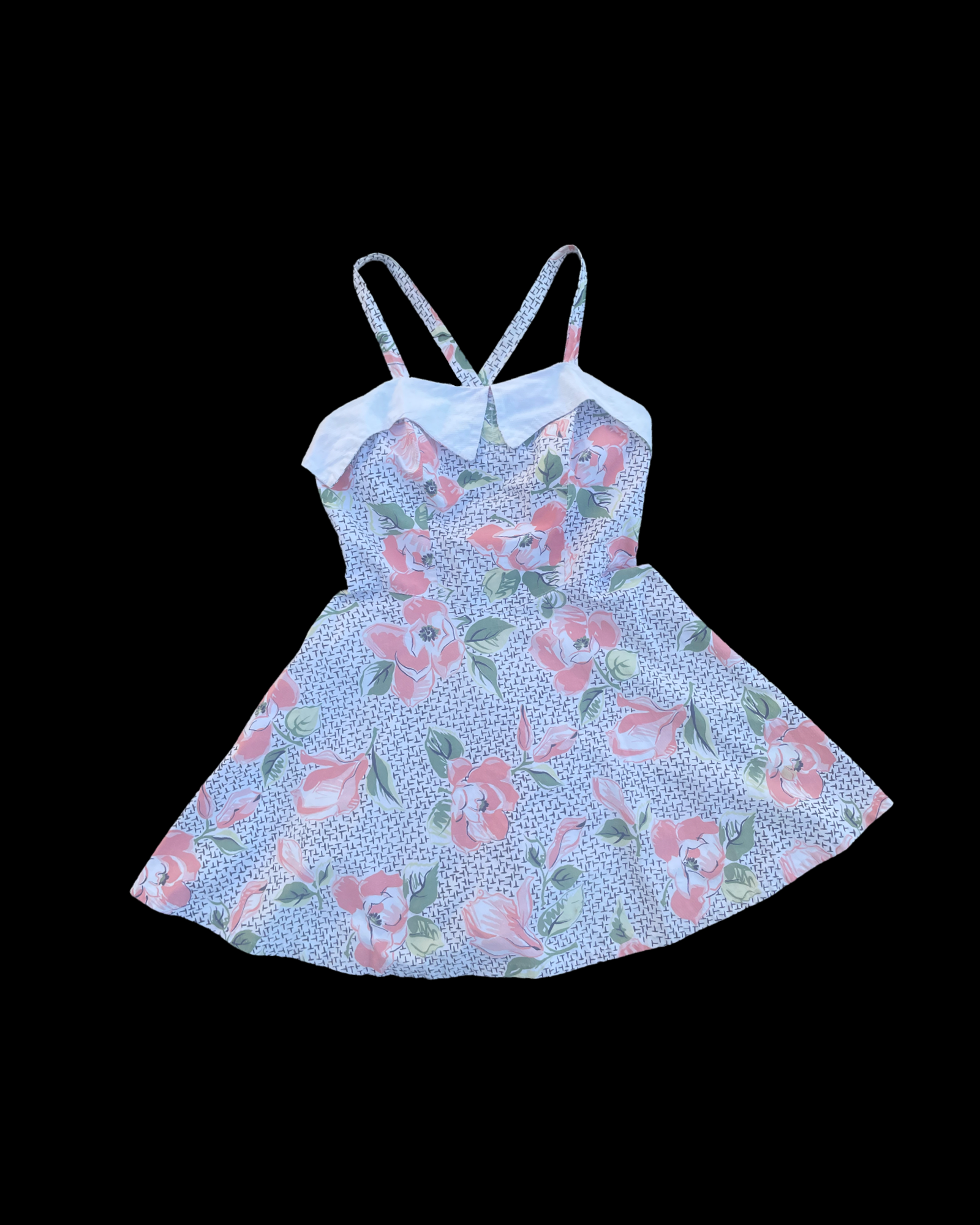 Incredibly stunning Spring/Summertime large scale stylized floral print cotton skirt playsuit with built in jersey knit bloomers. Cross style back with button closures and a metal zip up the center back