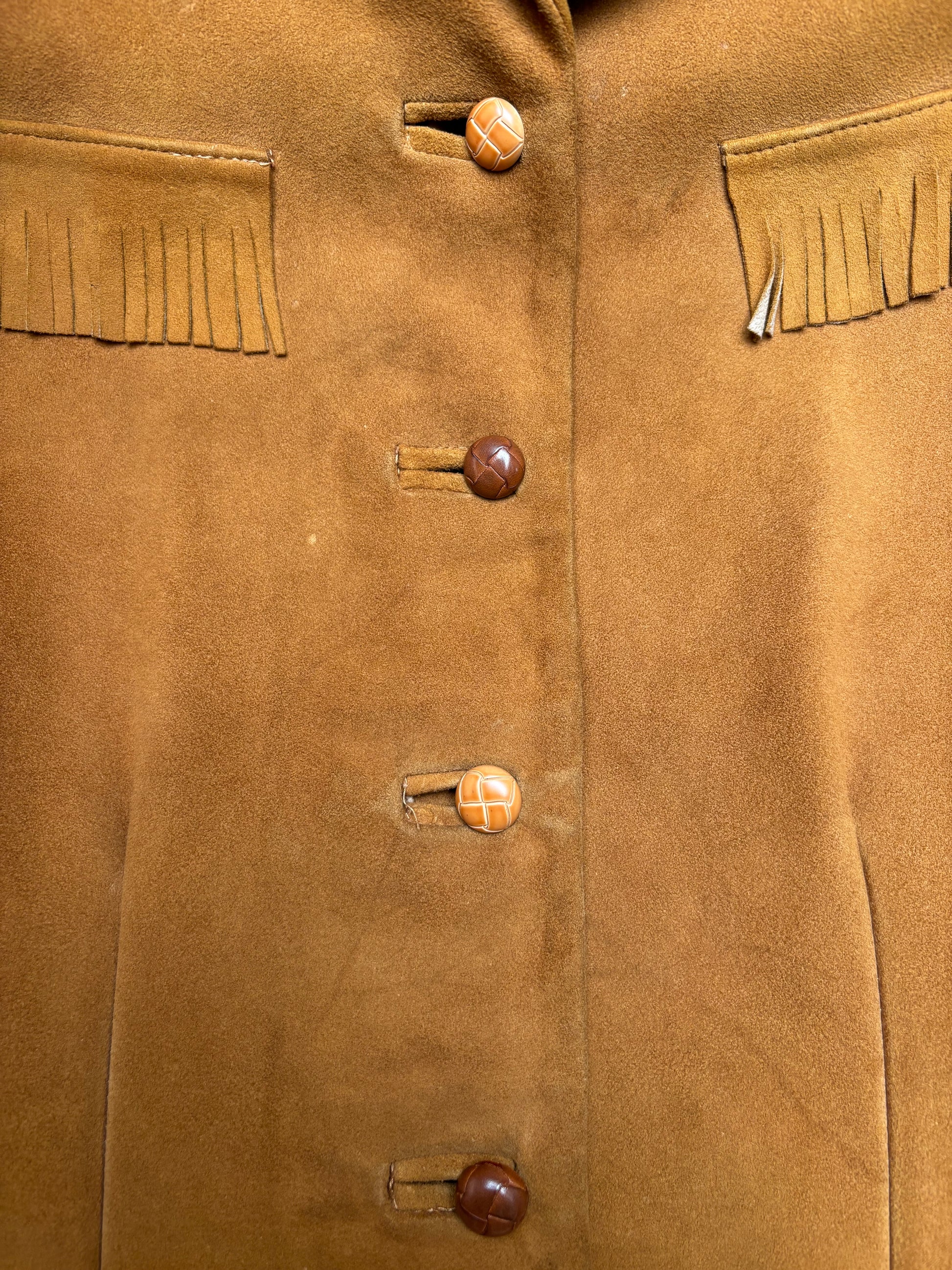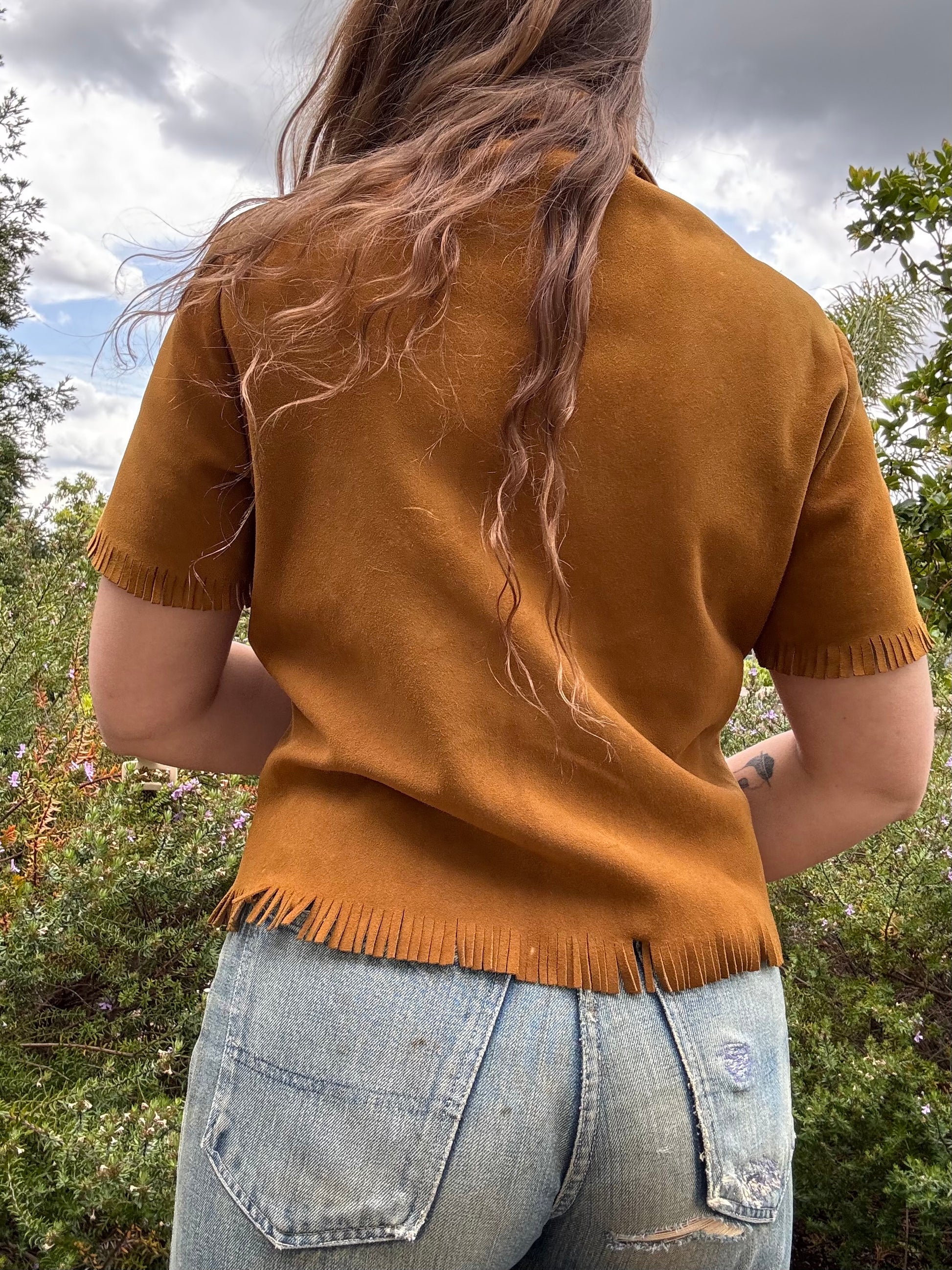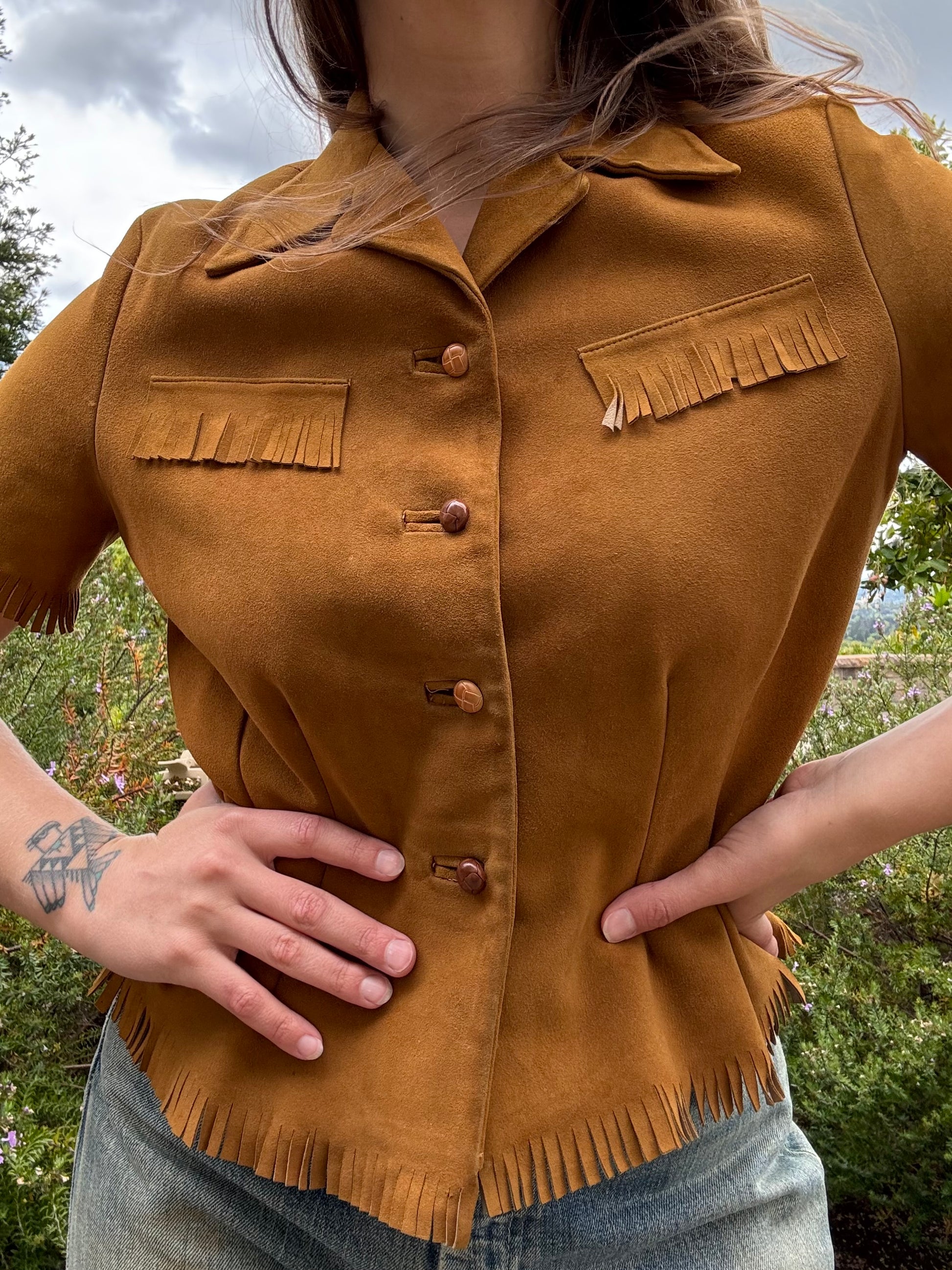 1940s carmel suede leather fringe trim western blouse with shank leather wrapped buttons down front, and faux breast pockets.