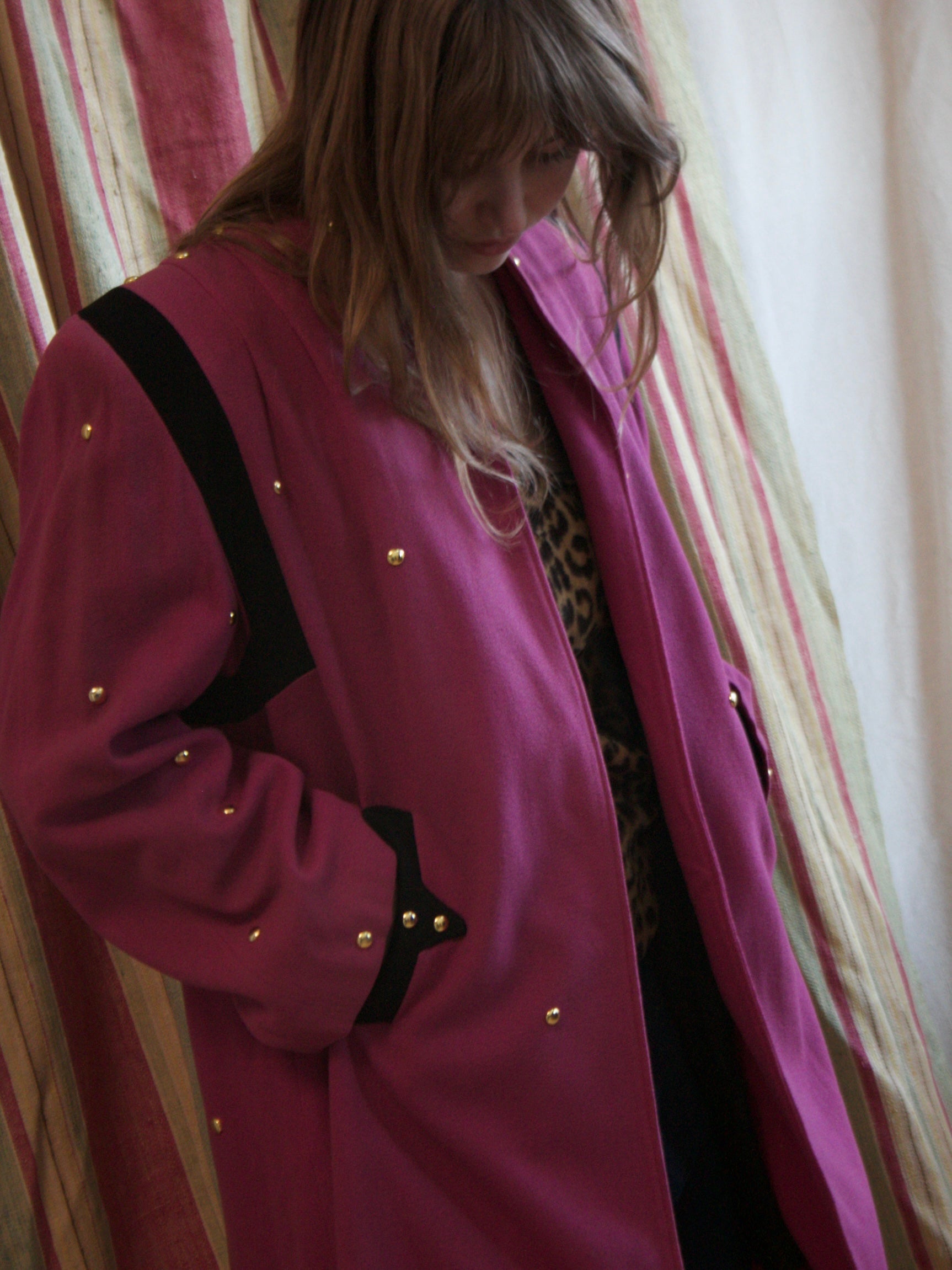Gorgeous 1940s color block vibrant fuchsia and inky black wool swing coat with strong shoulders, and slit front pockets. Open front with black rayon satin lining inside with "backpack straps" inside.