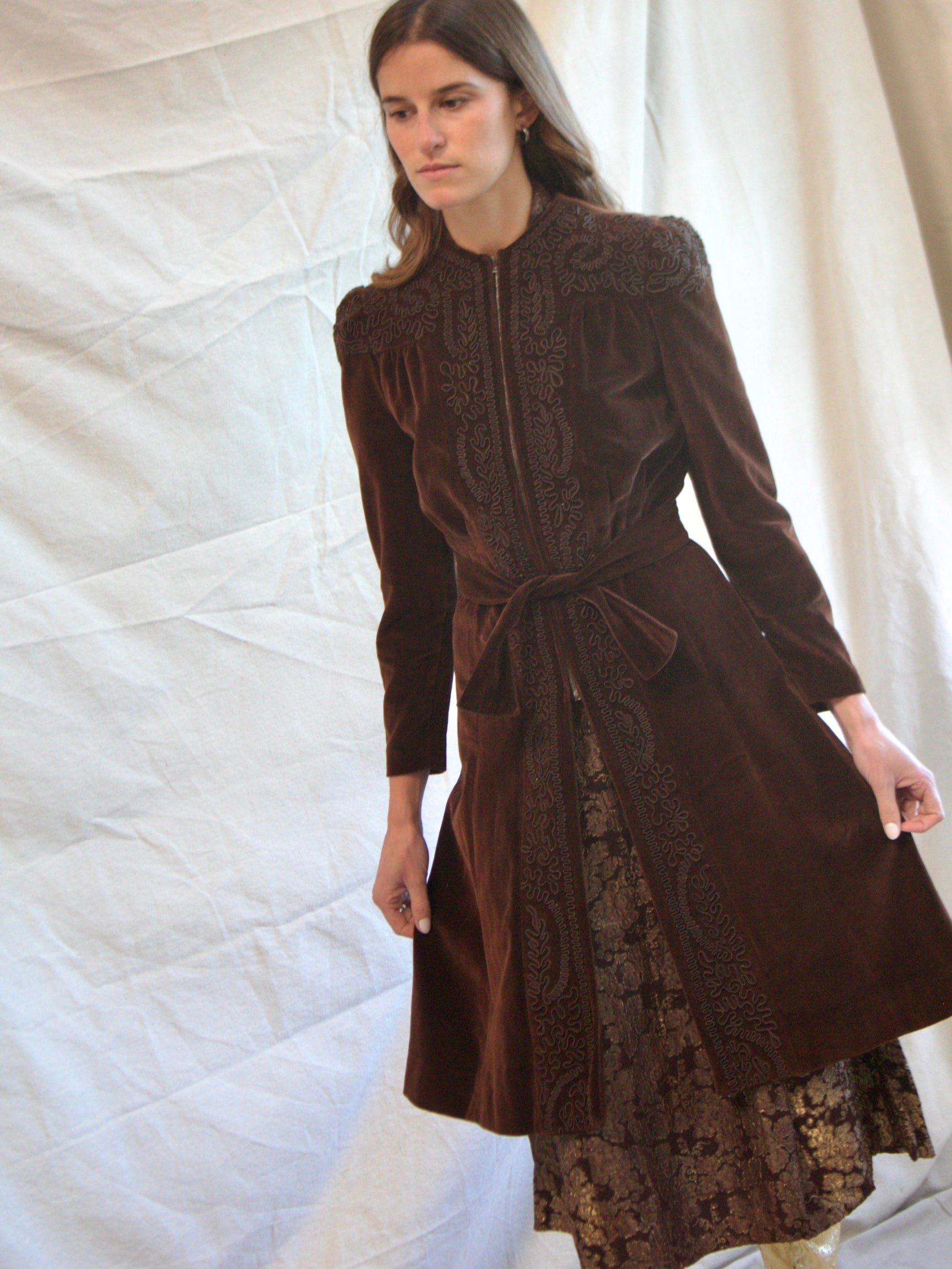 1940s chocolate brown velveteen jacket with gorgeous soutache embroidery throughout bodice, with slight puff sleeves and zip front that stops about hip level, and lays nicely over hips