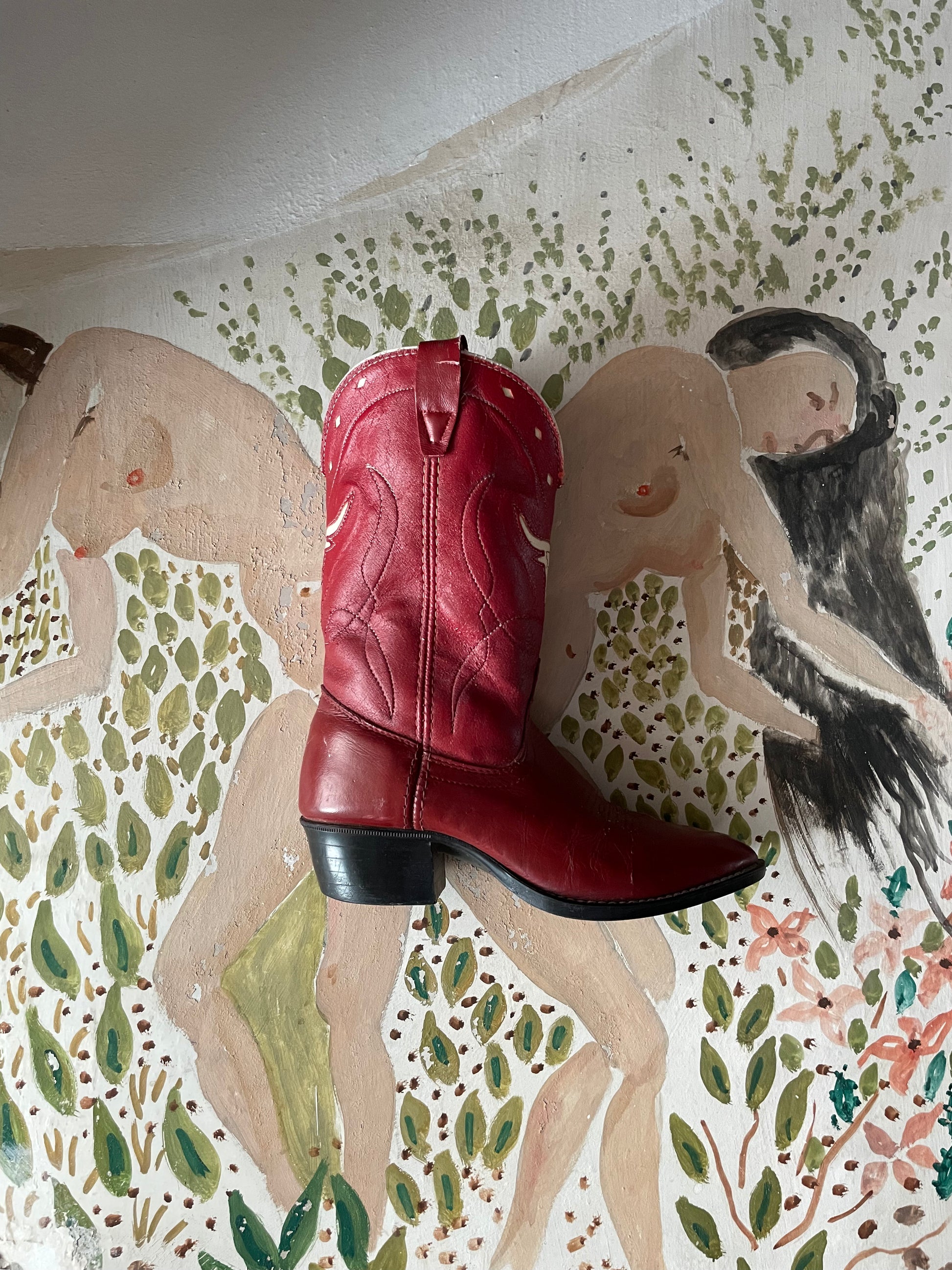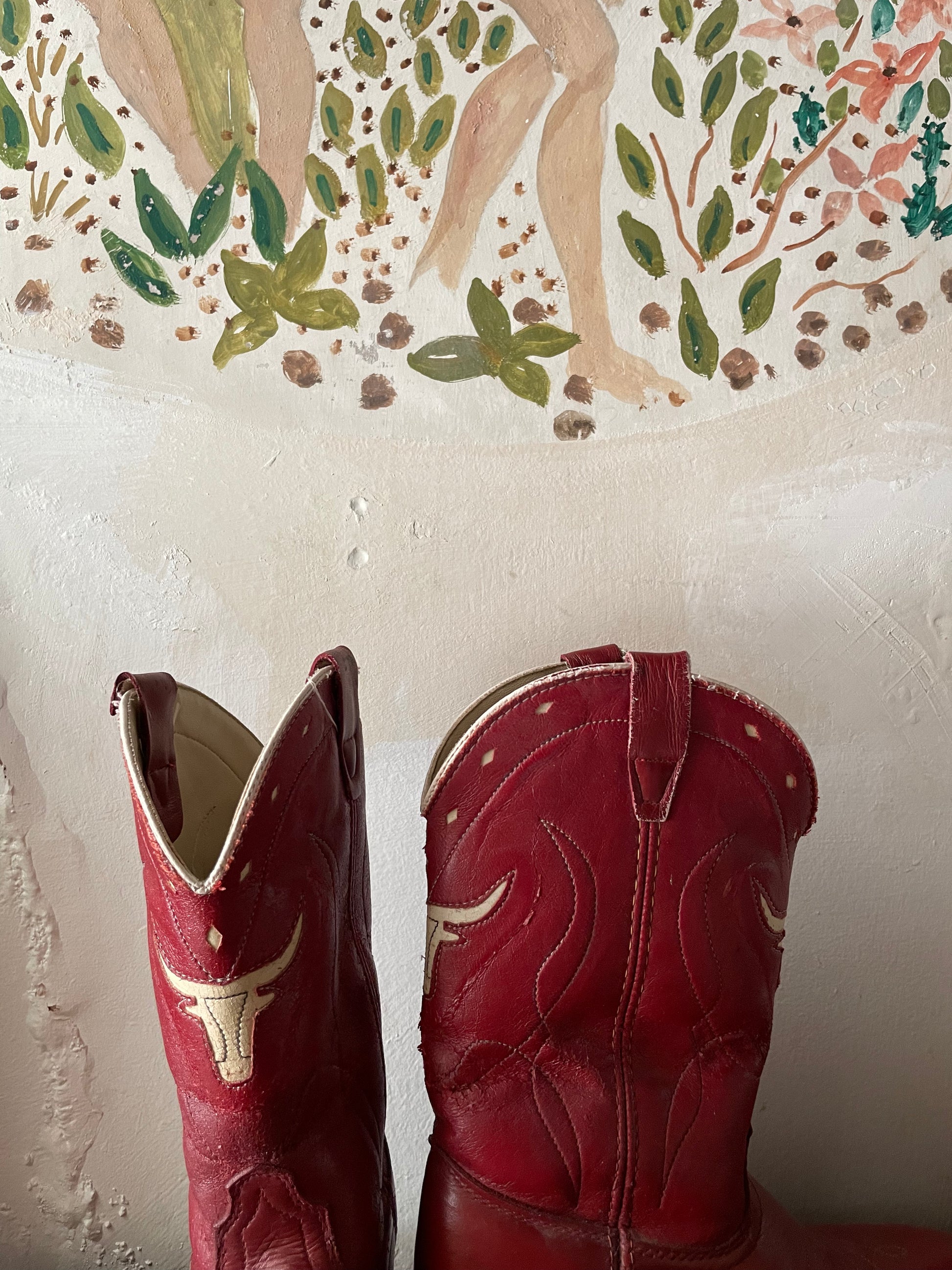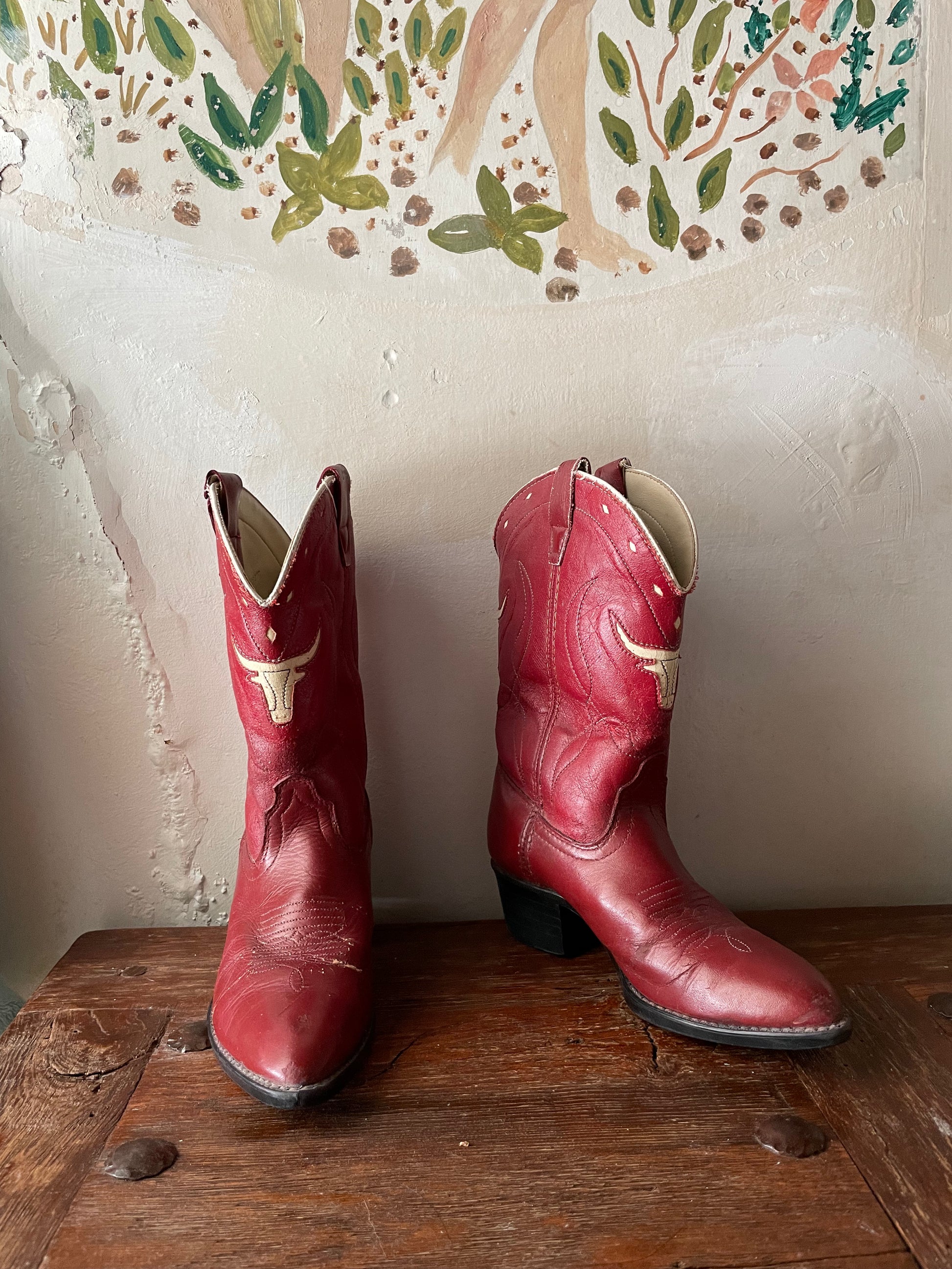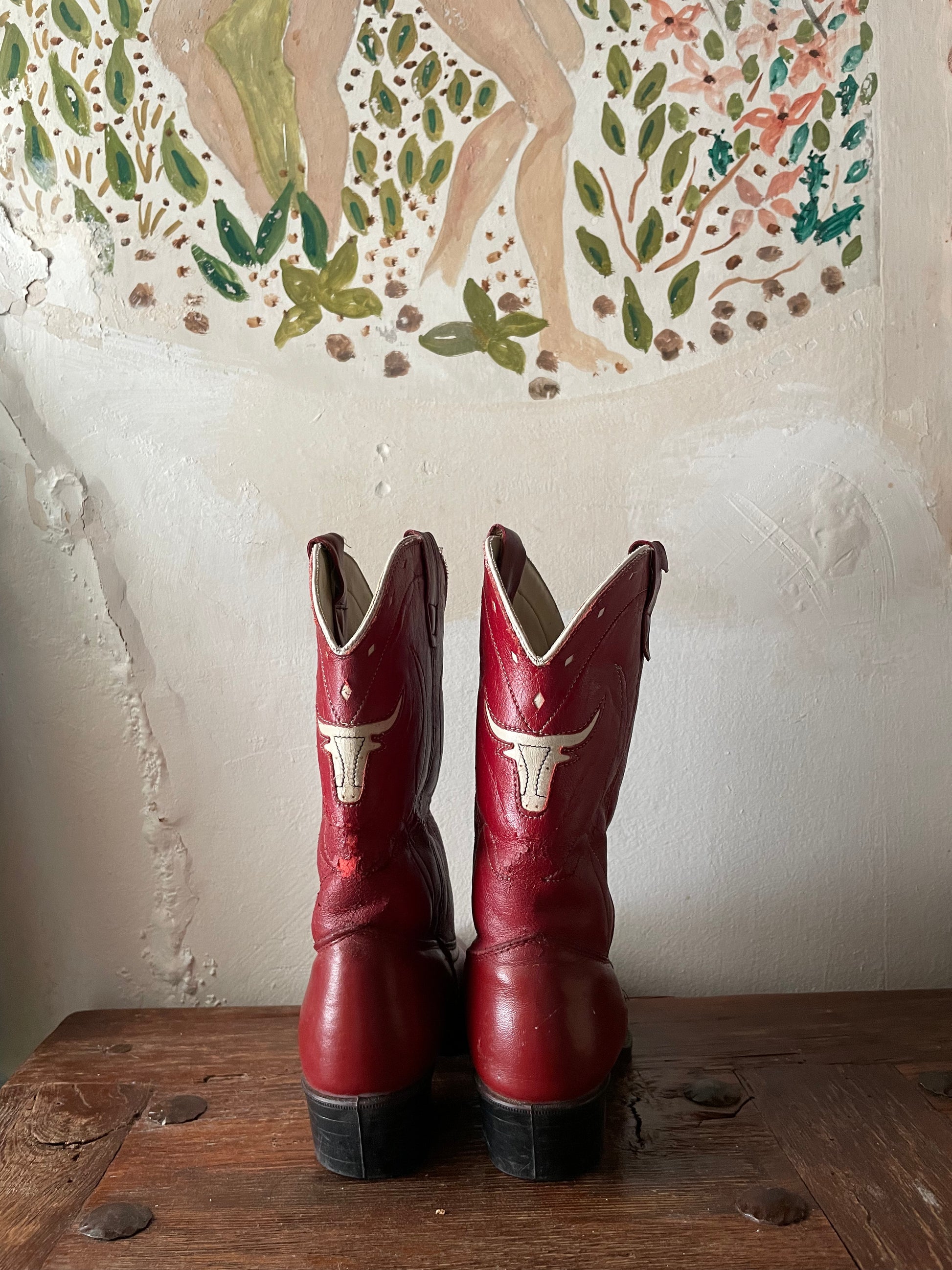 1950s/60s Cherry Red Leather Longhorn Inlay Cowboy Boots