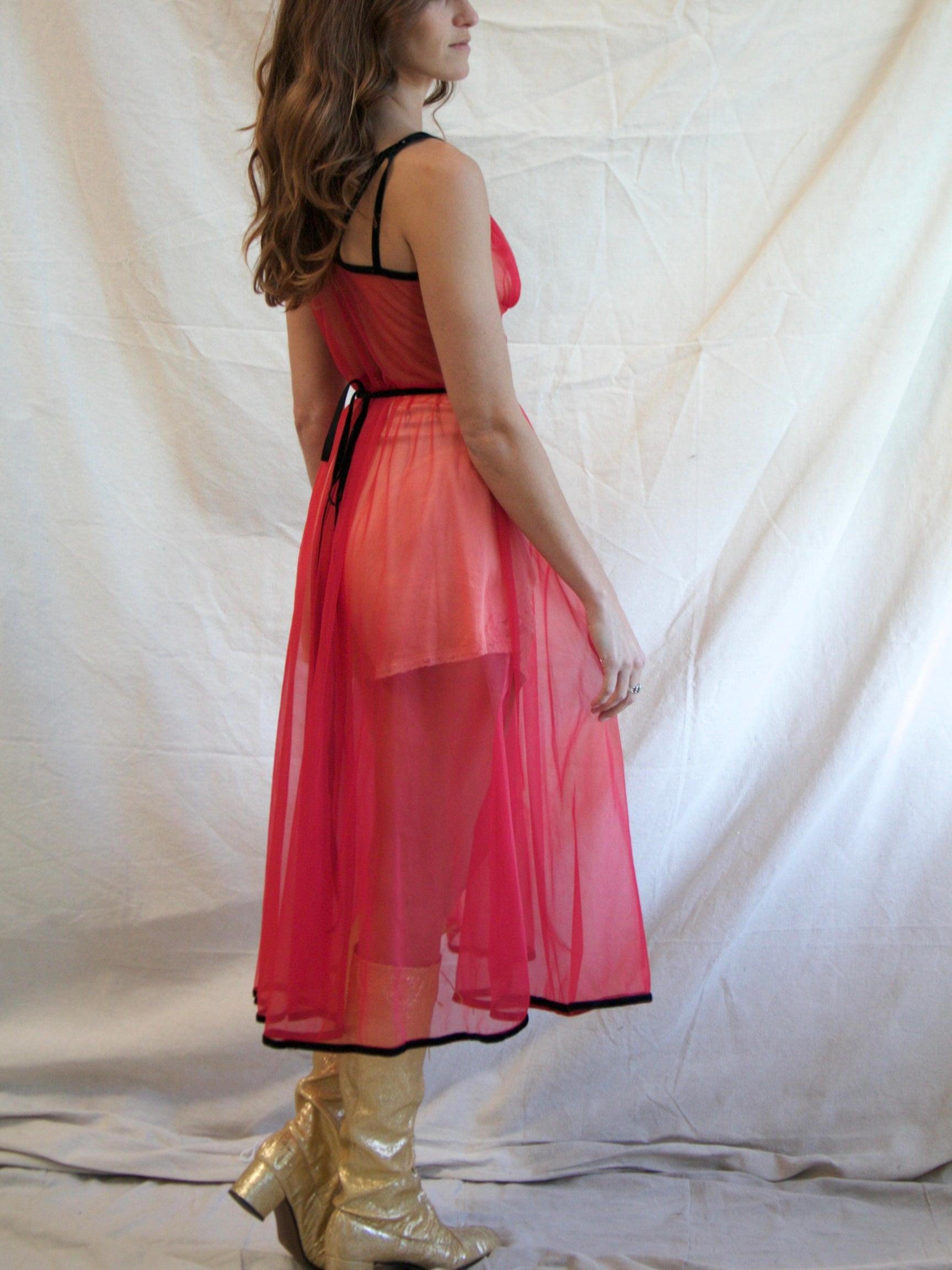 The best 1950s sheer cherry red nylon slip dress with faux studding look of prong set rhinestone detailing on velveteen trim with a double strand straps and ruched bust. Nipped in waist with full, voluminous skirt that is trimmed in velveteen, which helps to keep the fullness in the skirt. Slips on over head with waist ties to give shape