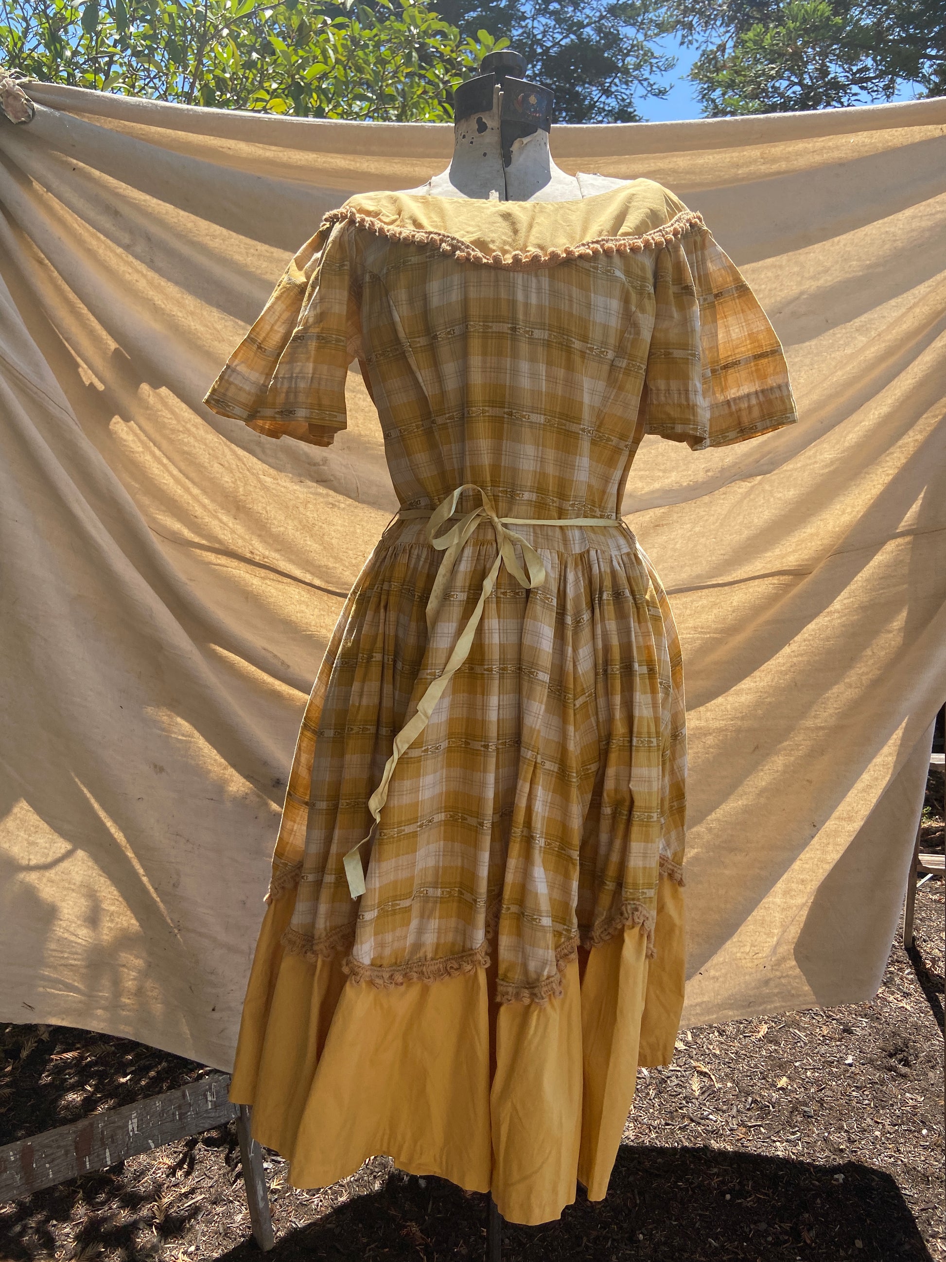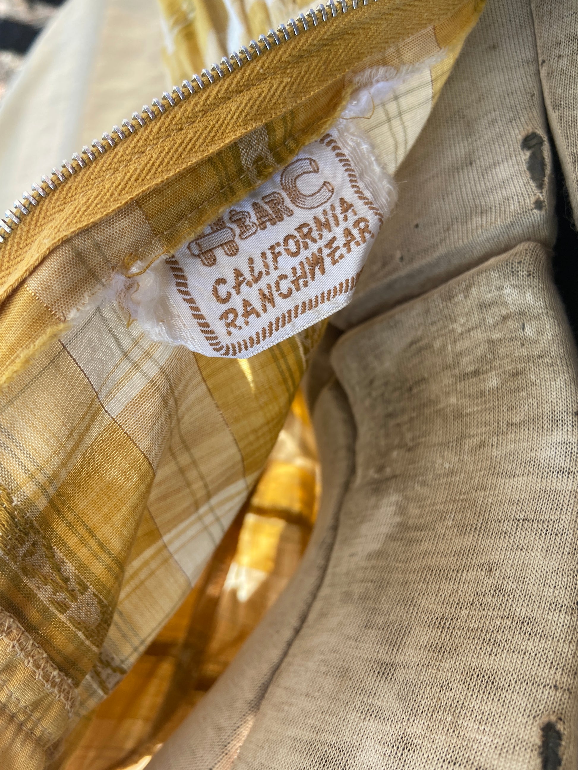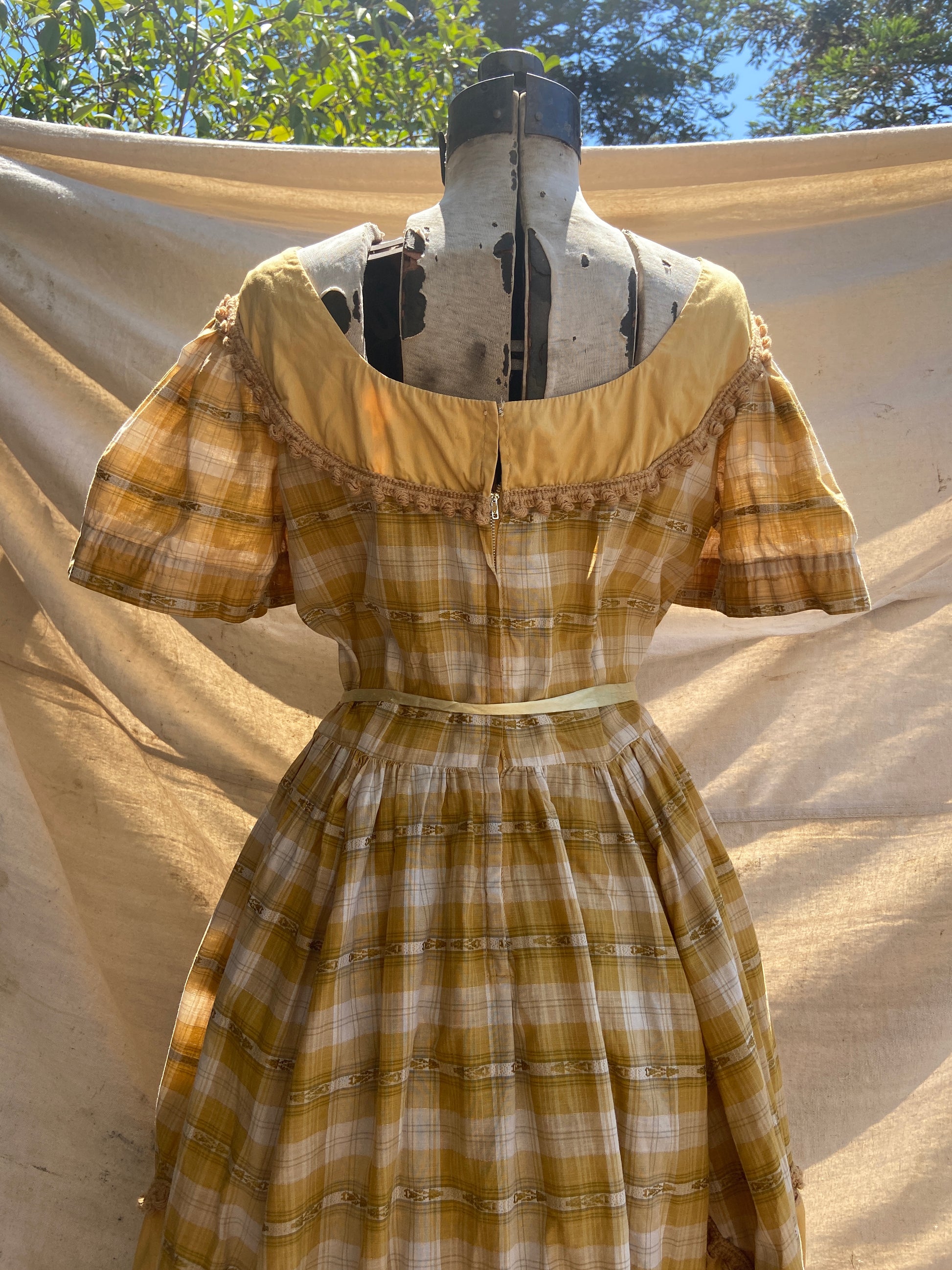 Super sweet 50s marigold and cream plaid western/square dancing dress by H Bar C. Features flutter sleeves with a high waist and full circle skirt, and zipper up the back with hook and eye closure. Has belt loops, but no original belt