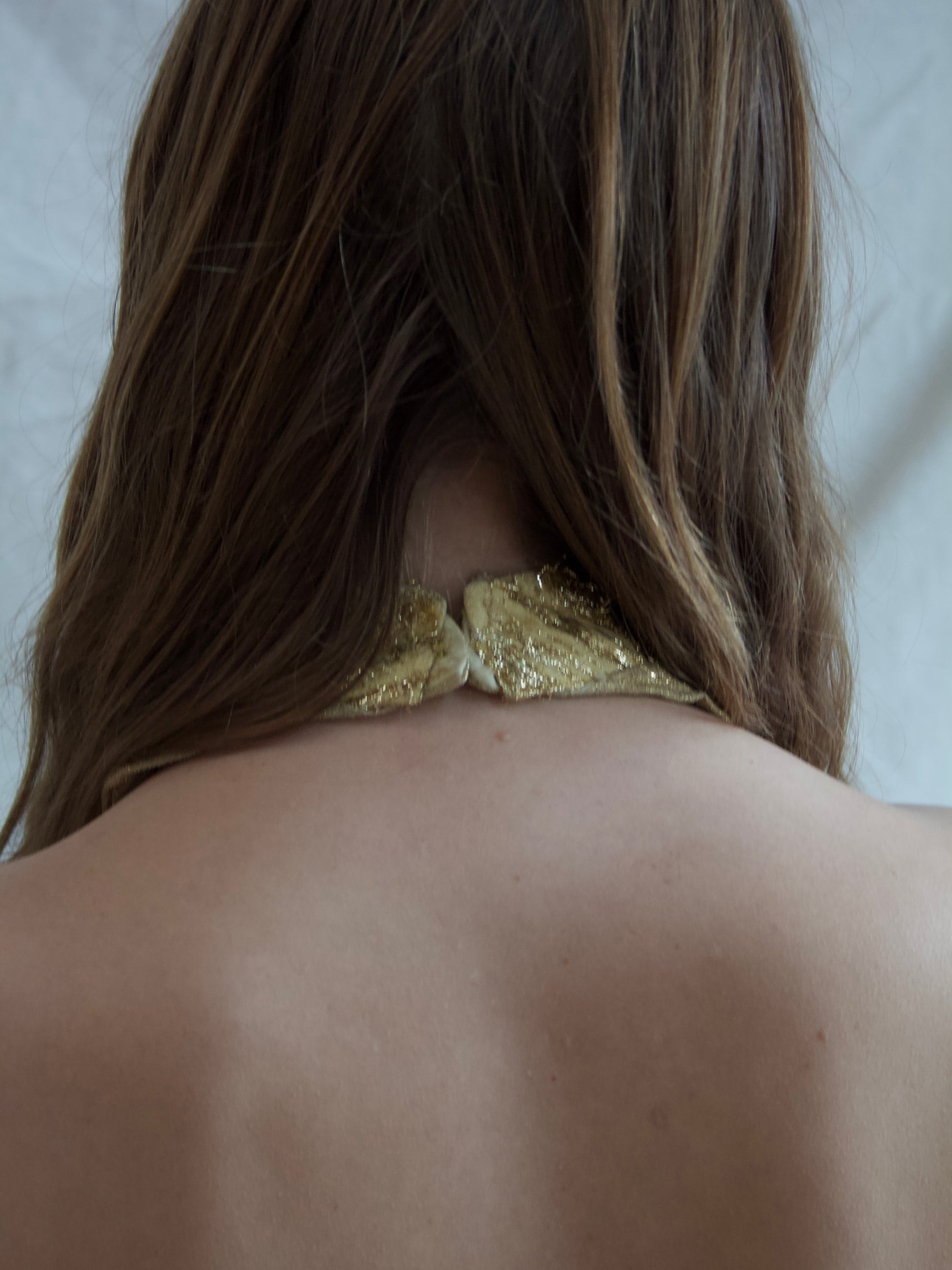 Unique 1950s gold lurex palazzo pant jumpsuit with halter neckline, dropped waist, split side seam hems and low back with center back zipper closure and hook at back neck. Styling hack is to cinch waist with belt and slightly fold fabric over at wasit to have it lay nicely *belt not included with jumpsuit*