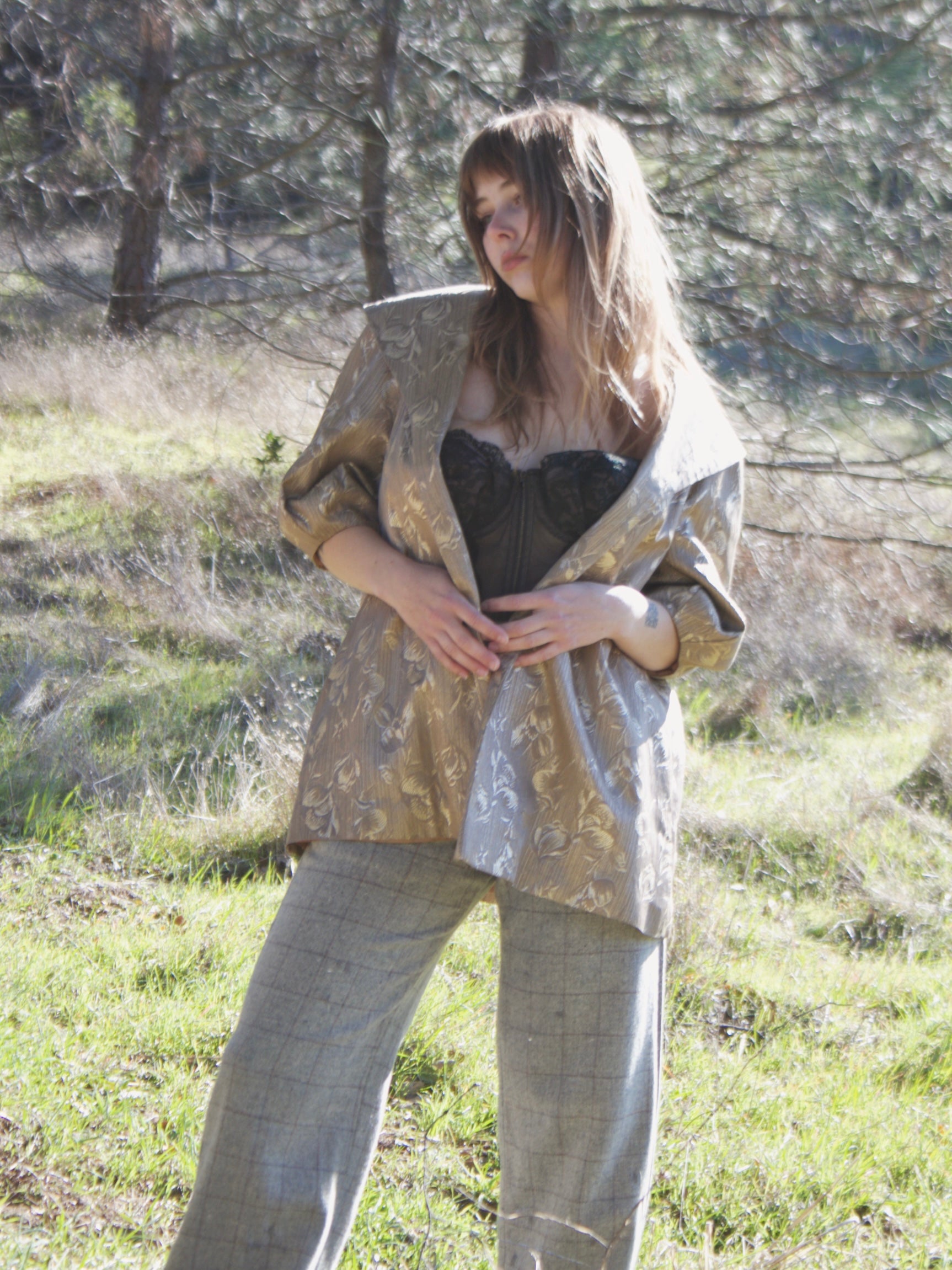 Mid century metallic satin brocade evening jacket with open front and balloon sleeves. Lined in rayon