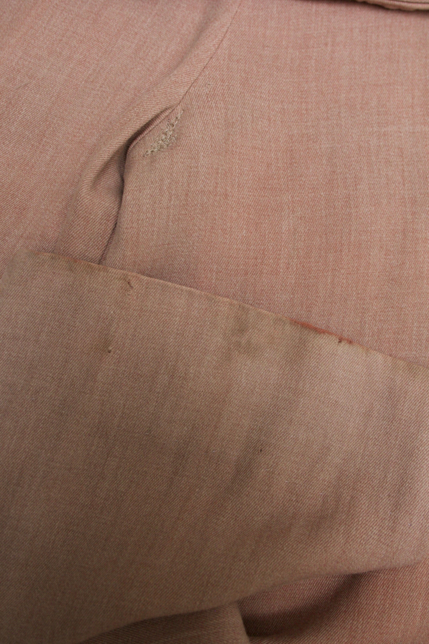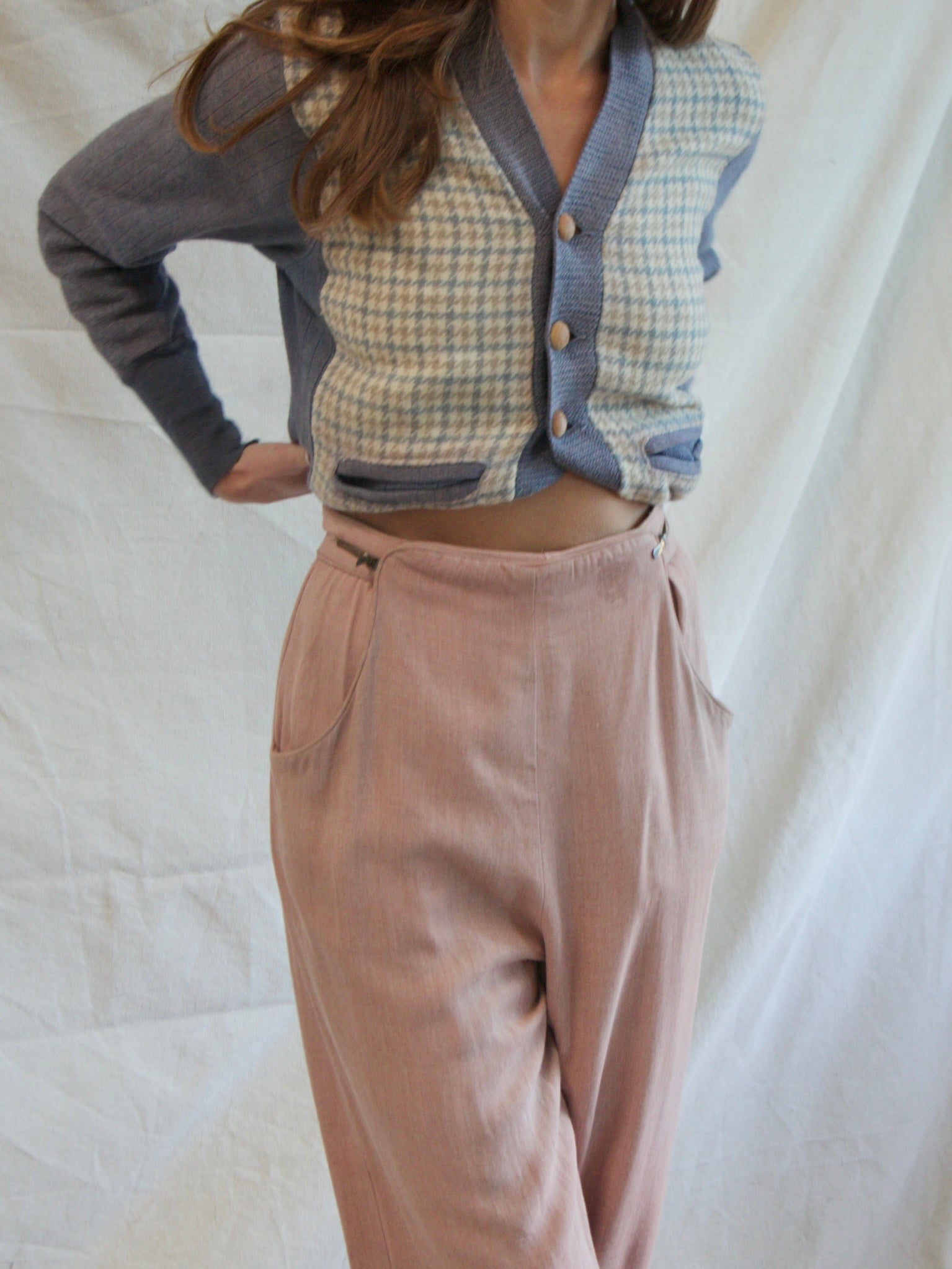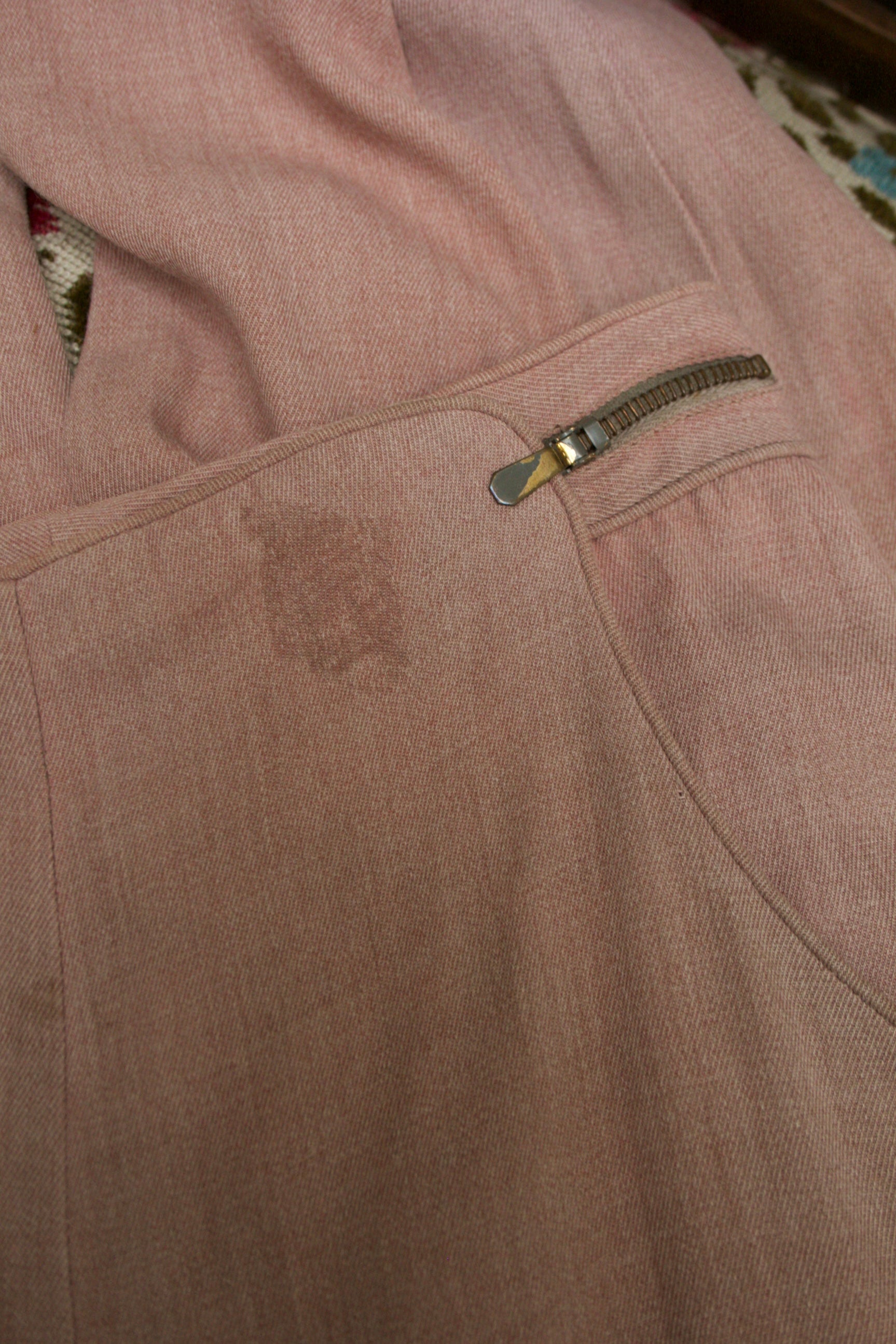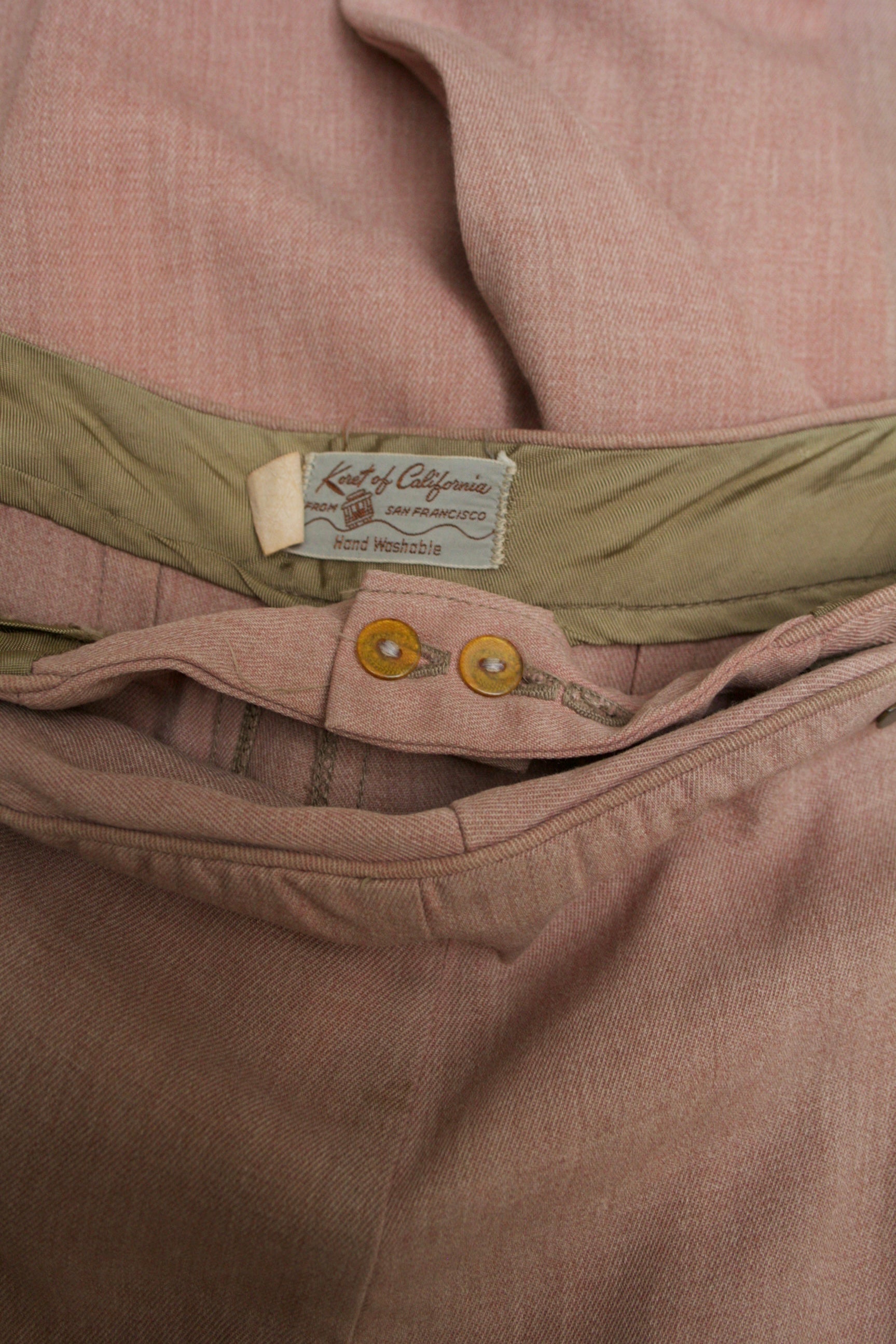 1950s dusty mauve gabardine pants with inner multiple button waistband and two sliding zipper closures at wash side waist, with side hip pockets.