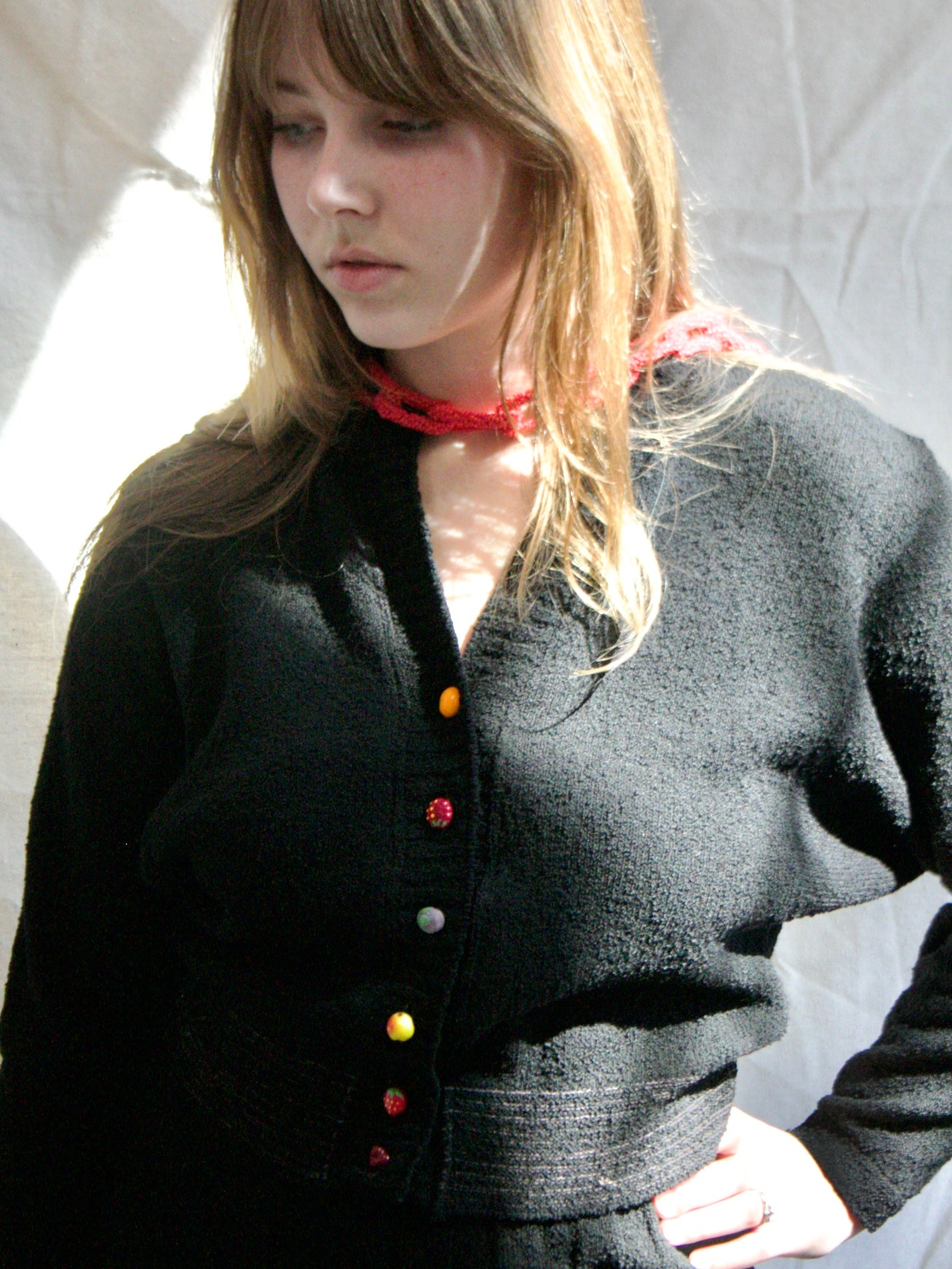 1950s Vampy Boucle Fruit Button Knit 2 PC Skirt Set