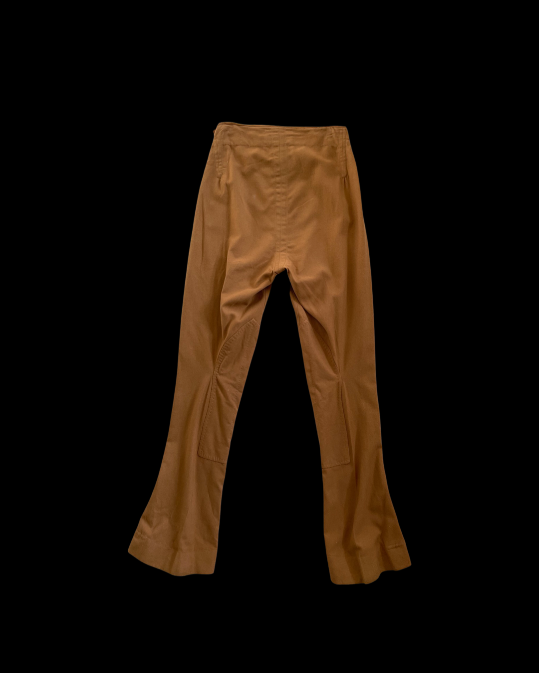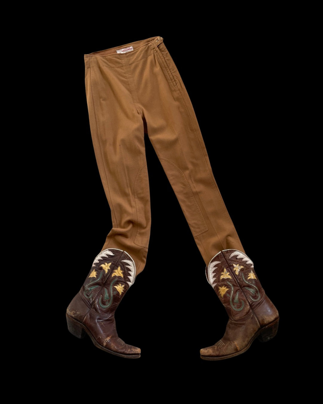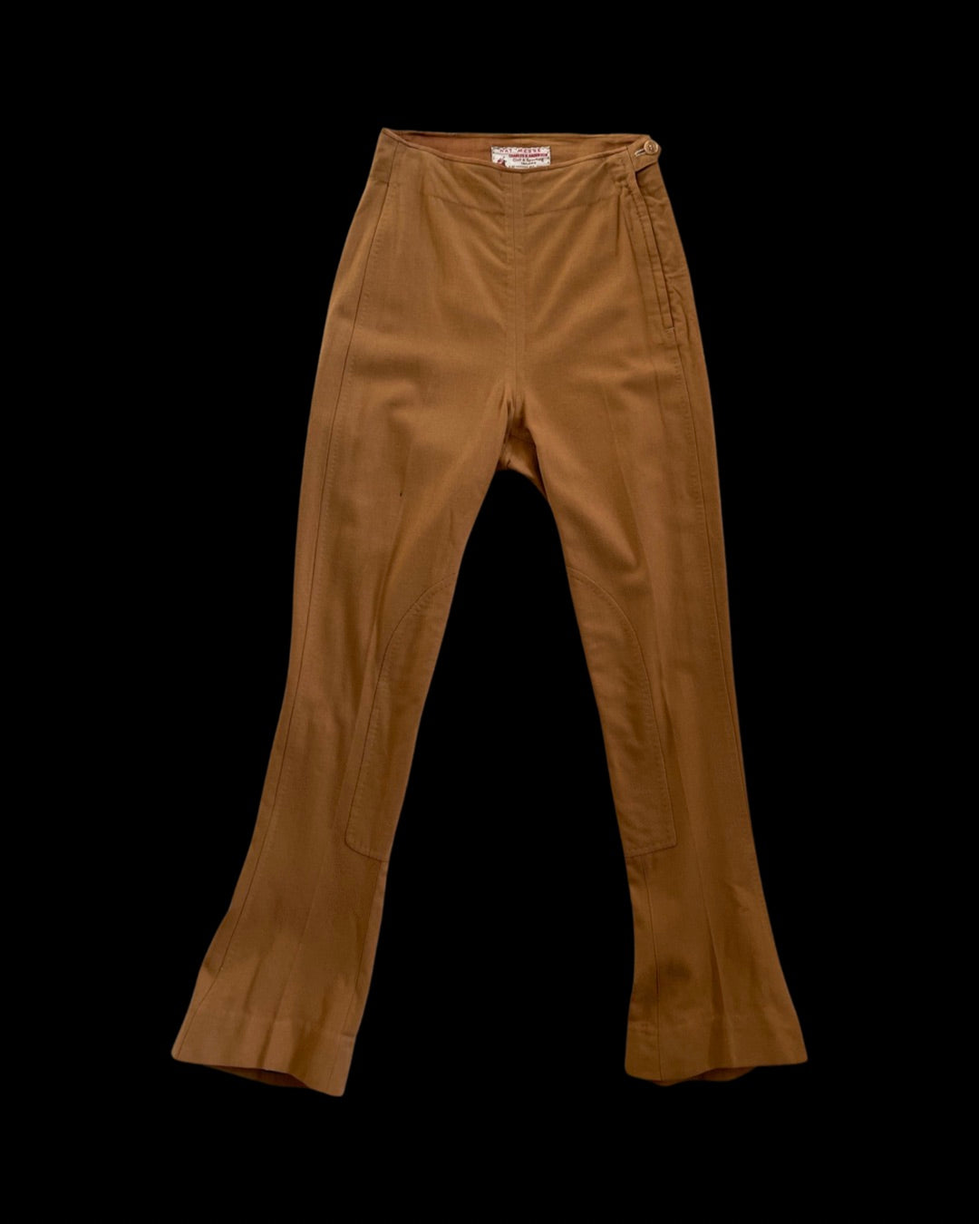 Great custom tailored 1950s side button with zipper riding pants with western seaming and leather trim stirrups. Slight boot cut, kick flare hem.