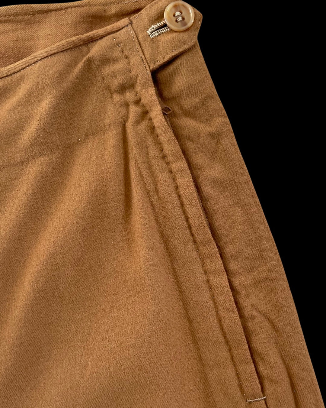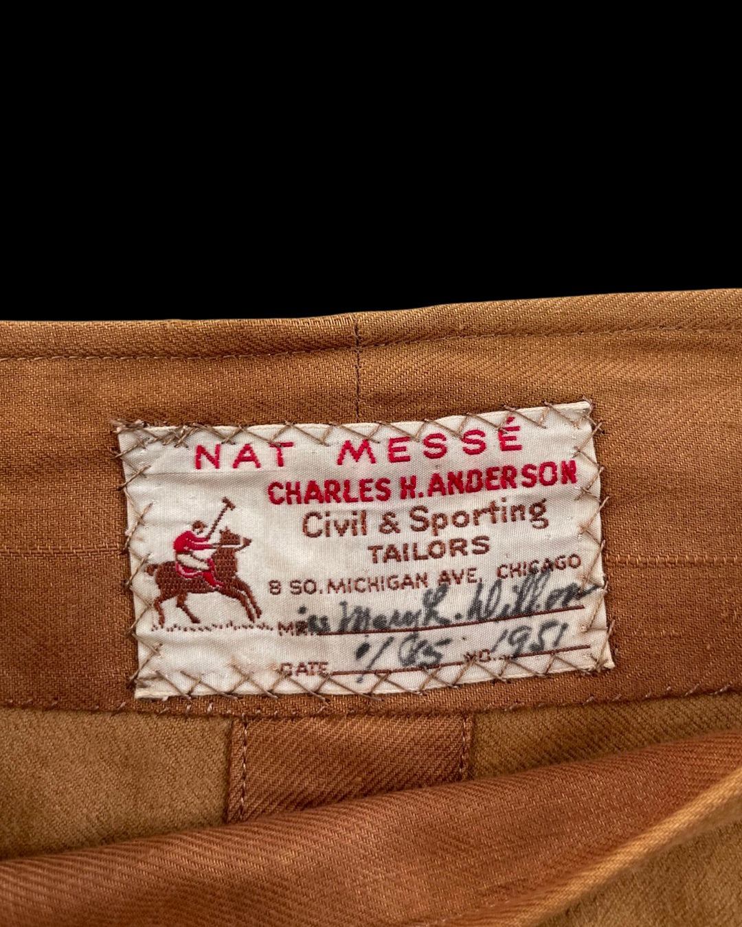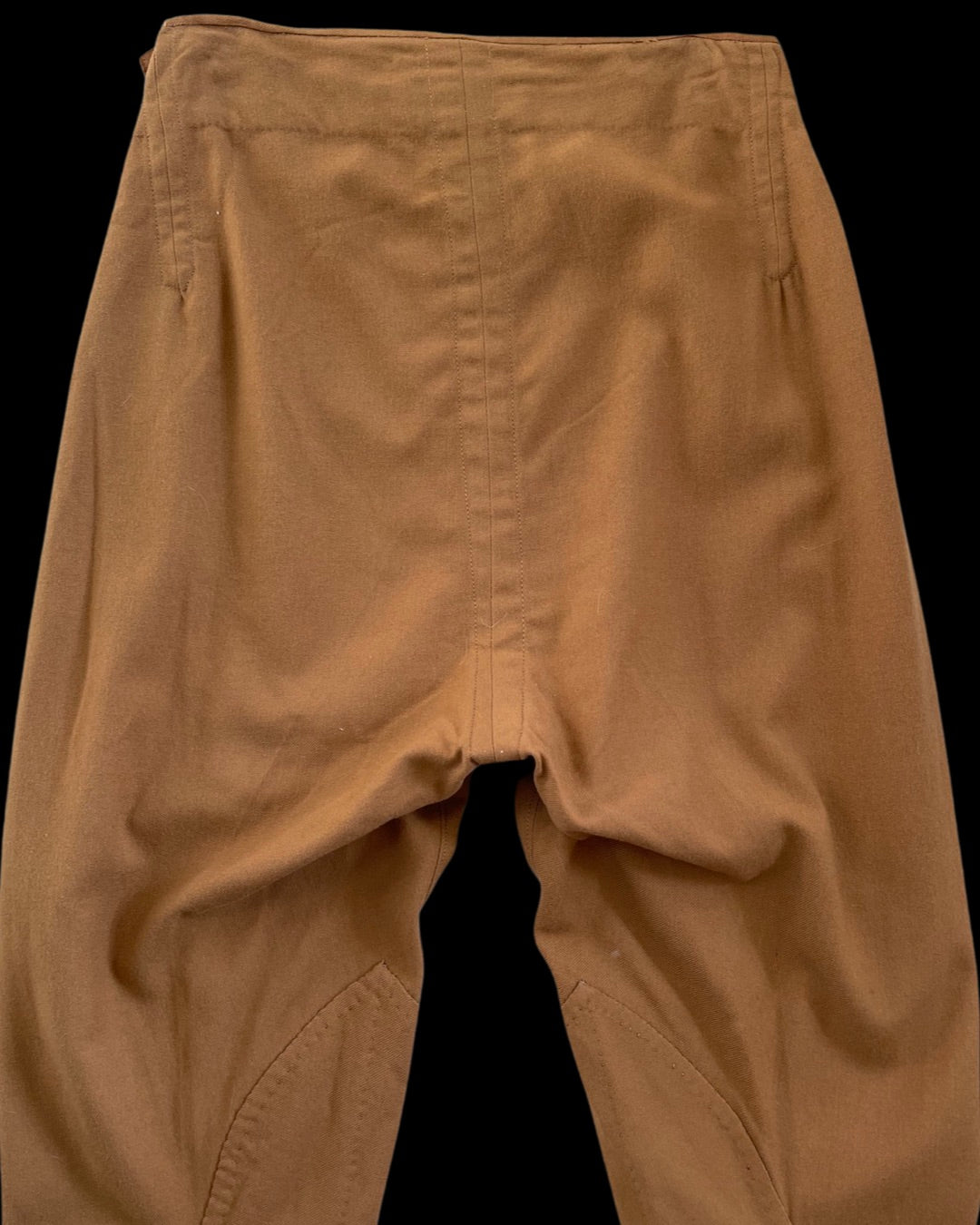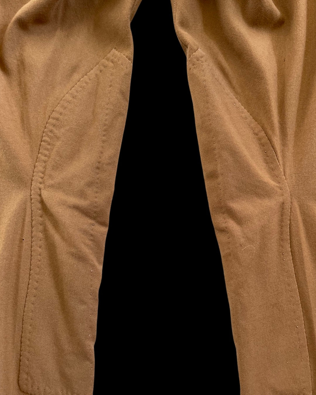 Great custom tailored 1950s side button with zipper riding pants with western seaming and leather trim stirrups. Slight boot cut, kick flare hem.