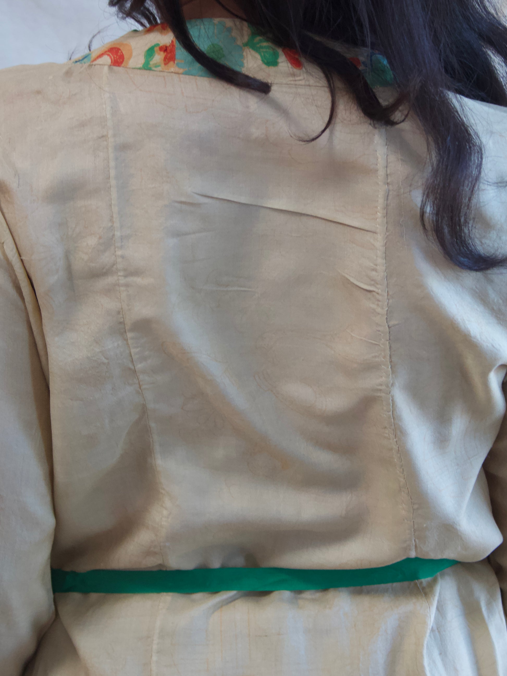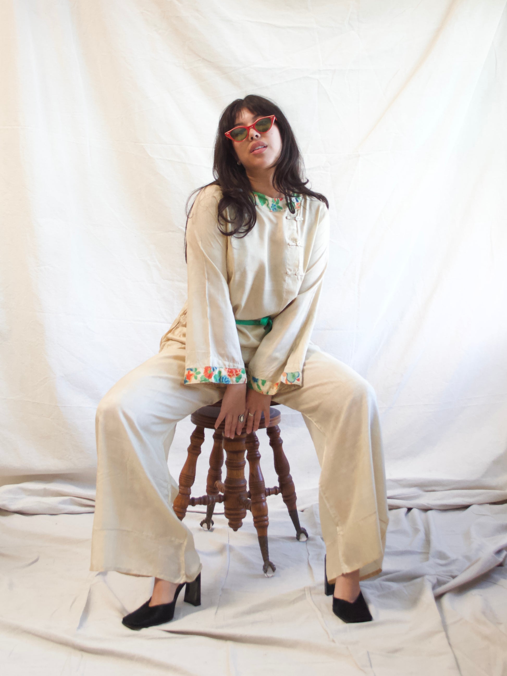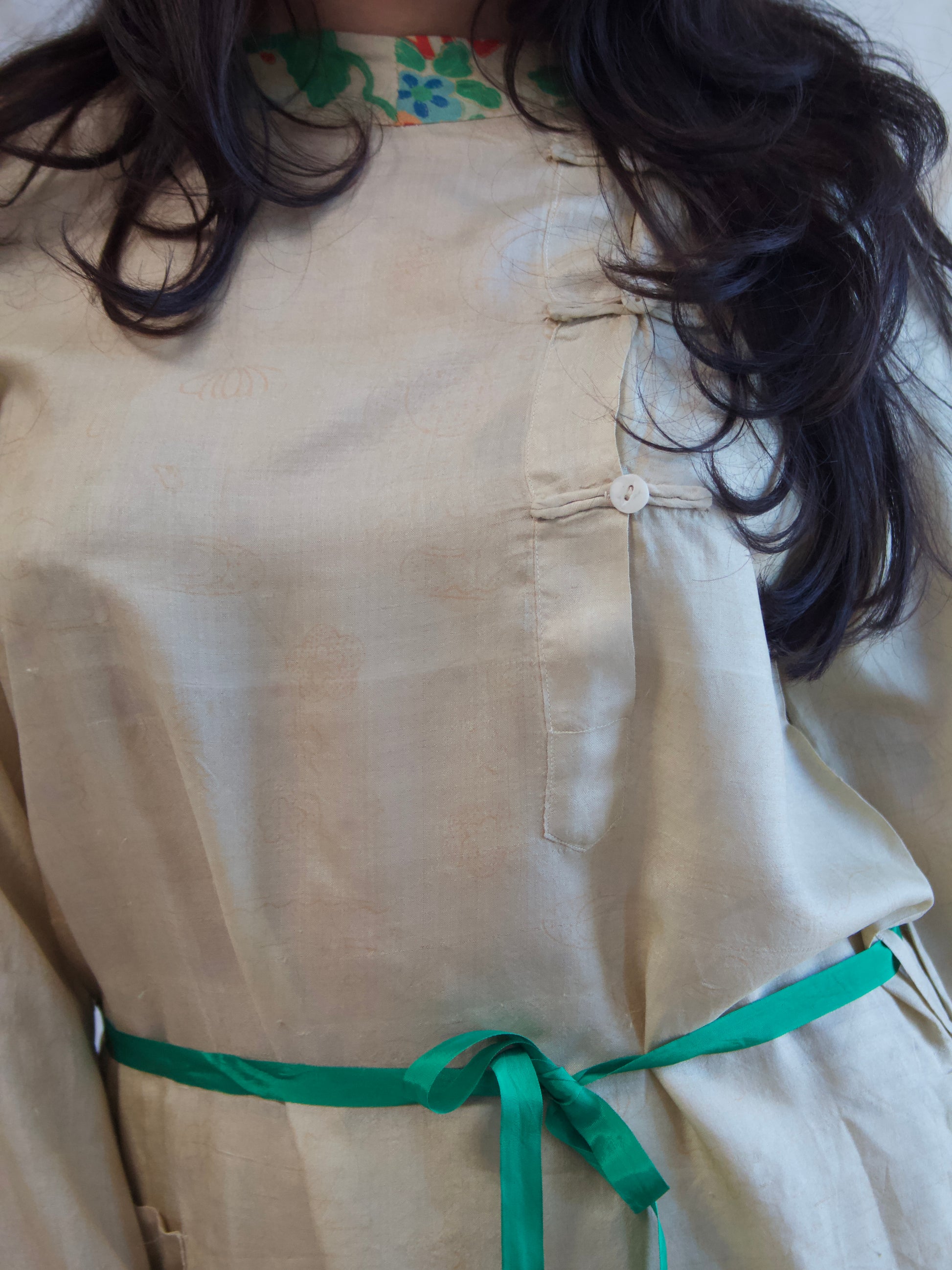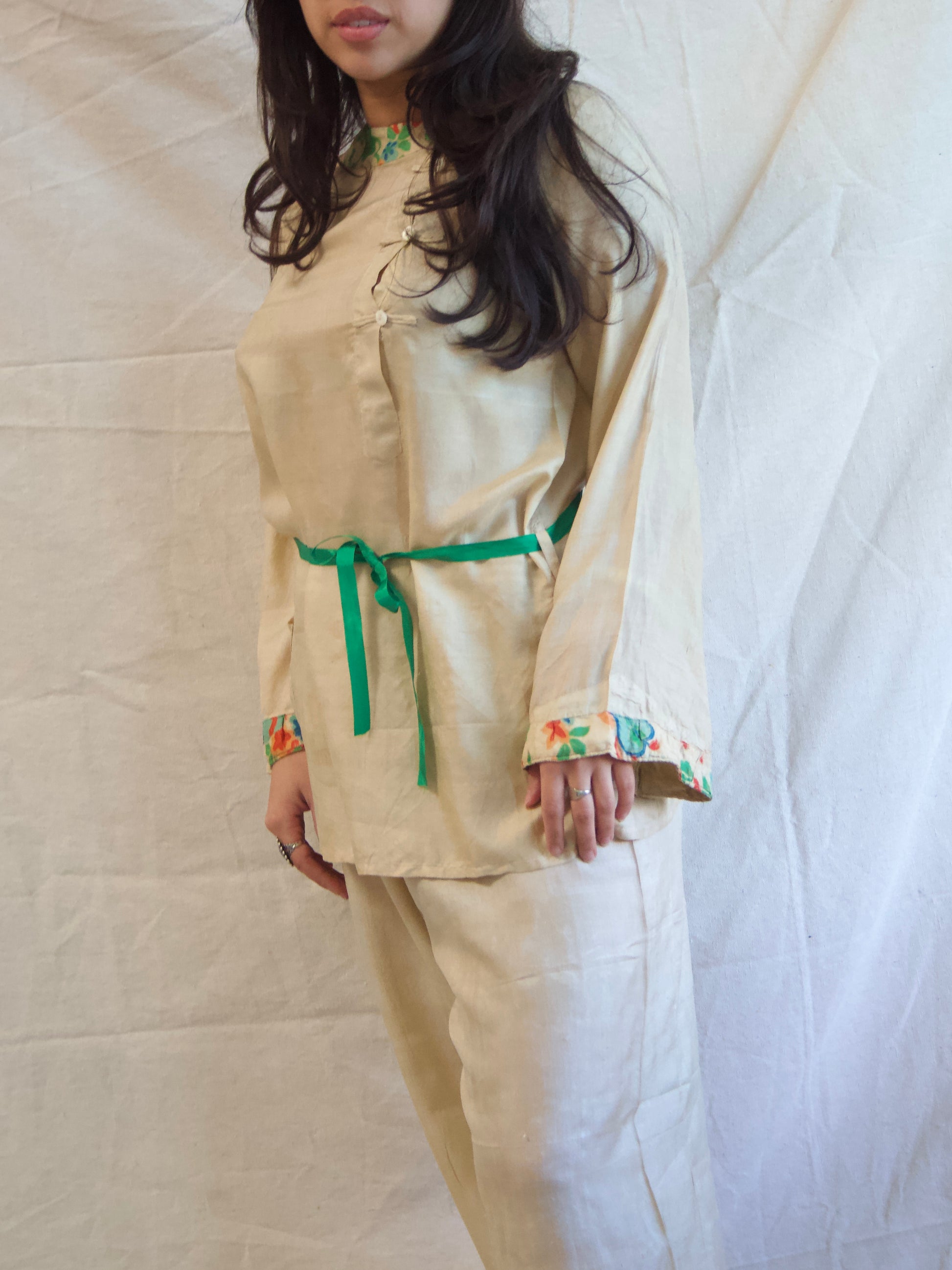 Antique 1920s pongee silk two piece loungewear pant & blouse set. Blouse has off center mother of pearl button and loop closures with slightly flared sleeves with a very faded printed bodice. Pants are elasticated with a snap closure at side waist