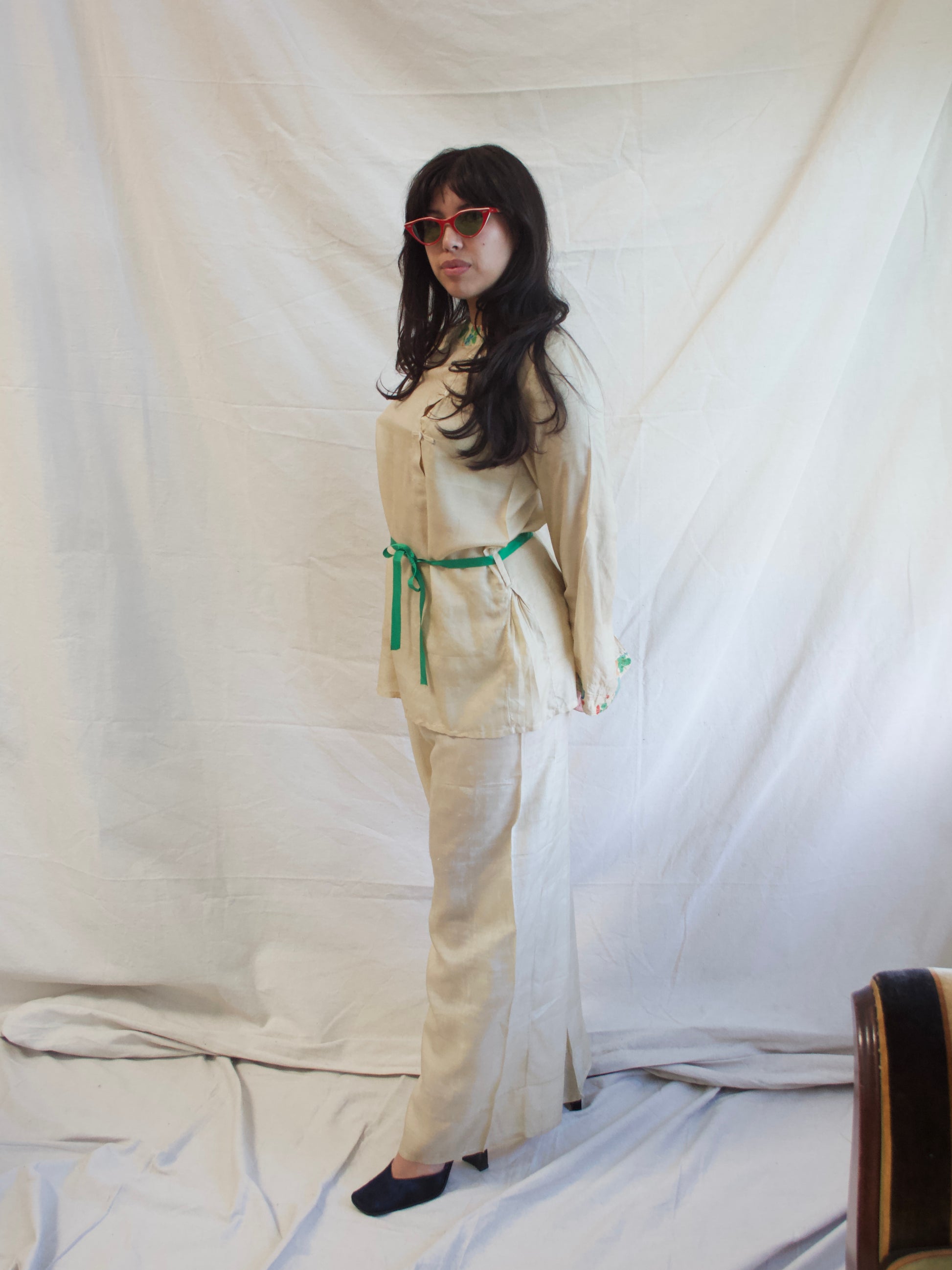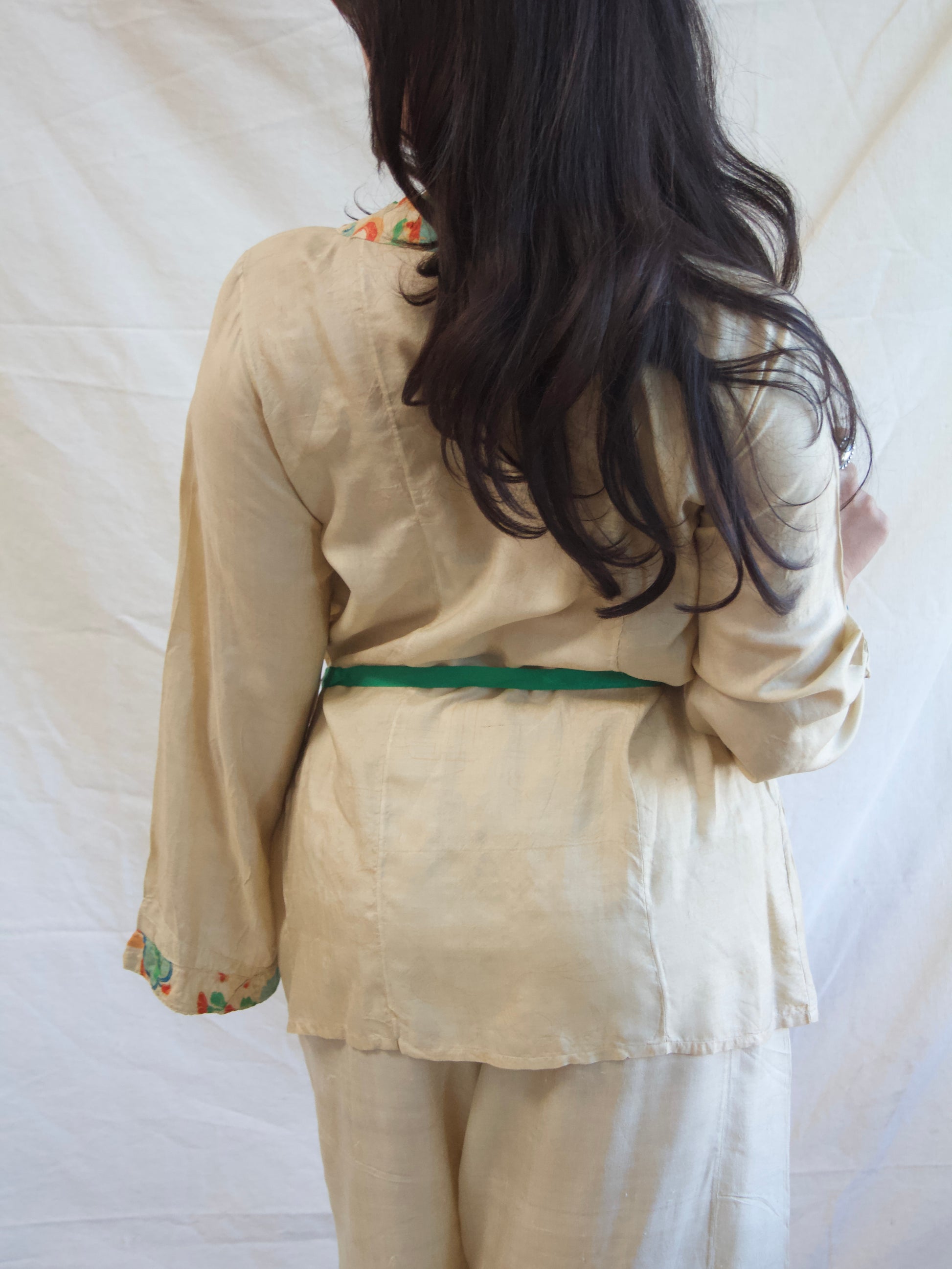 Antique 1920s Faded Print Pongee Silk 2 PC Loungewear Pant Set