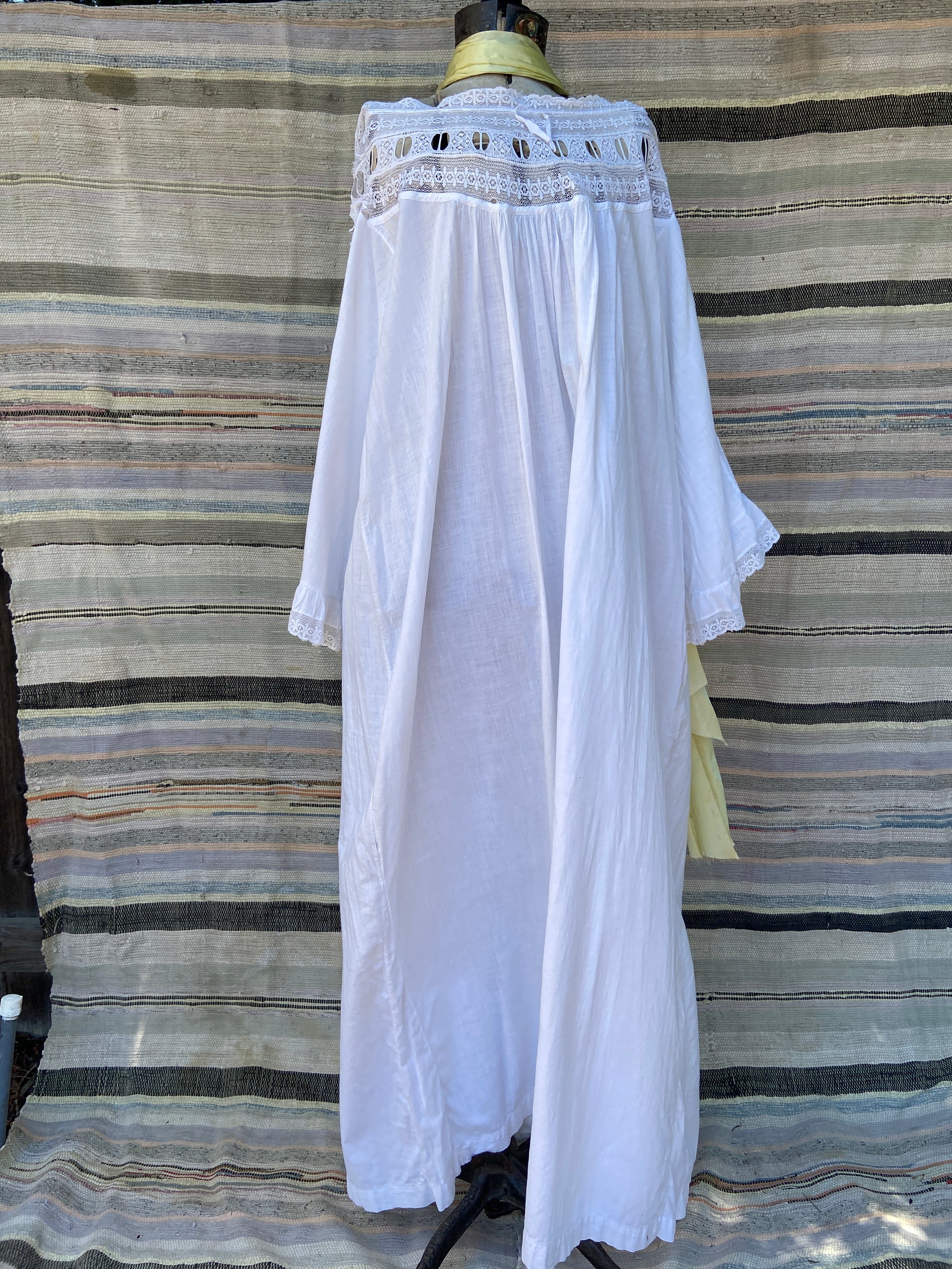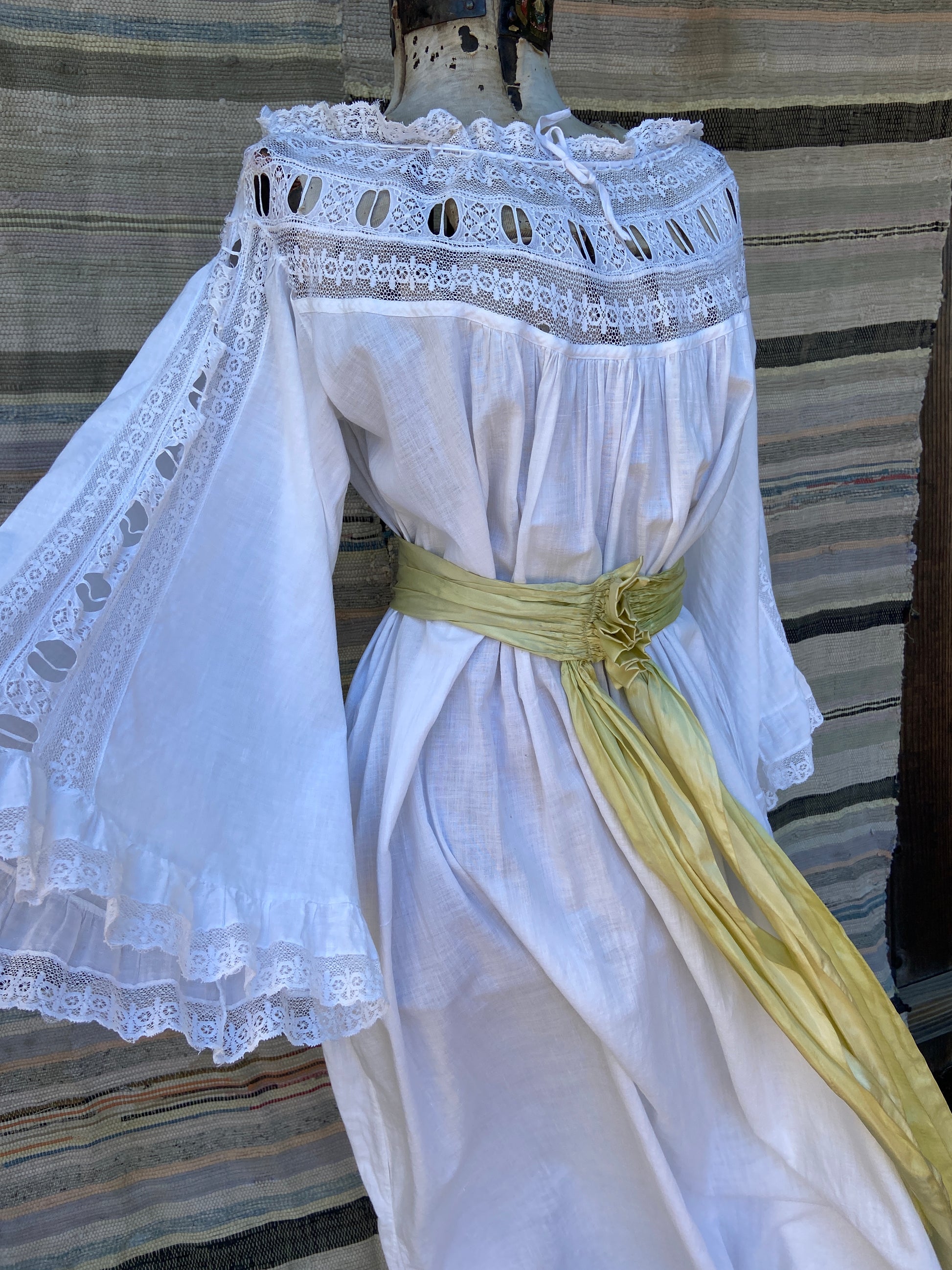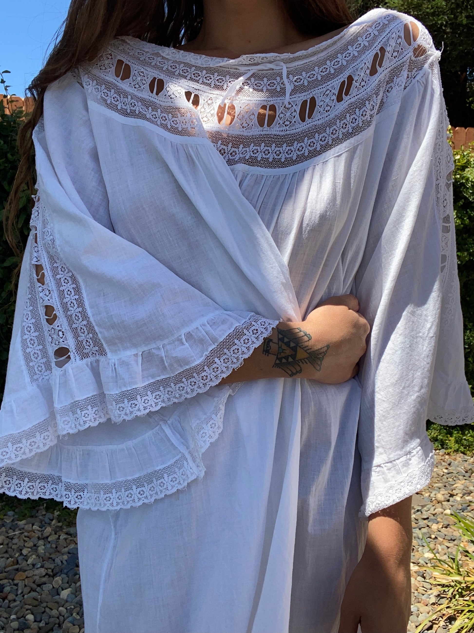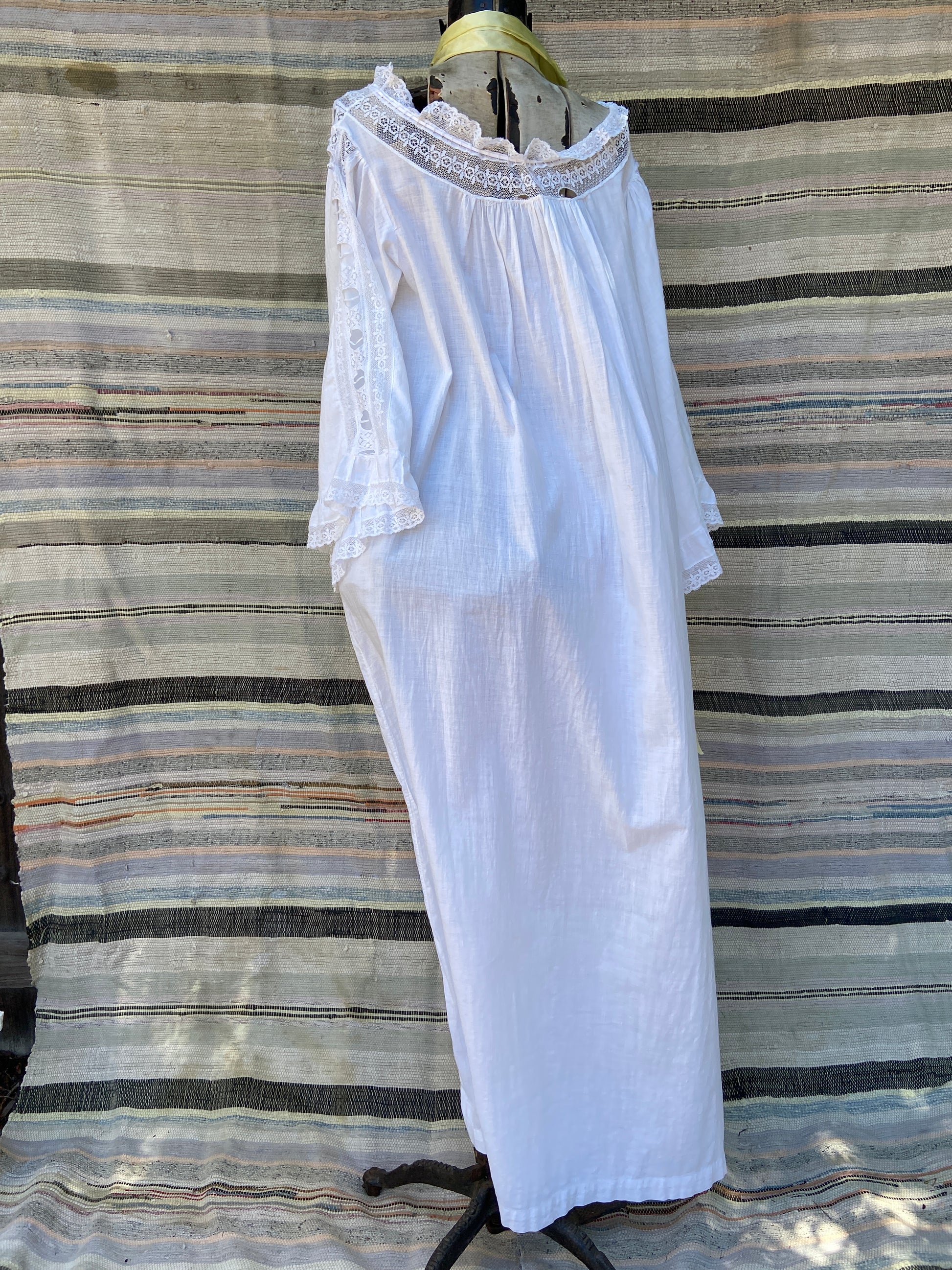 Incredible Edwardian cotton nightgown with etherial sleeves with lace inserts down the center, lace panel around neckline that has a tie woven throughout that can be adjusted to wear more off the shoulders or cinched on top of shoulders.
