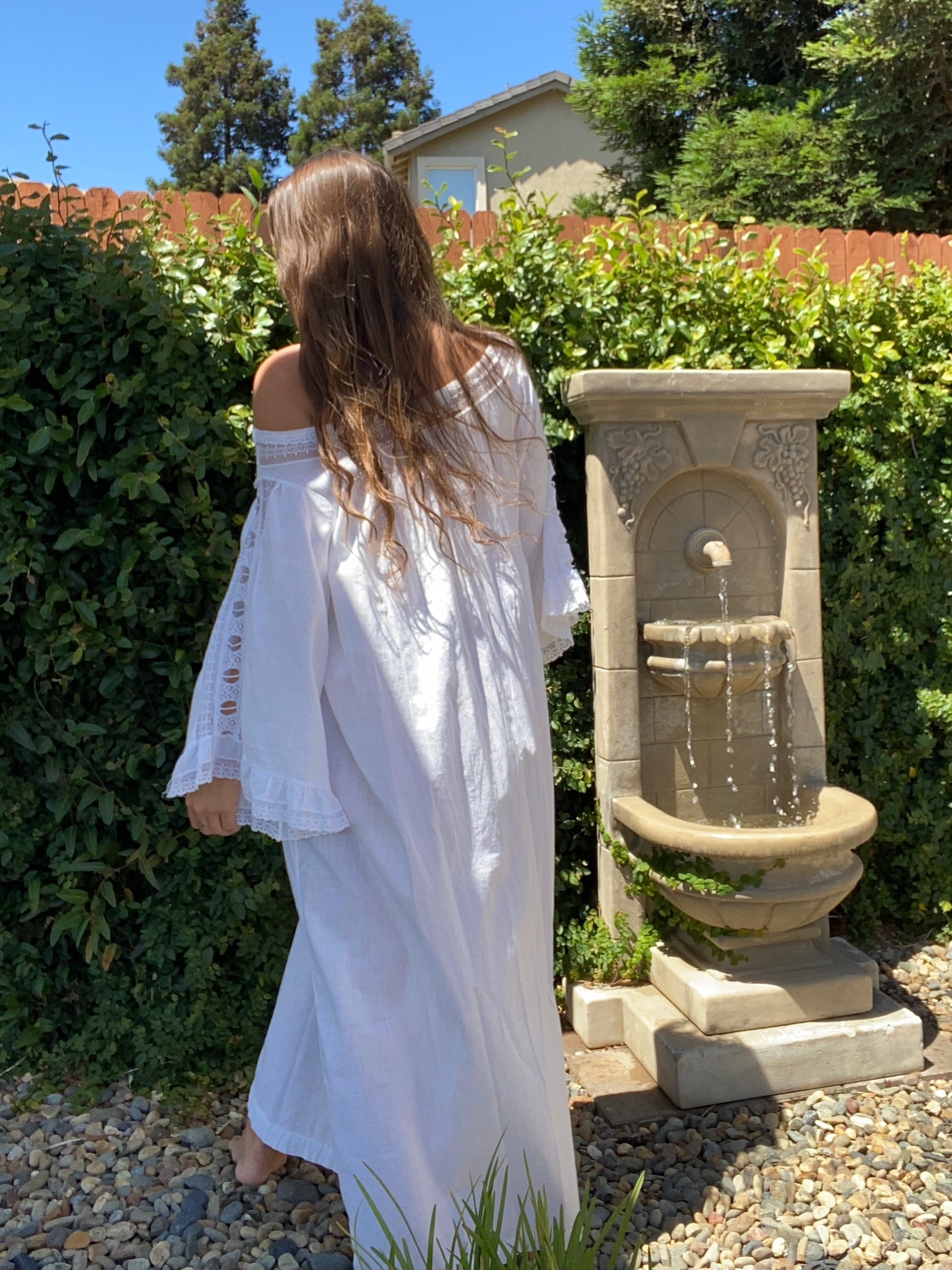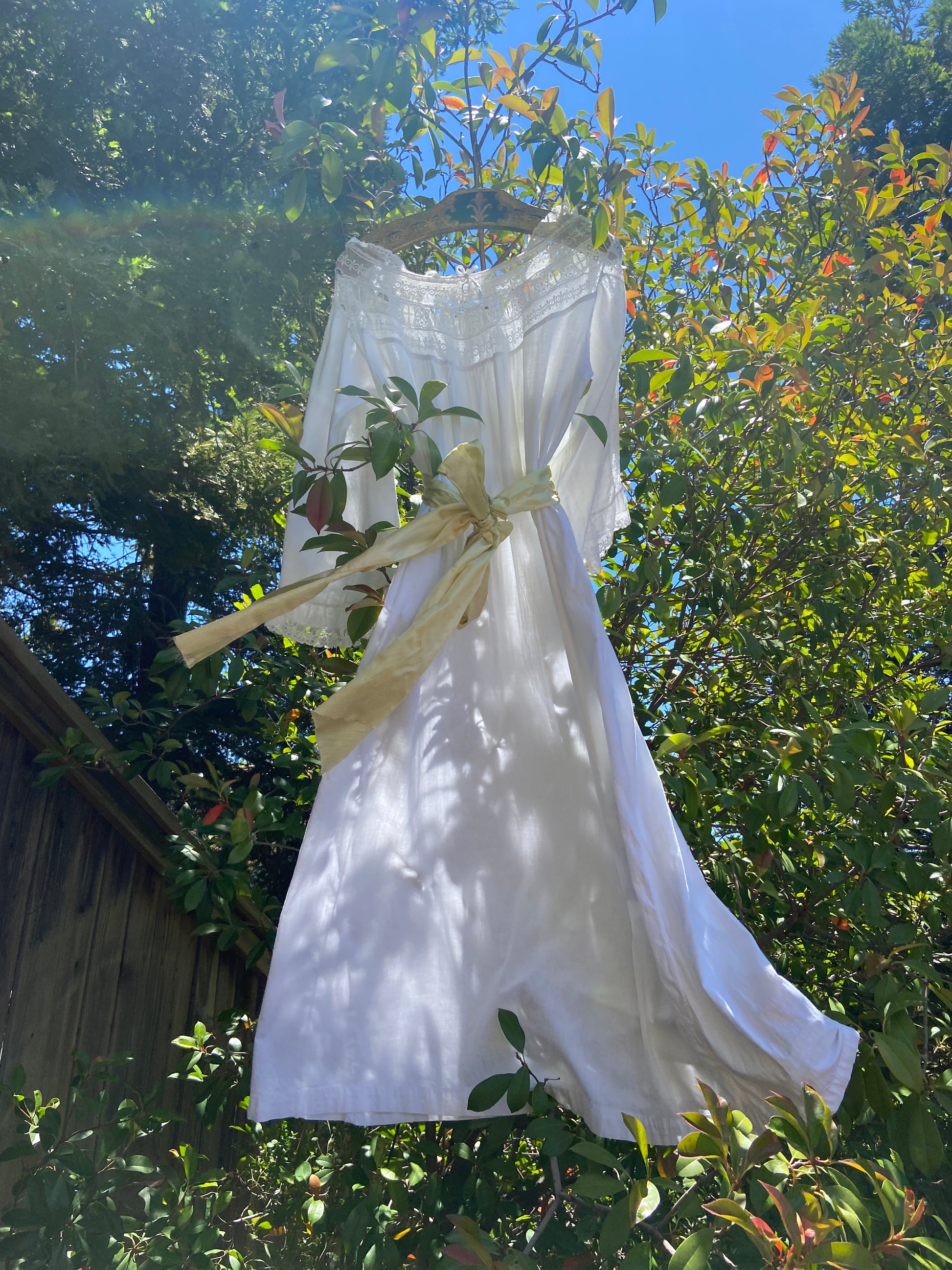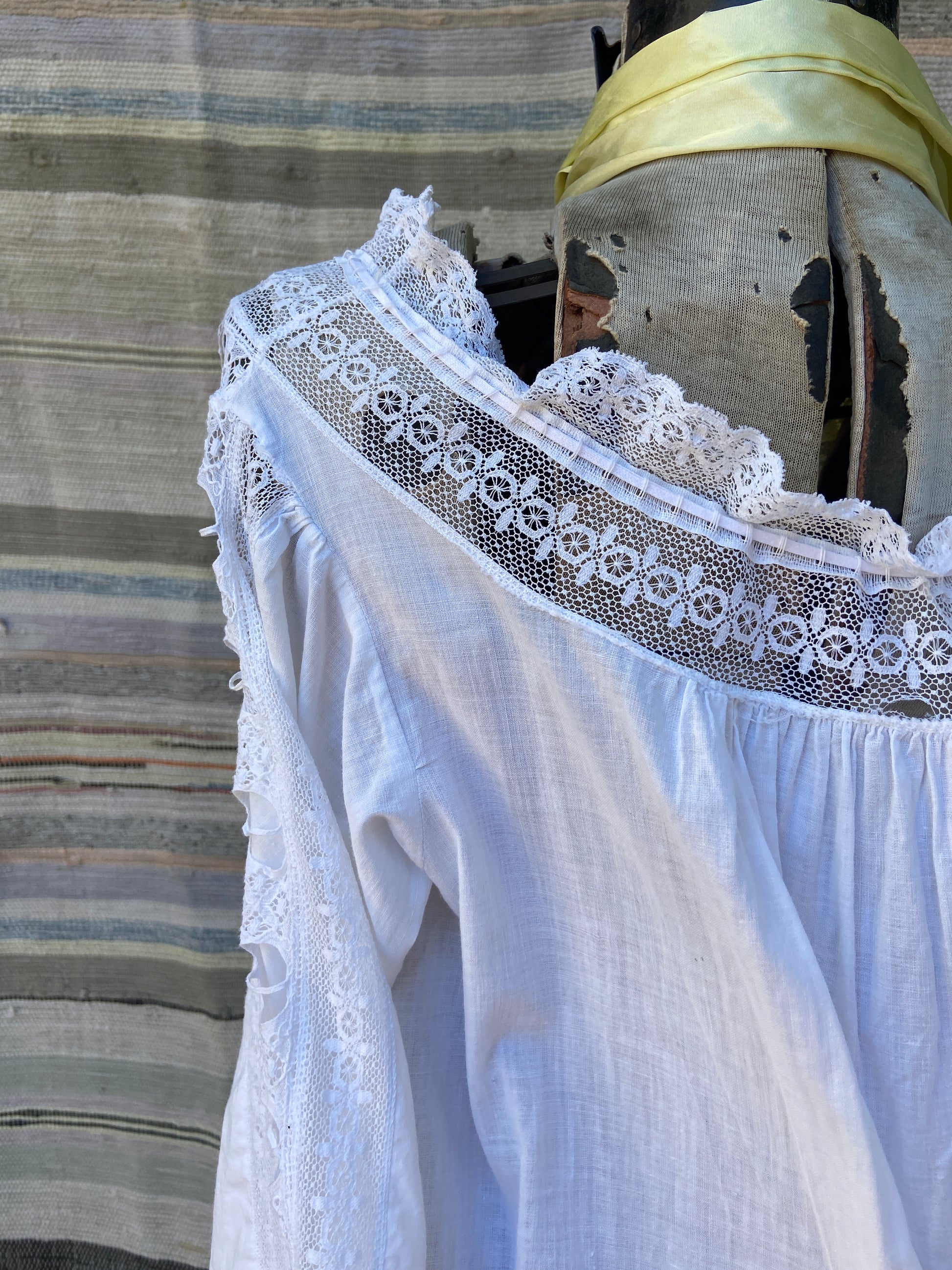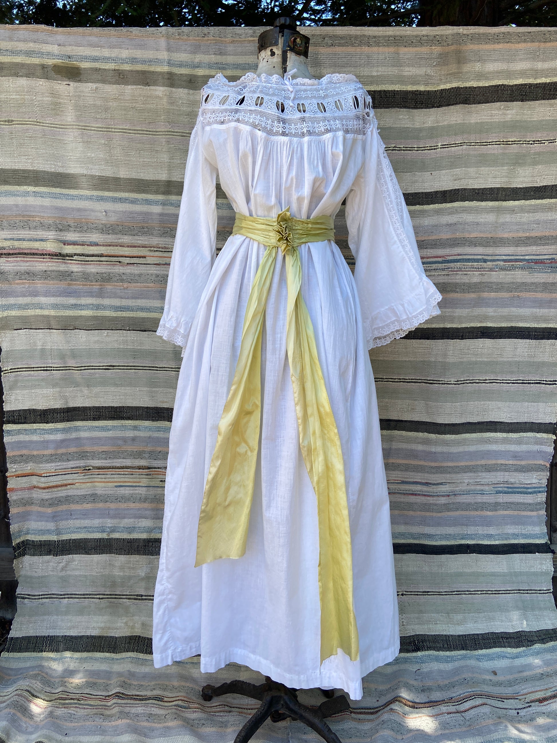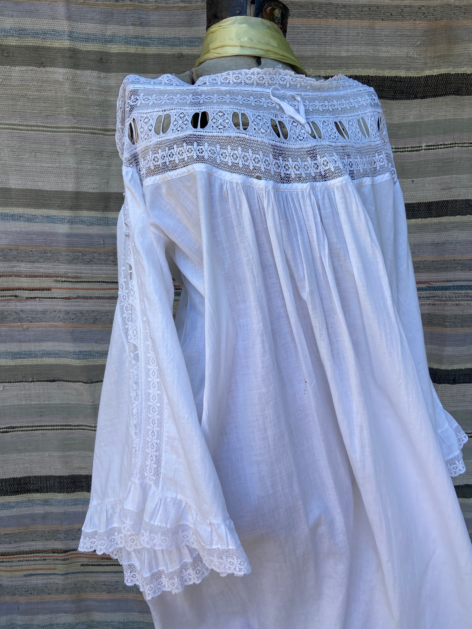 Incredible Edwardian cotton nightgown with etherial sleeves with lace inserts down the center, lace panel around neckline that has a tie woven throughout that can be adjusted to wear more off the shoulders or cinched on top of shoulders.
