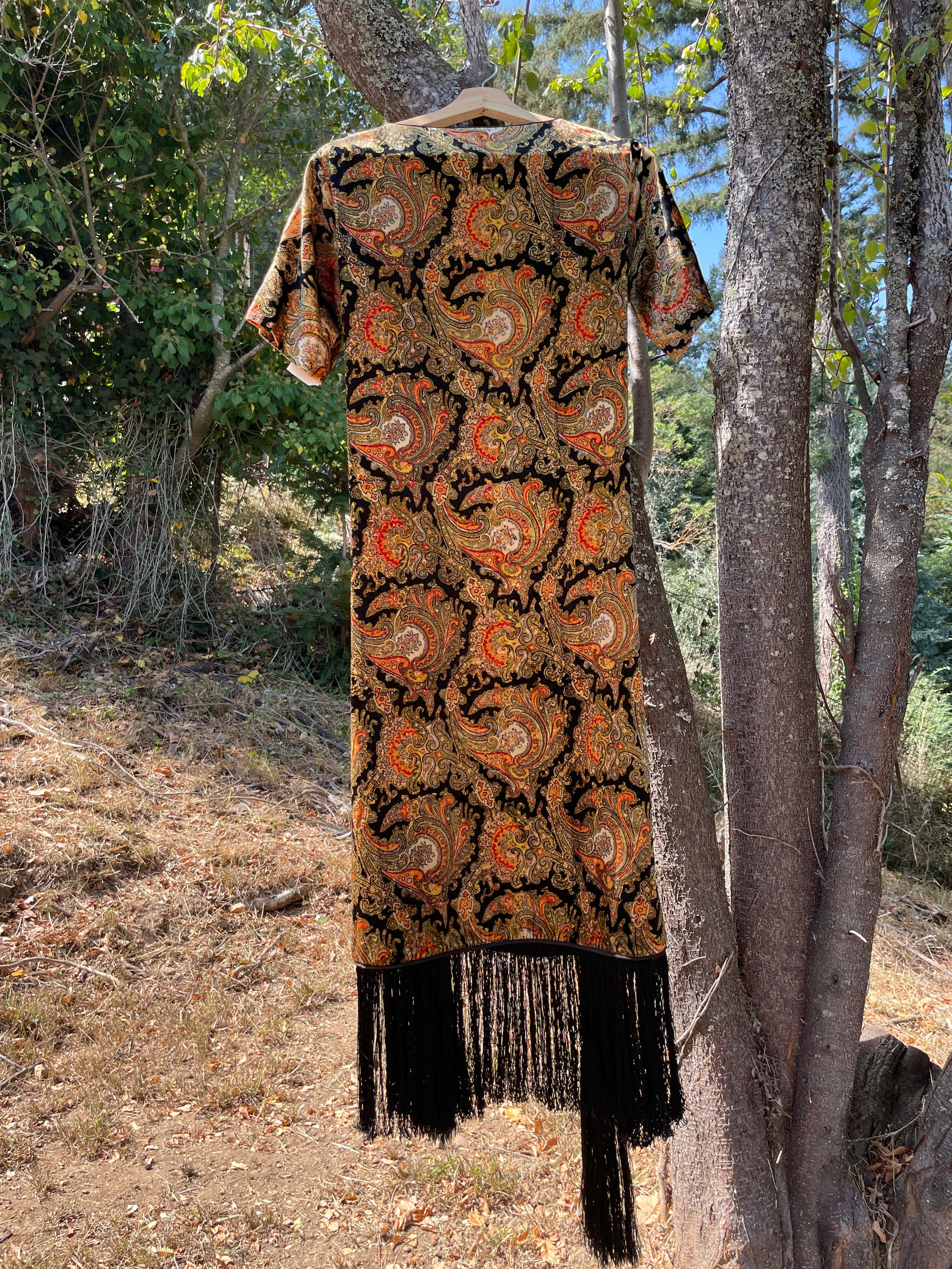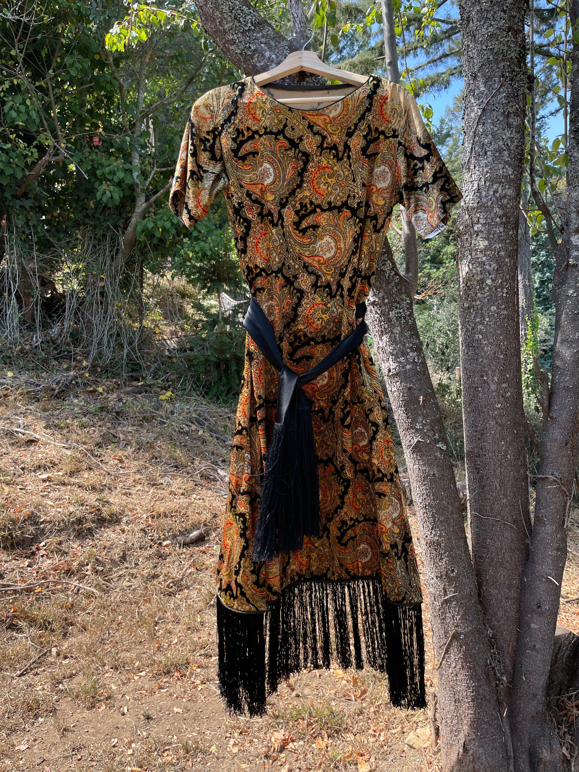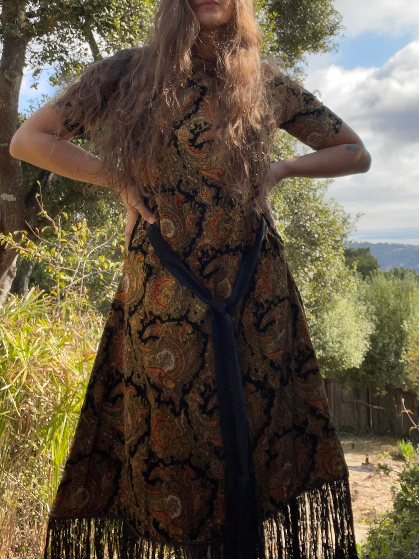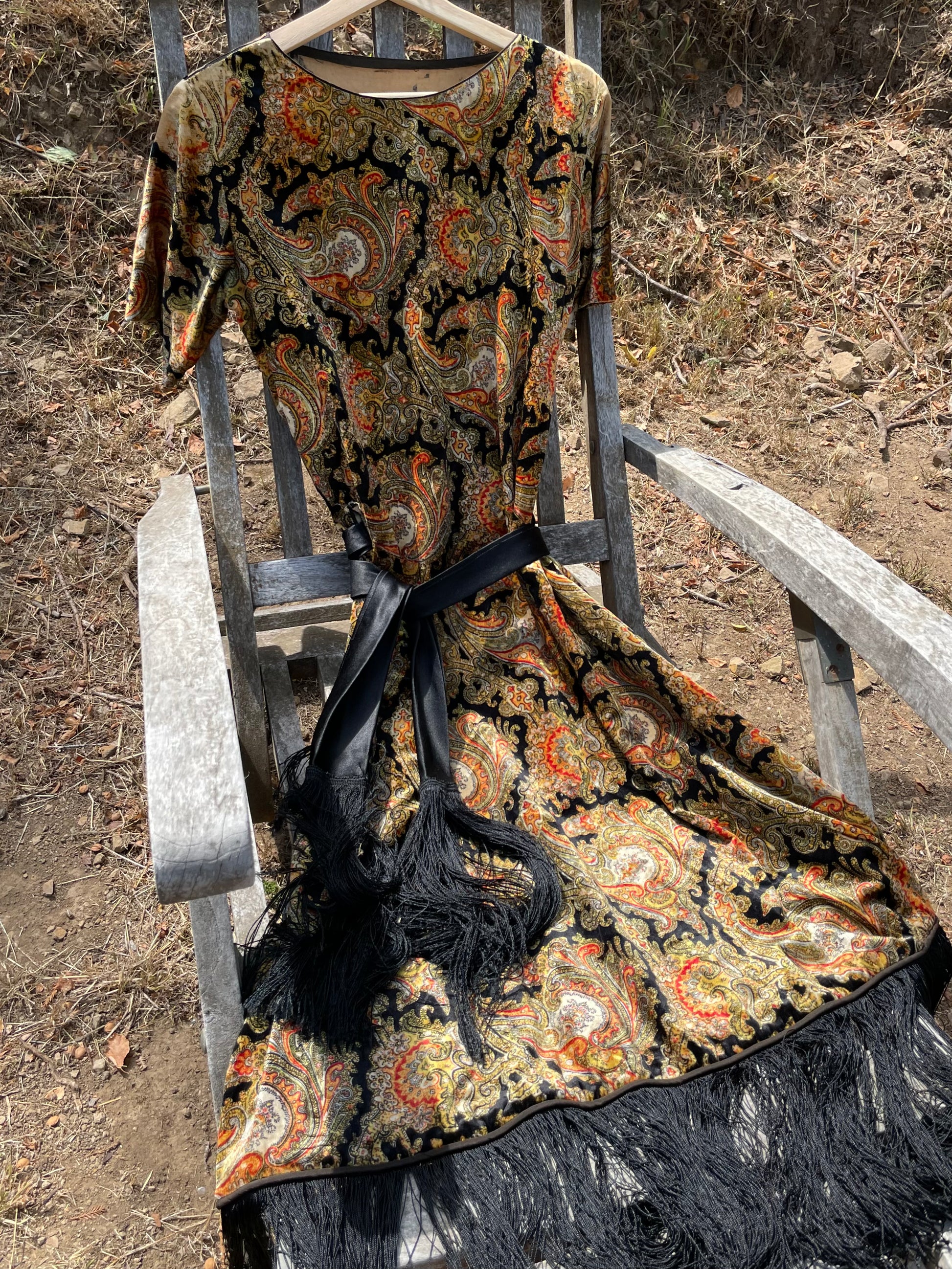 Stunning autumnal paisley silk velvet sheath style dress with fringe hem and on the belt ties. Snaps at both shoulder seams and along both side seams of dress next to belt opening