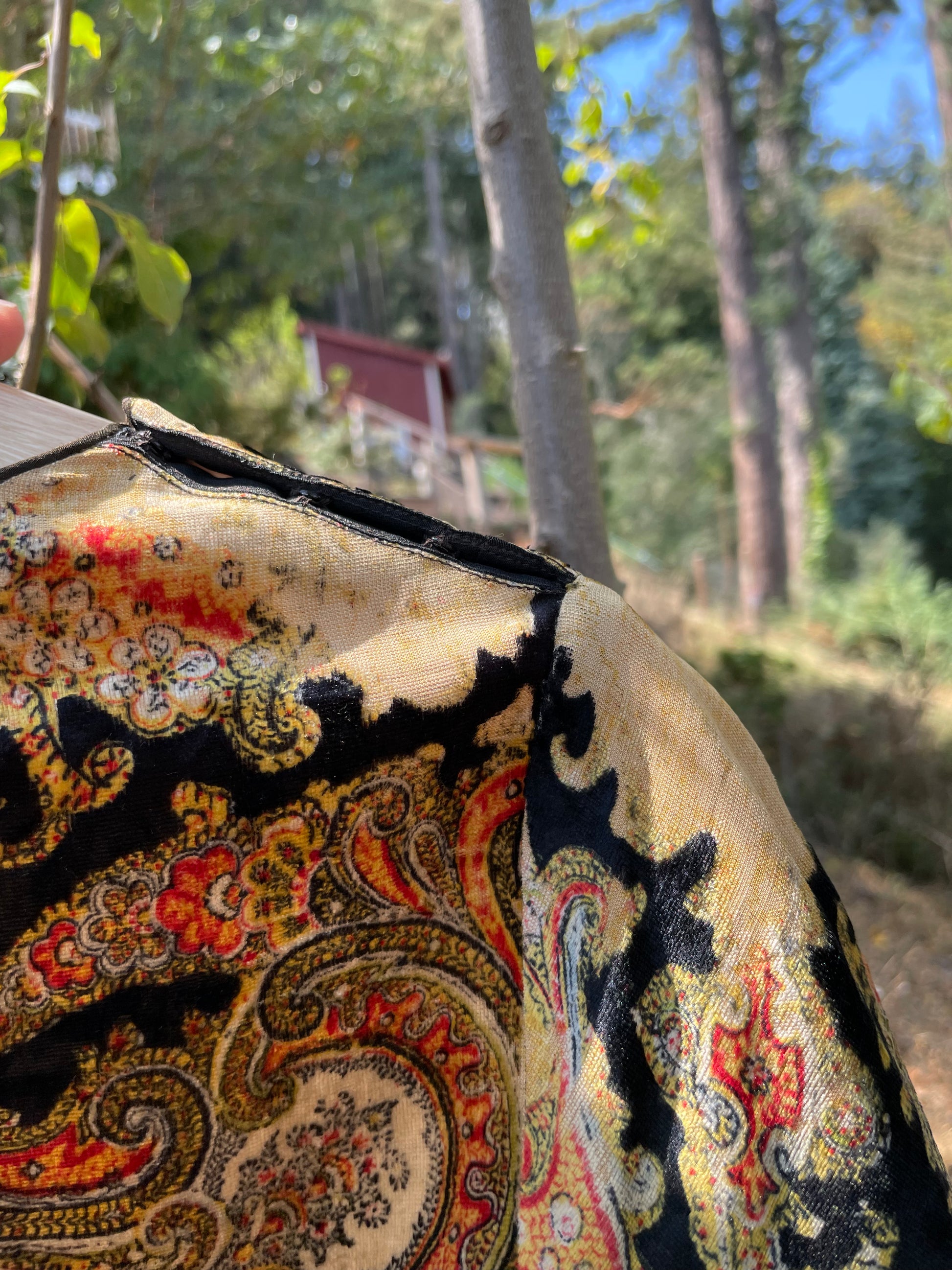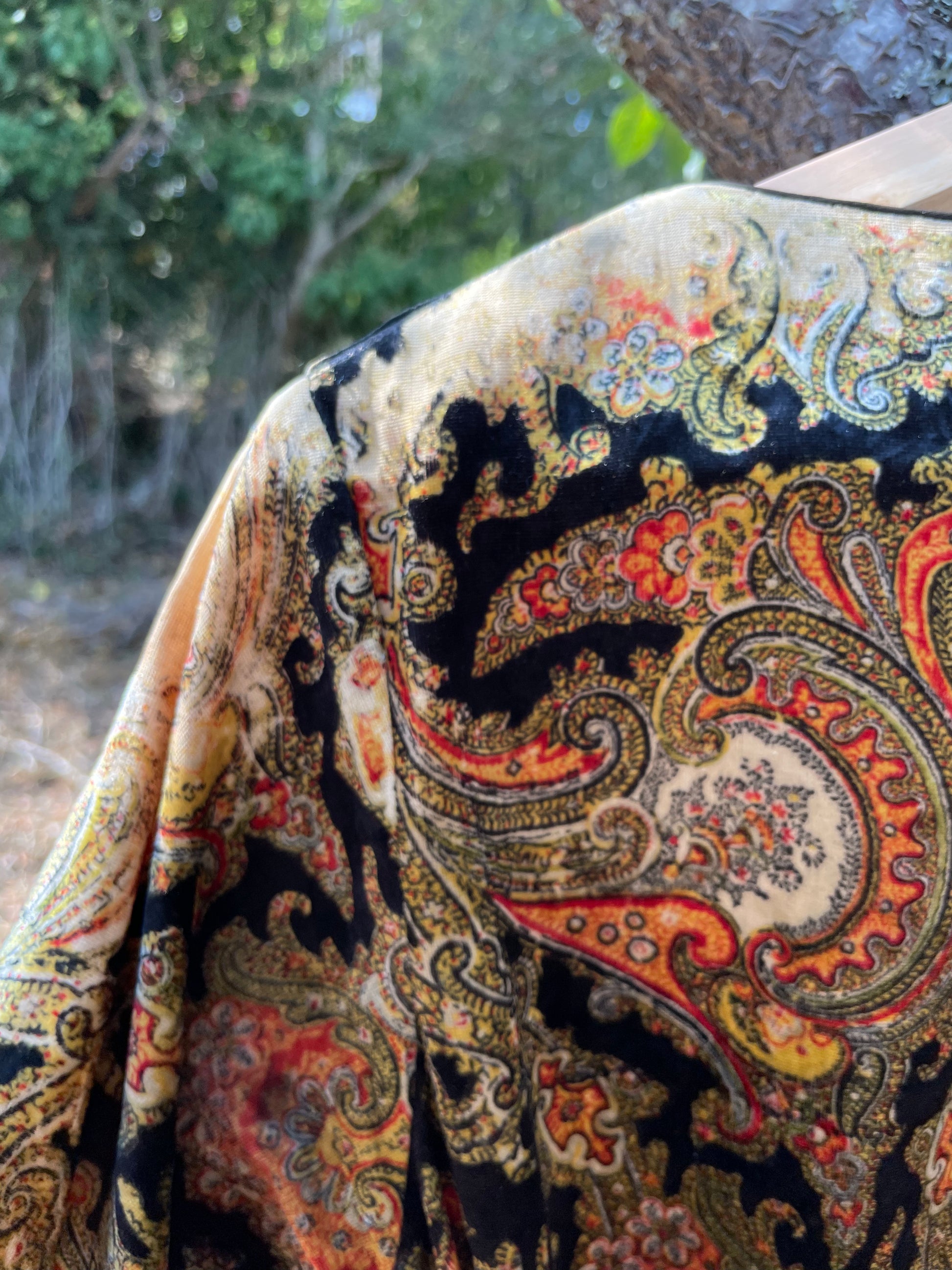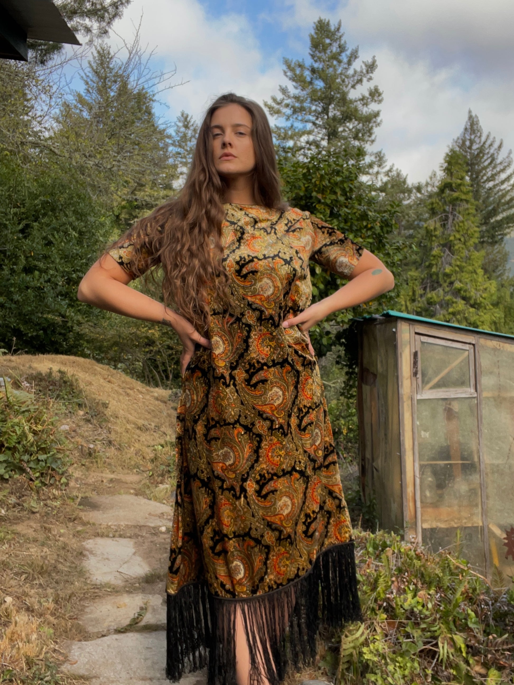 Stunning autumnal paisley silk velvet sheath style dress with fringe hem and on the belt ties. Snaps at both shoulder seams and along both side seams of dress next to belt opening