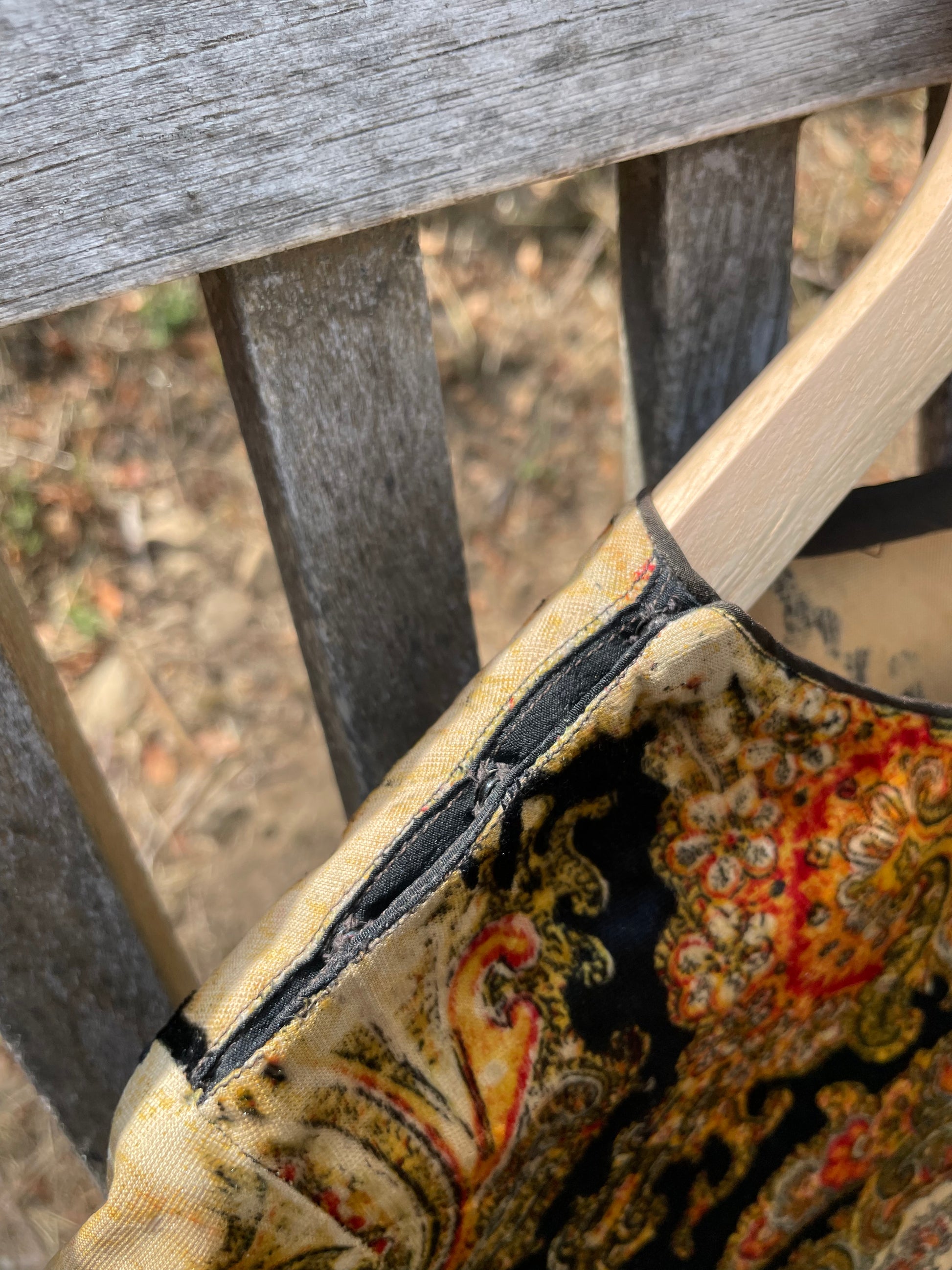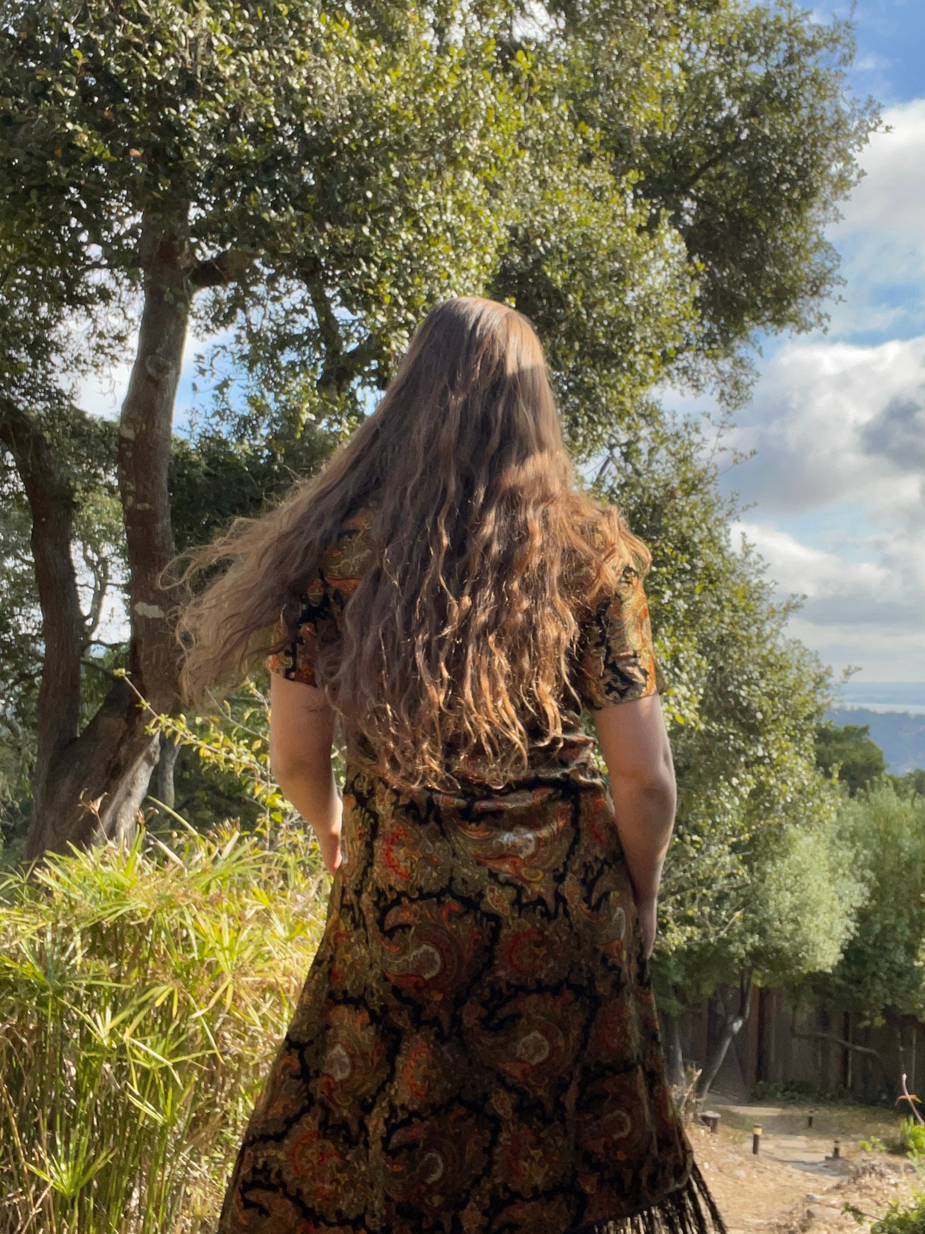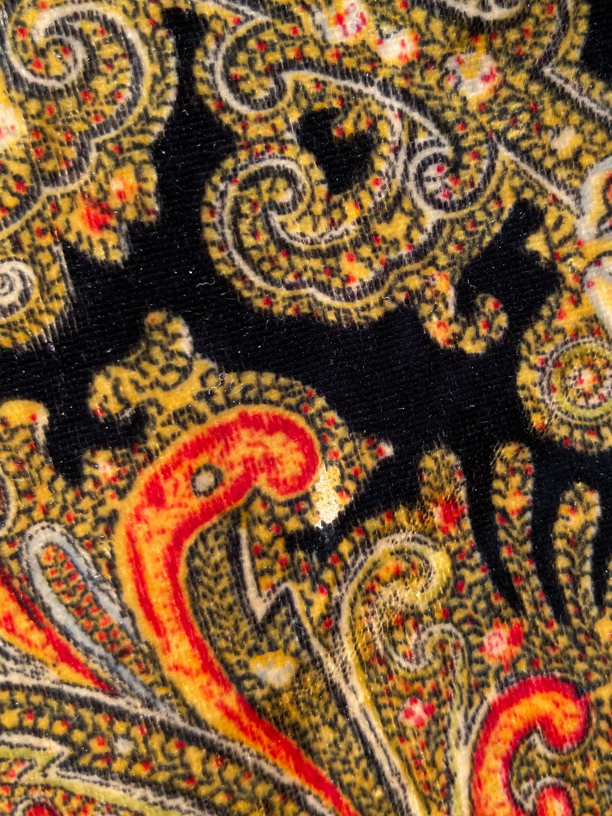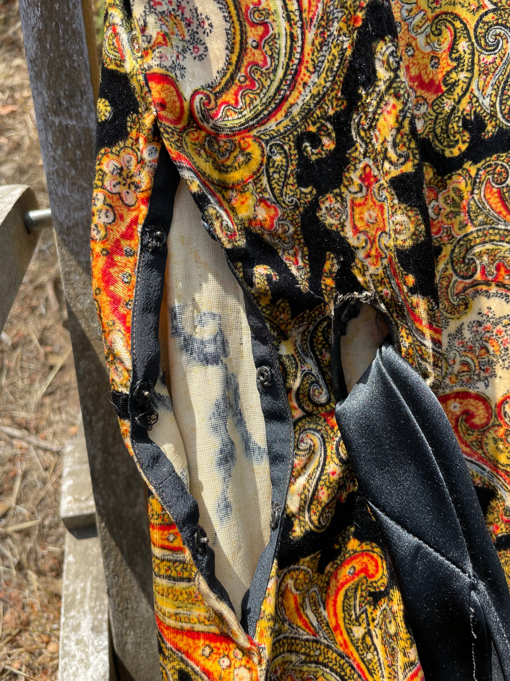 Stunning autumnal paisley silk velvet sheath style dress with fringe hem and on the belt ties. Snaps at both shoulder seams and along both side seams of dress next to belt opening