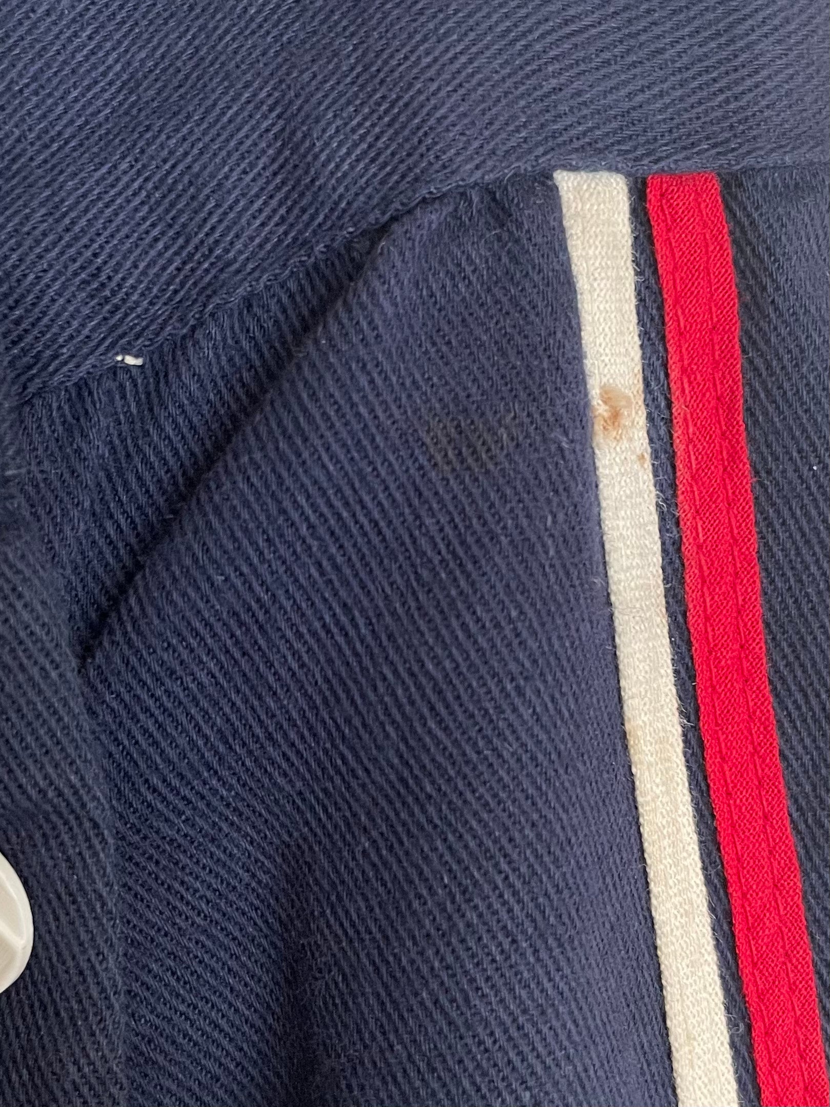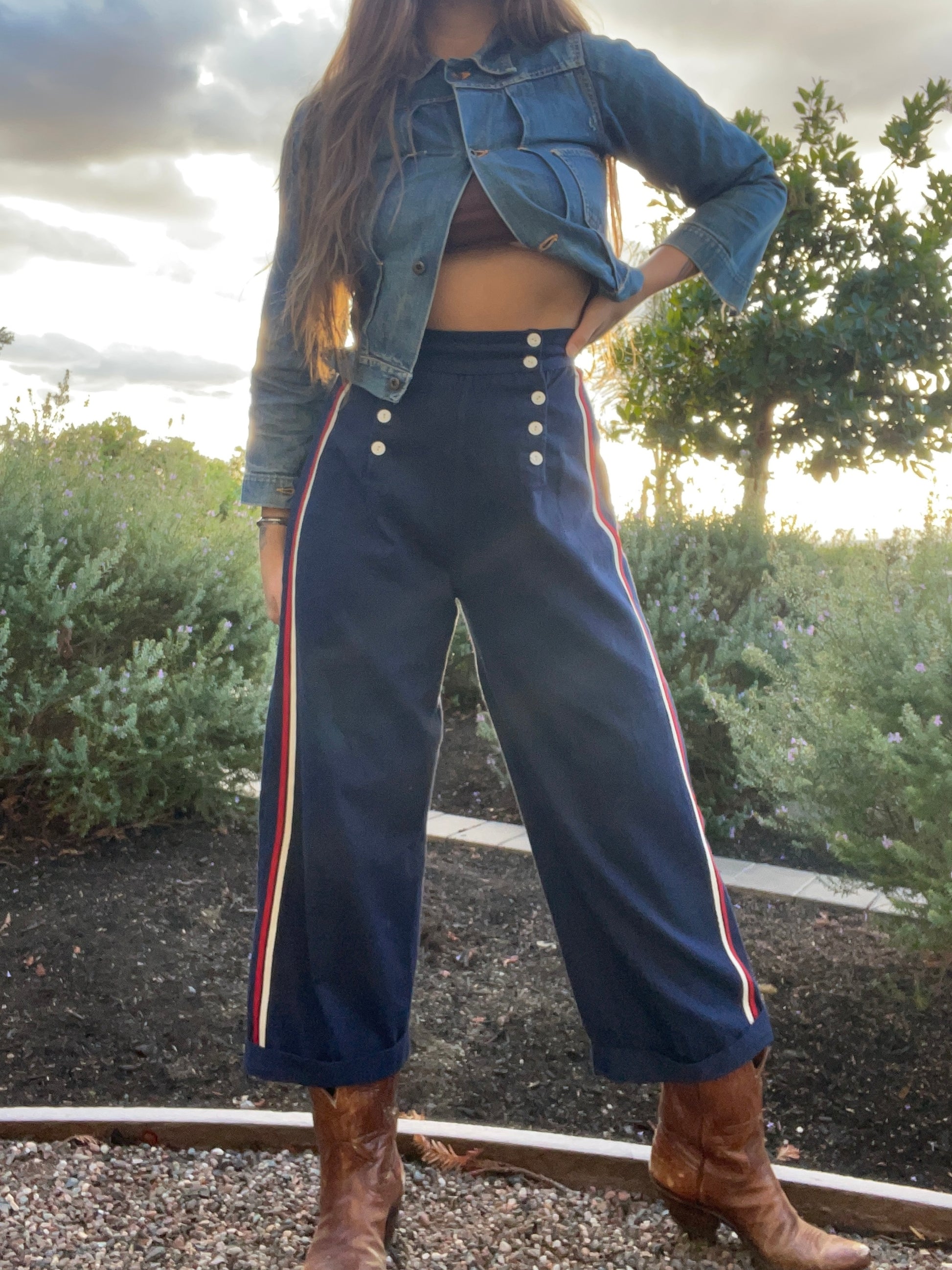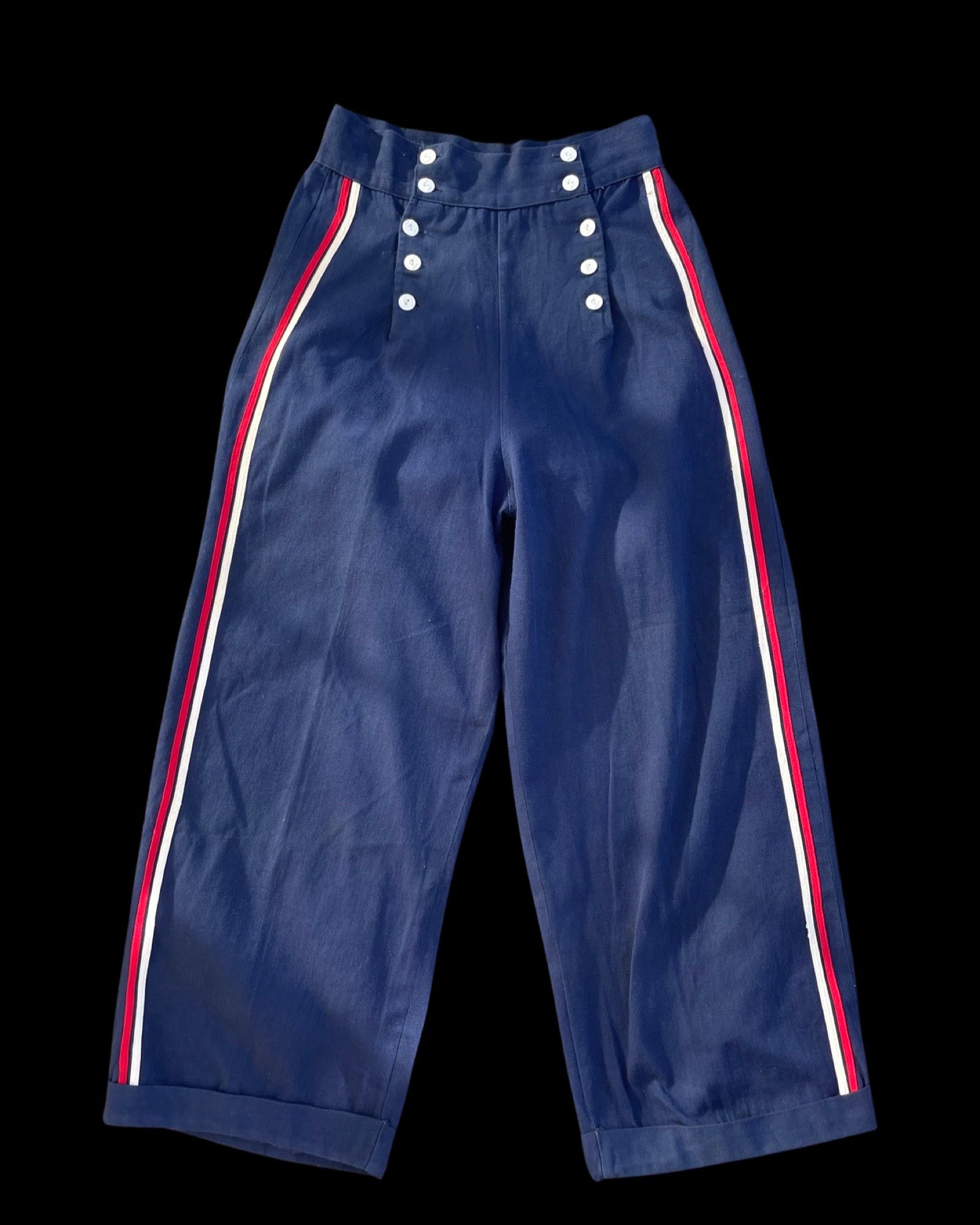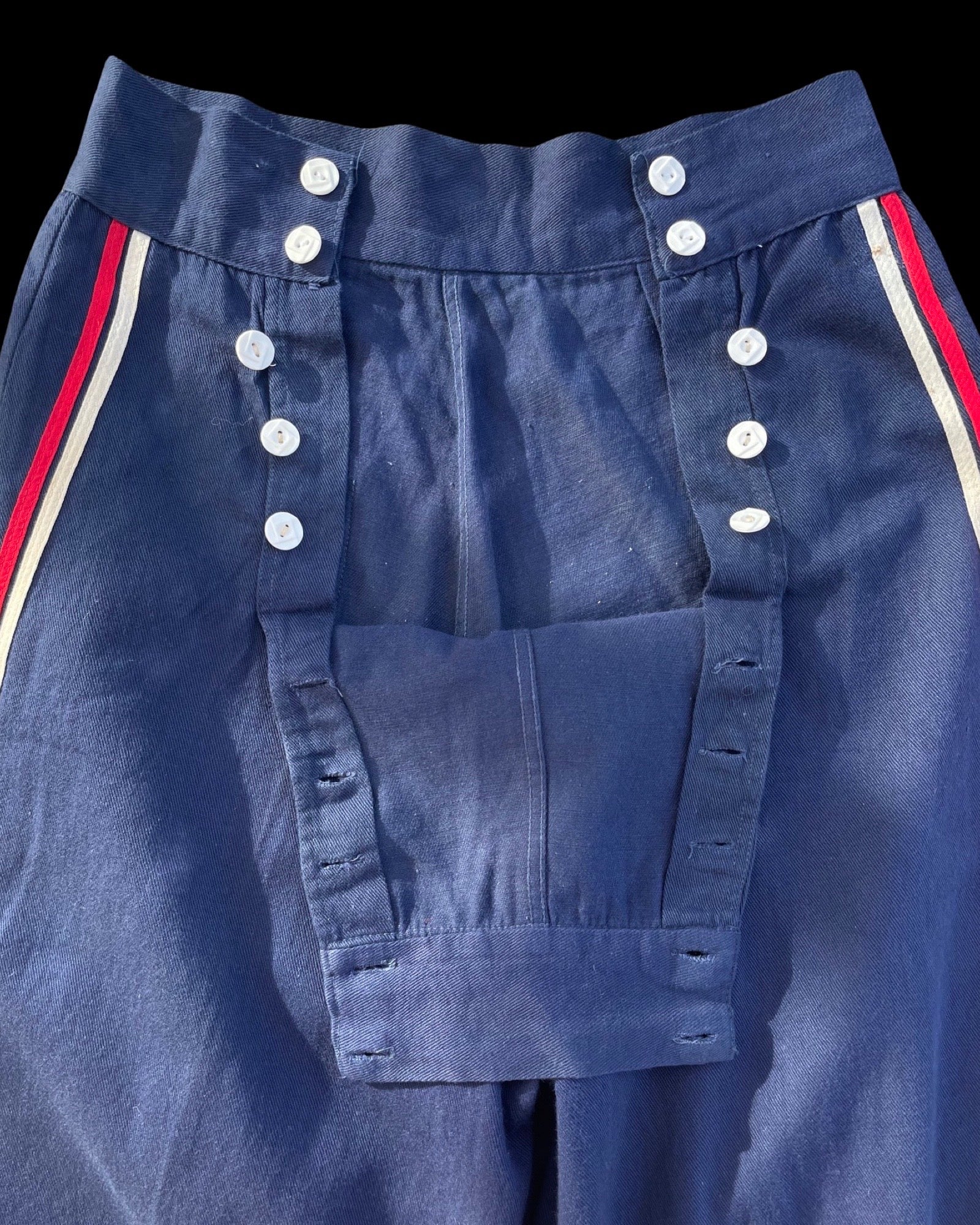 Perfect pair of 1930s sportswear navy cotton twill pants. Double side button/ fall front with carved celluloid buttons and red and white piping gown the side leg. Single back patch pocket on rear and cuffed hems