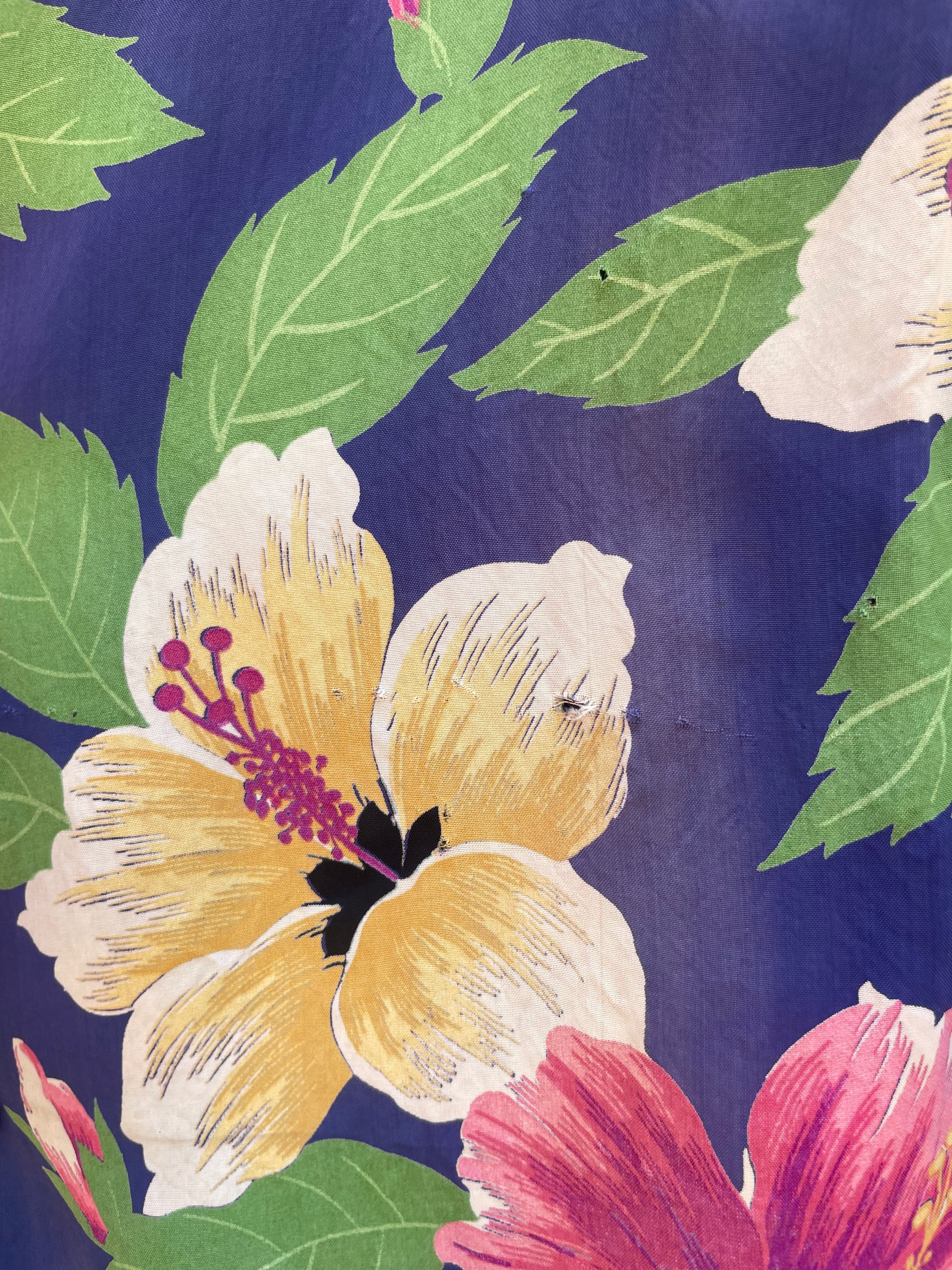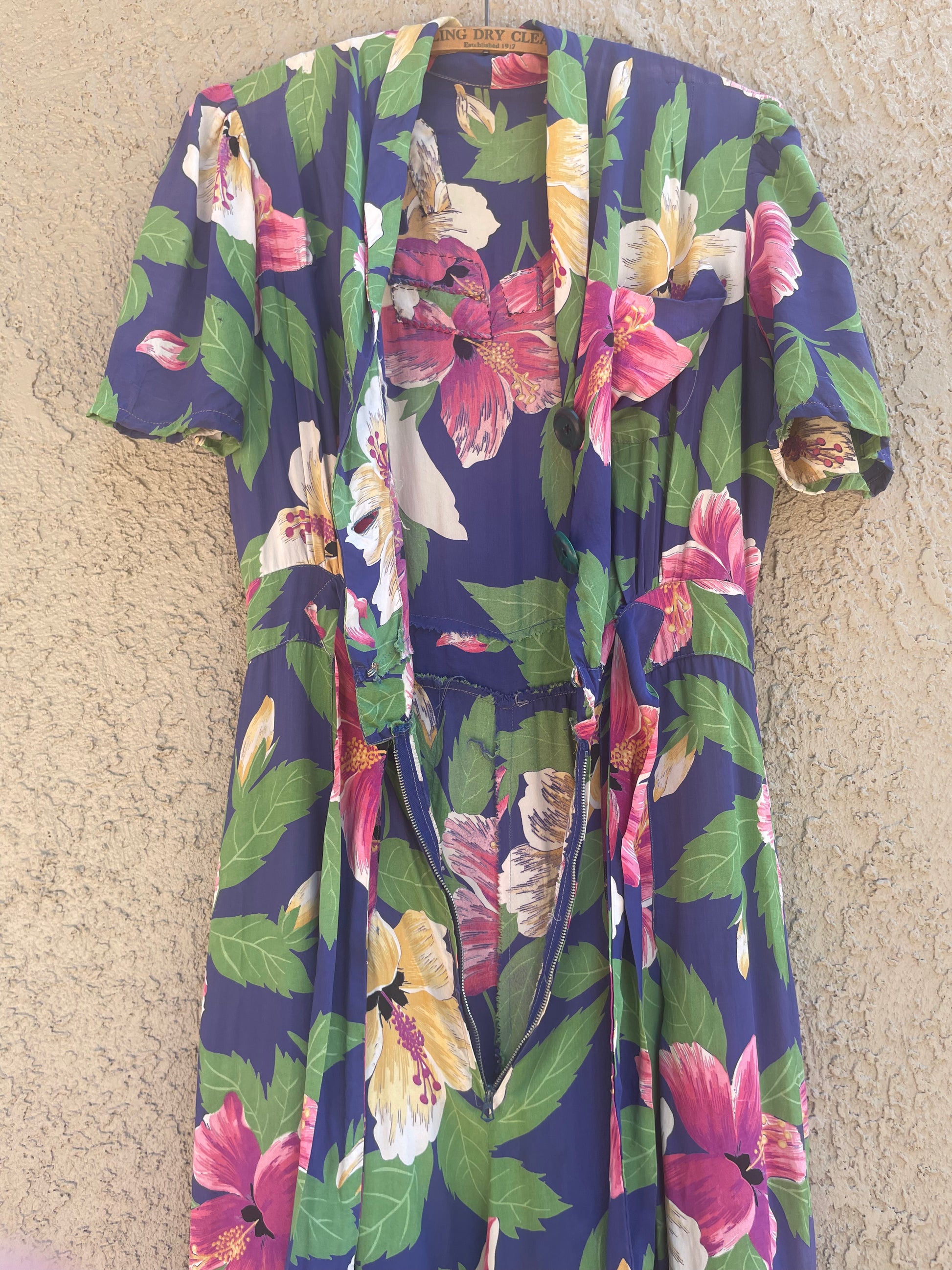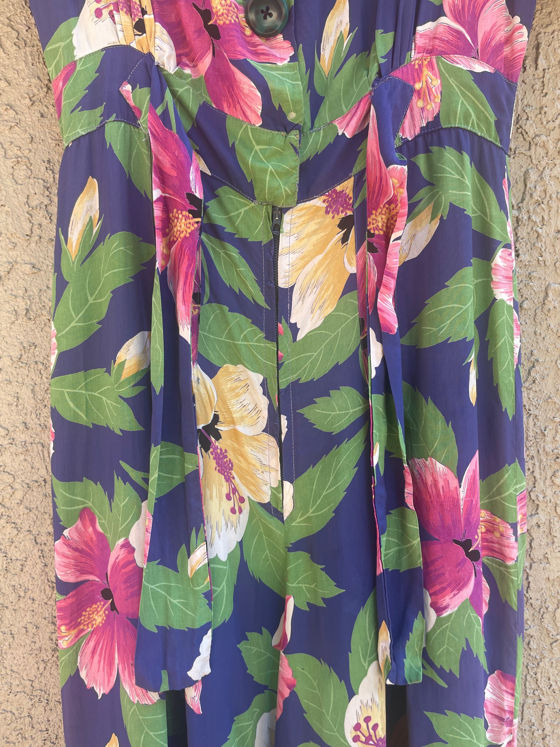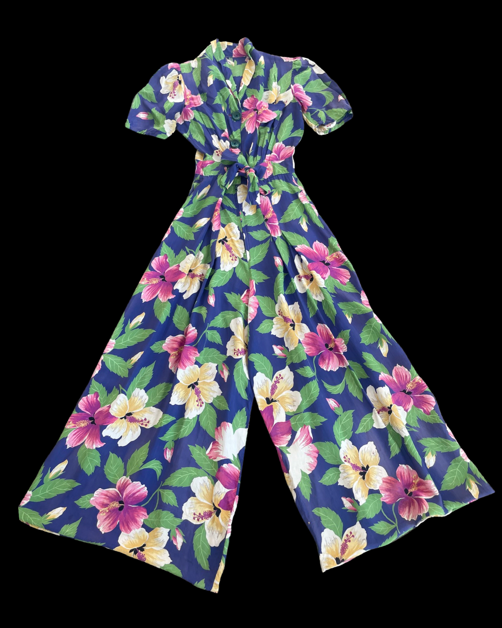 Incredibly special and covetable 1940s jumpsuit made from a large scale tropical Hawaiiana print rayon with a deep navy blue base color. Features slightly puffed sleeves, large early plastic button closures up bodice with talon bell zipper from waist down with hook and eye at waistline, darting down legs and attached self ties at waist to adjust to desired fit