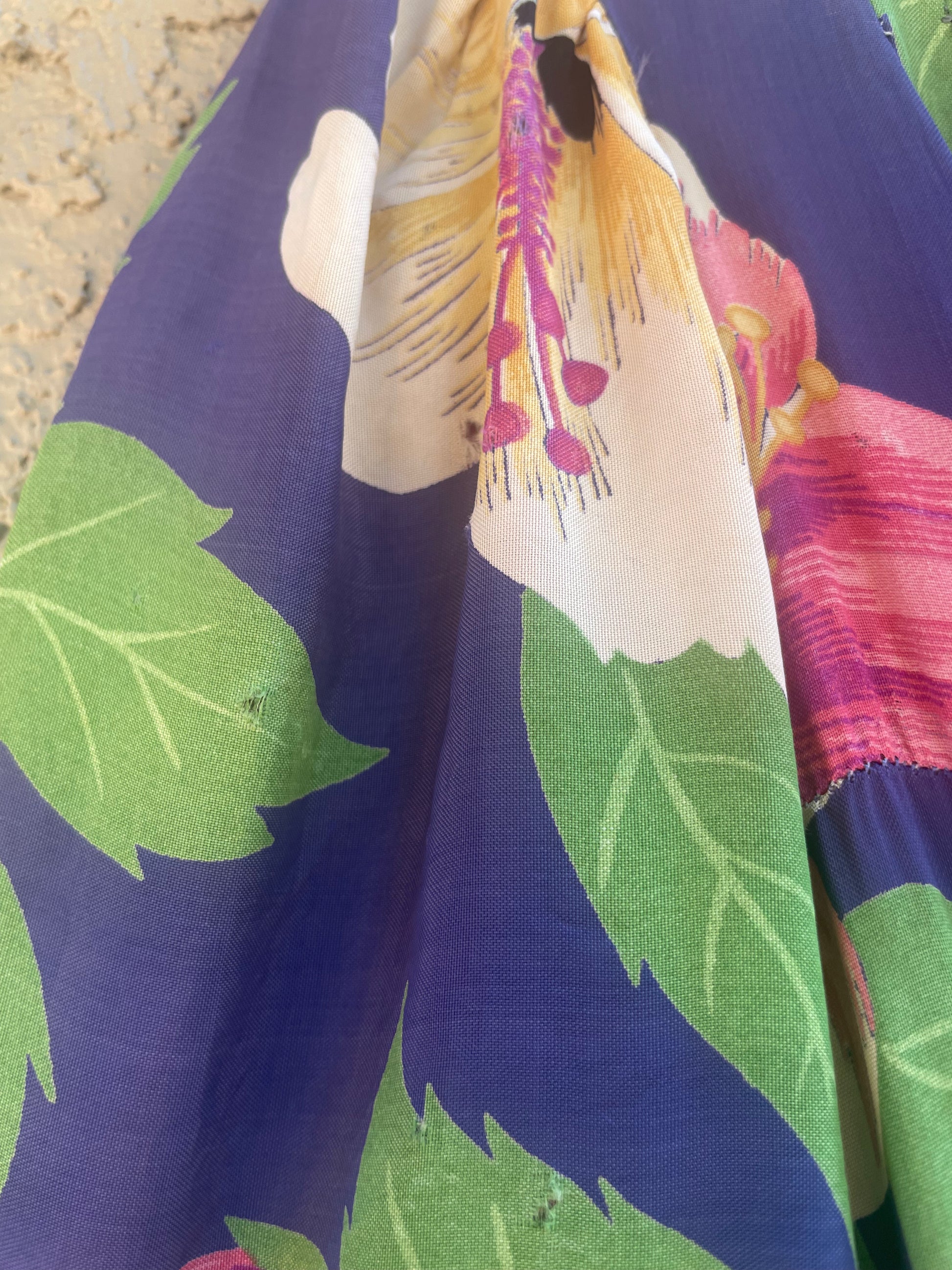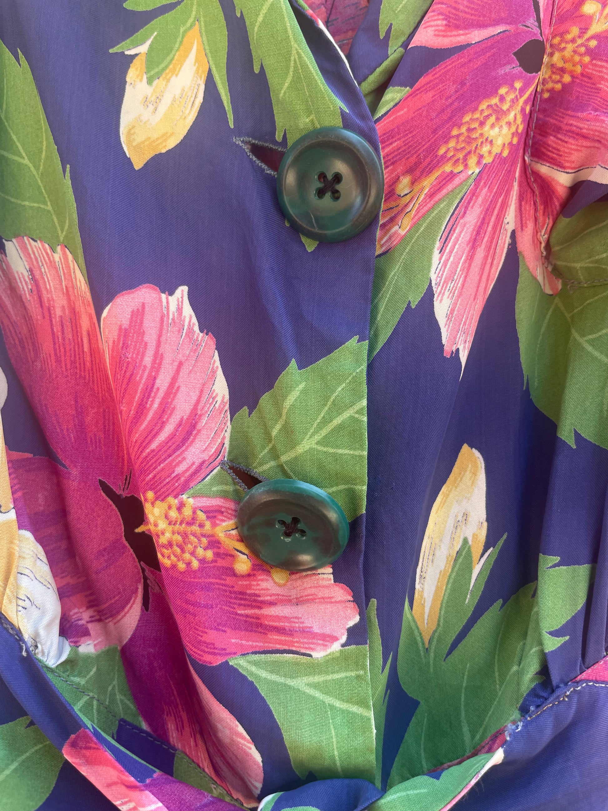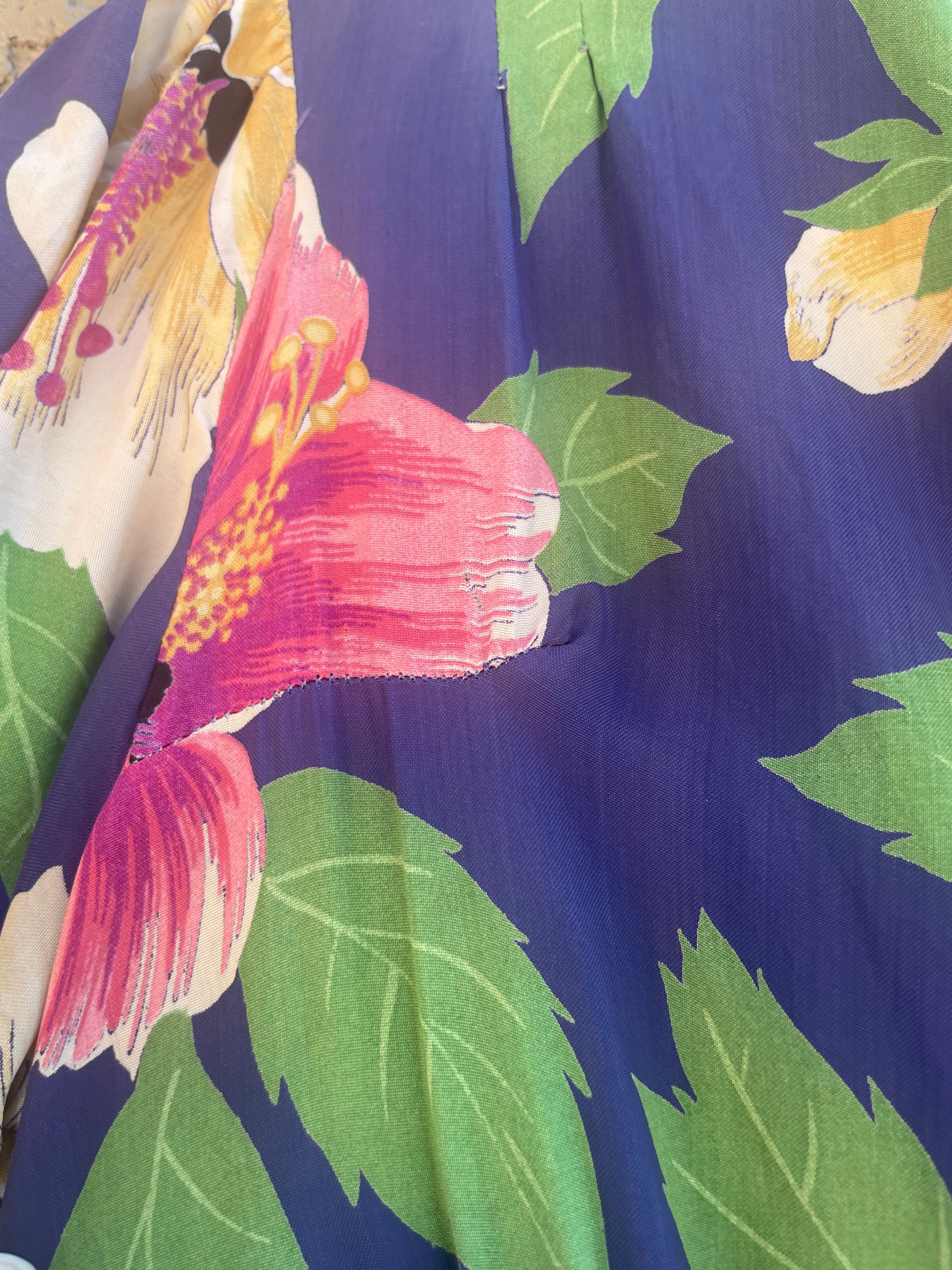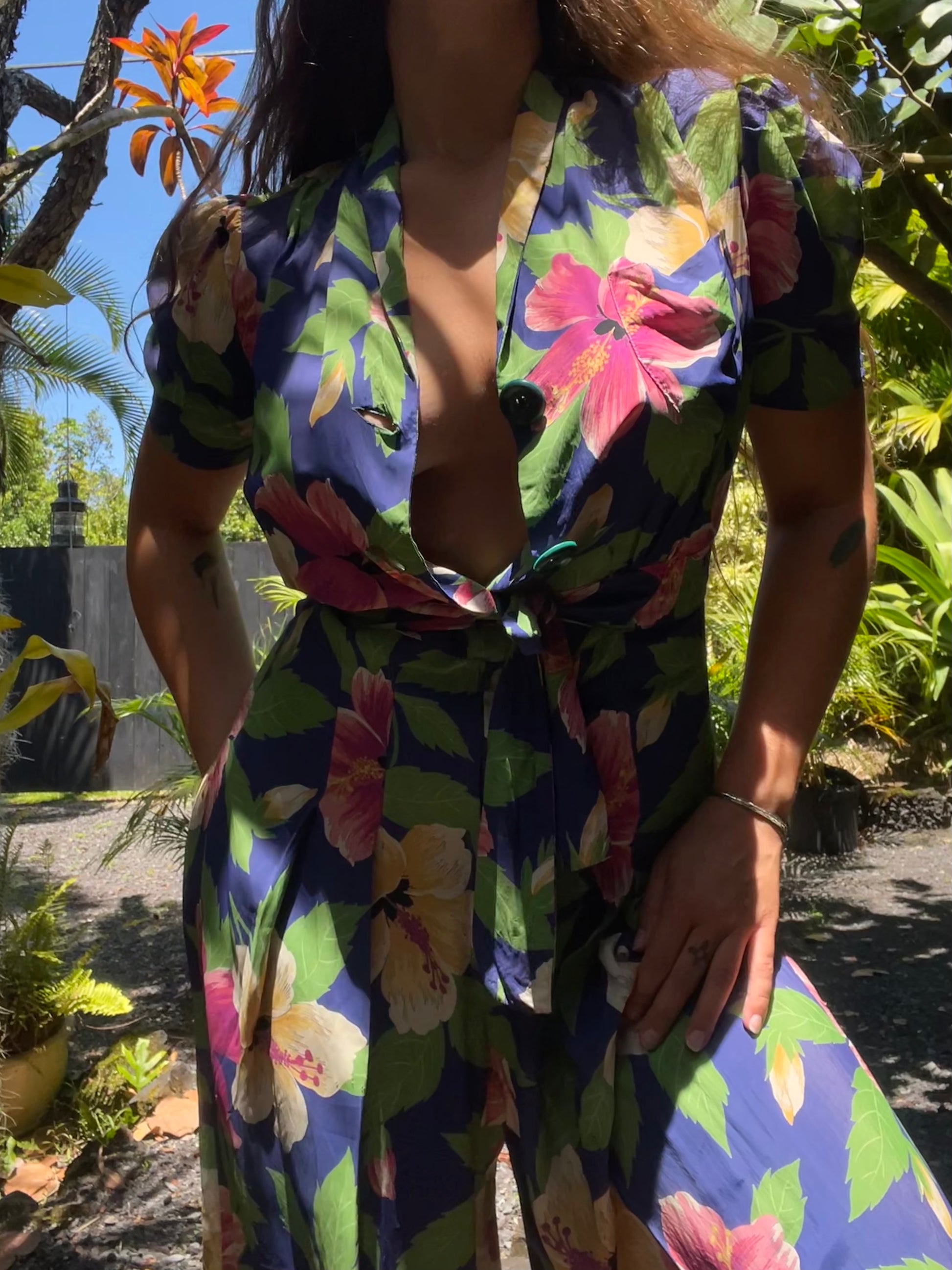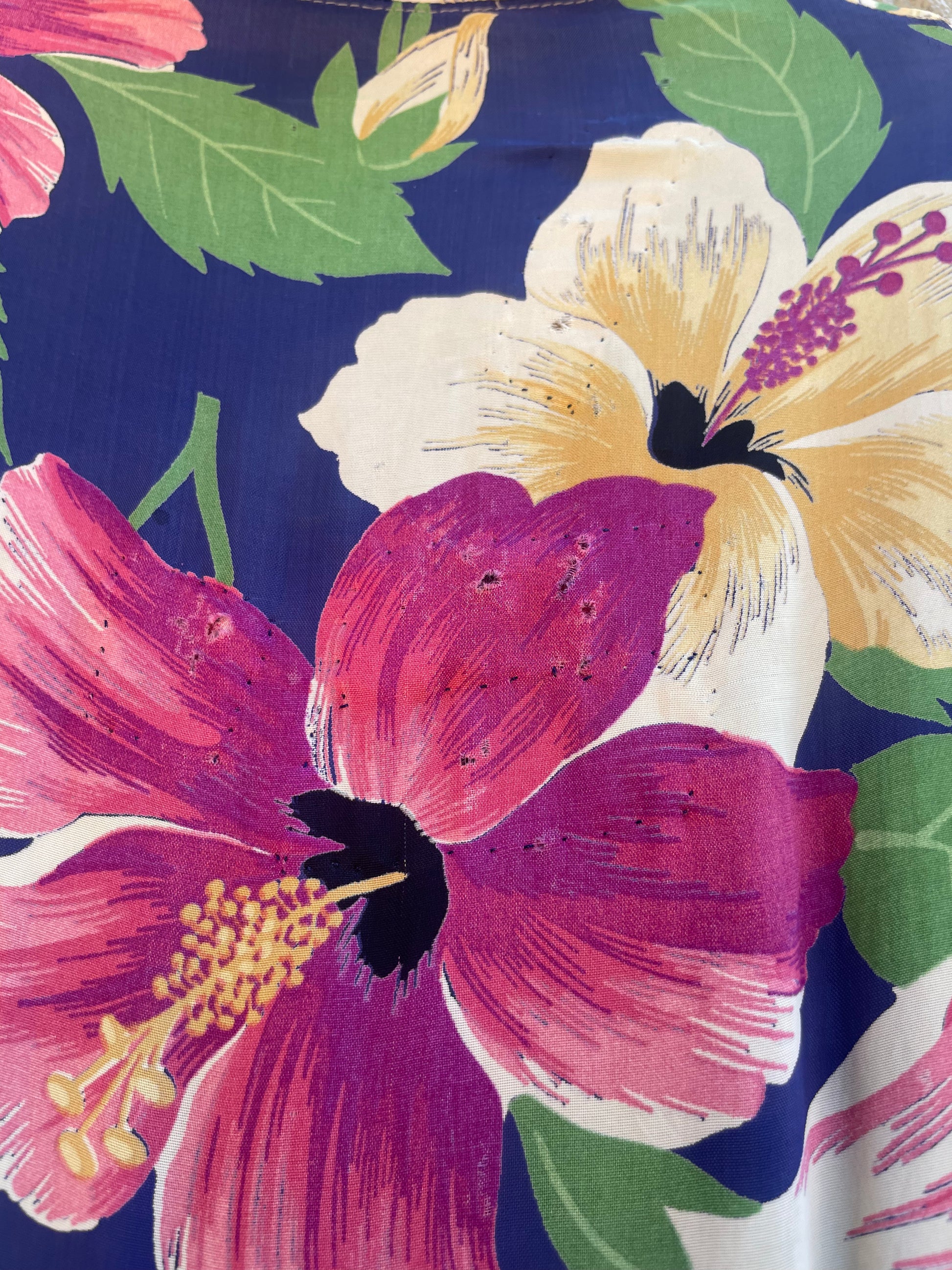 Incredibly special and covetable 1940s jumpsuit made from a large scale tropical Hawaiiana print rayon with a deep navy blue base color. Features slightly puffed sleeves, large early plastic button closures up bodice with talon bell zipper from waist down with hook and eye at waistline, darting down legs and attached self ties at waist to adjust to desired fit