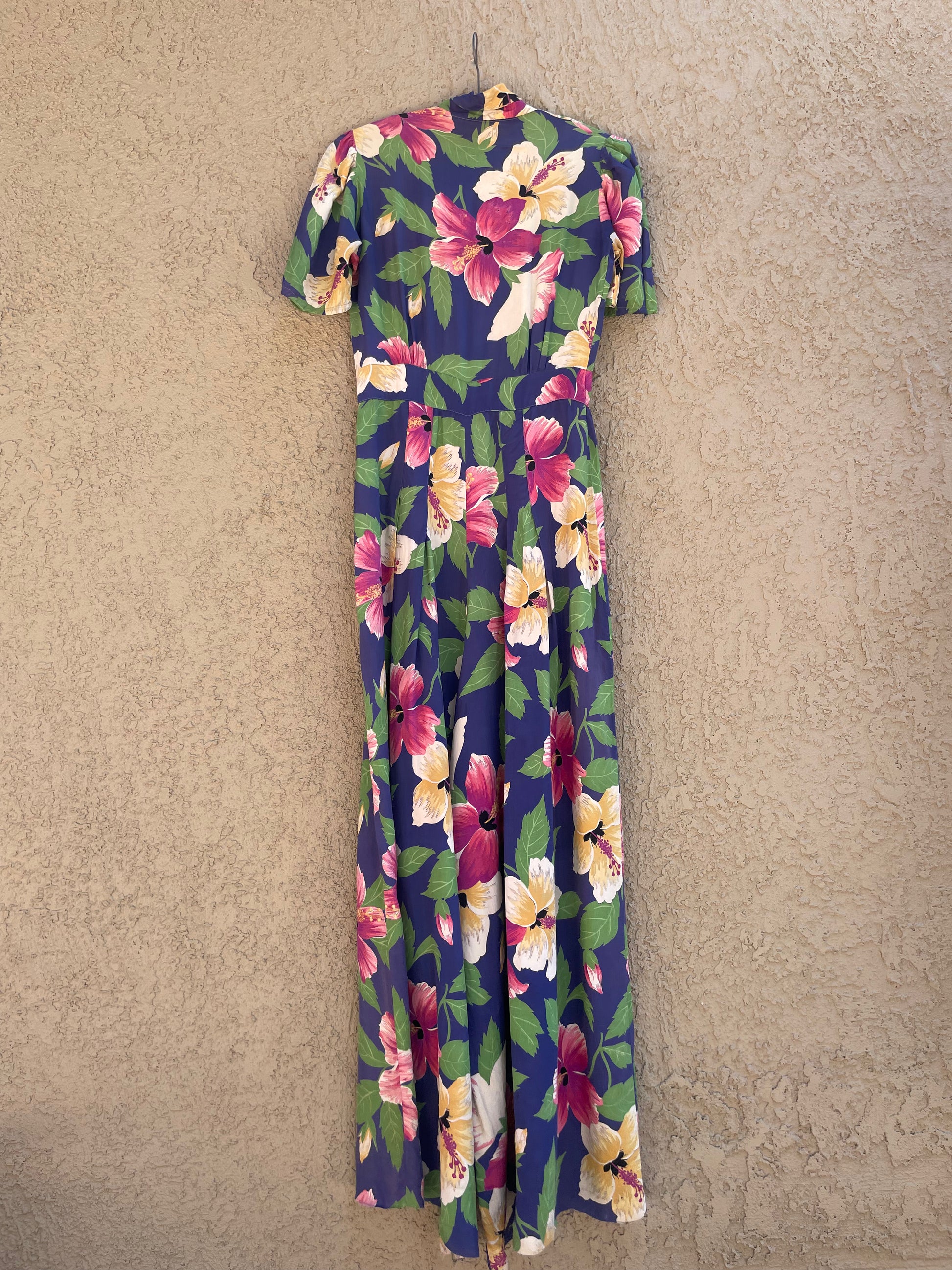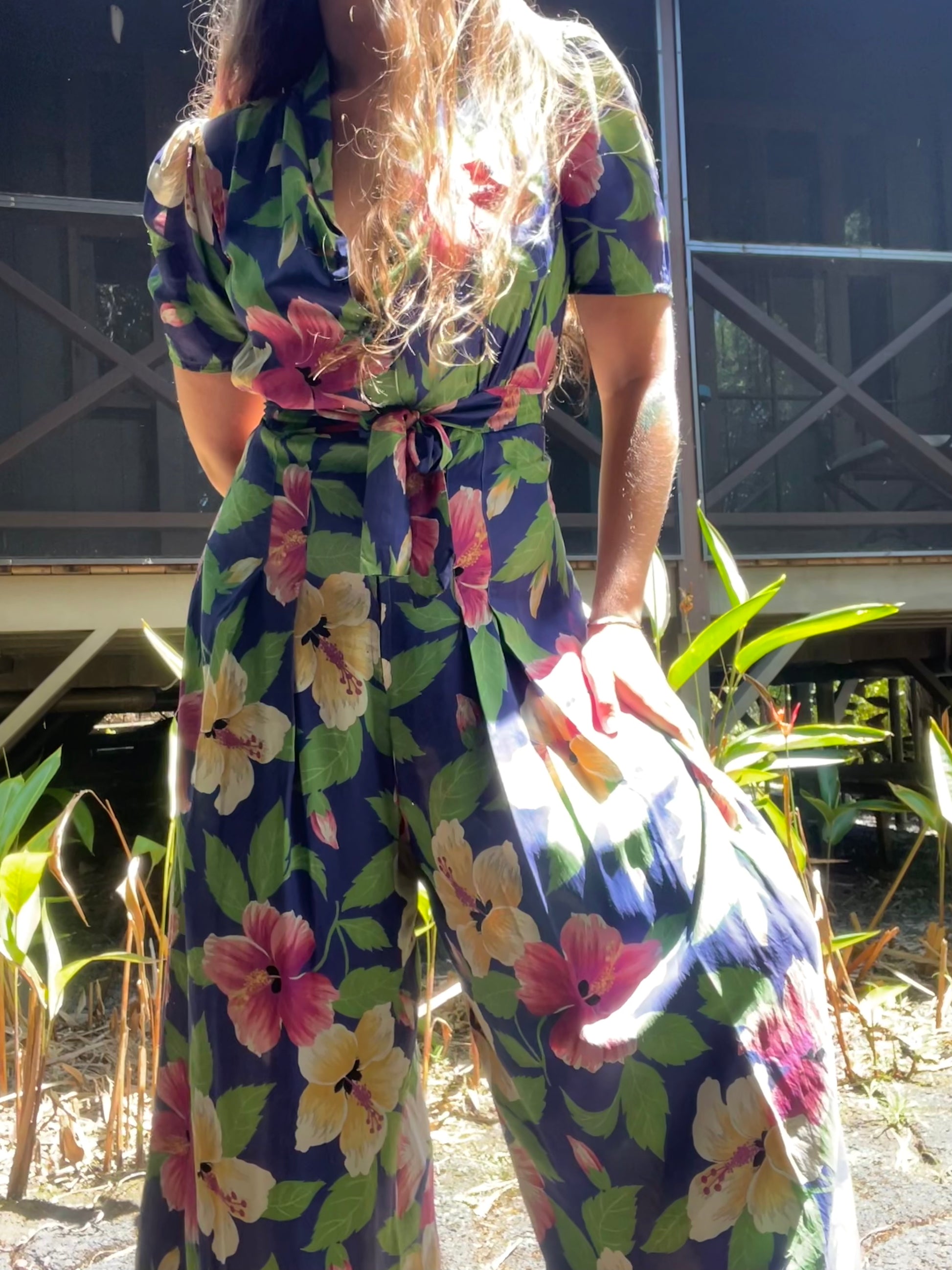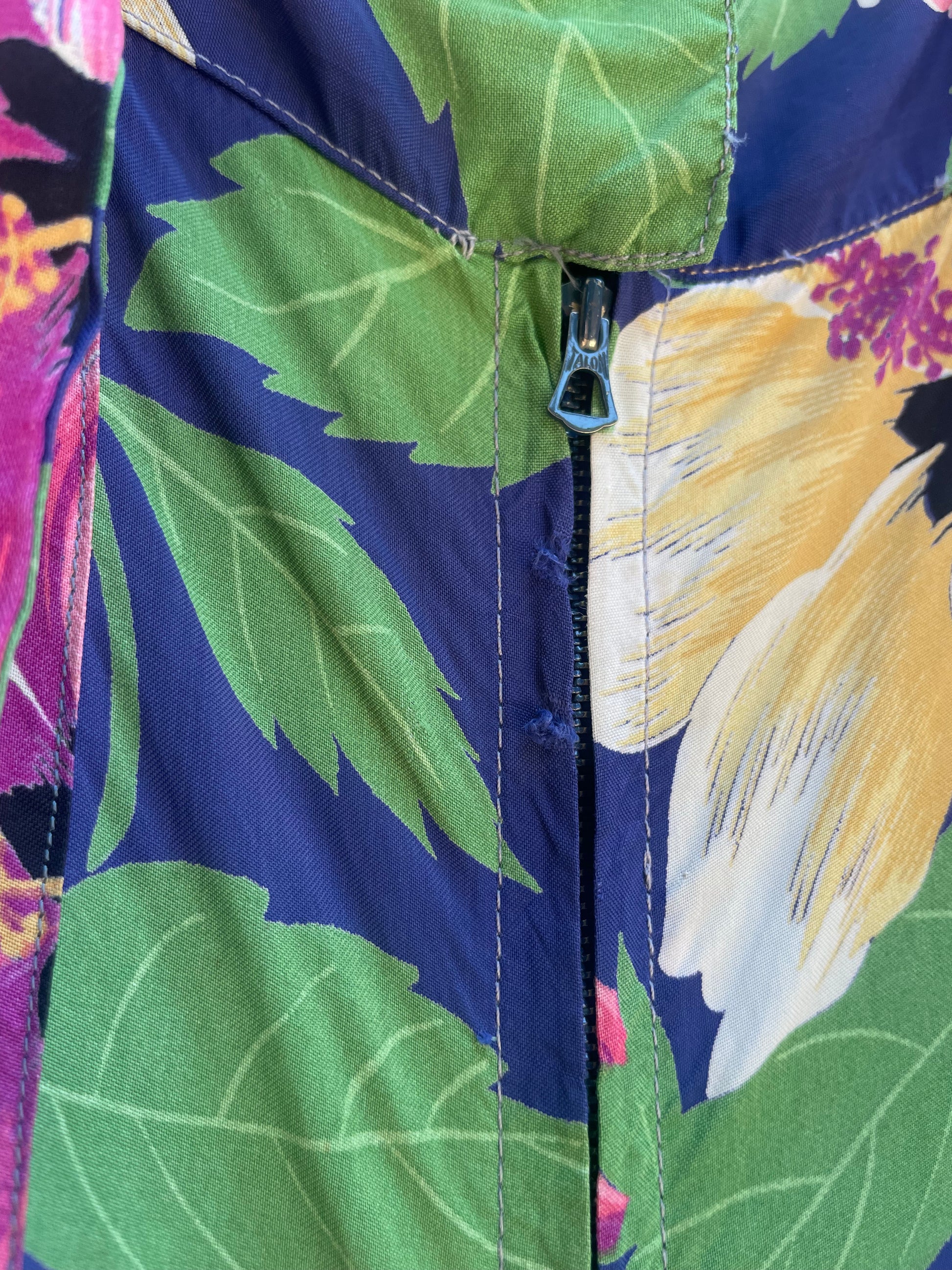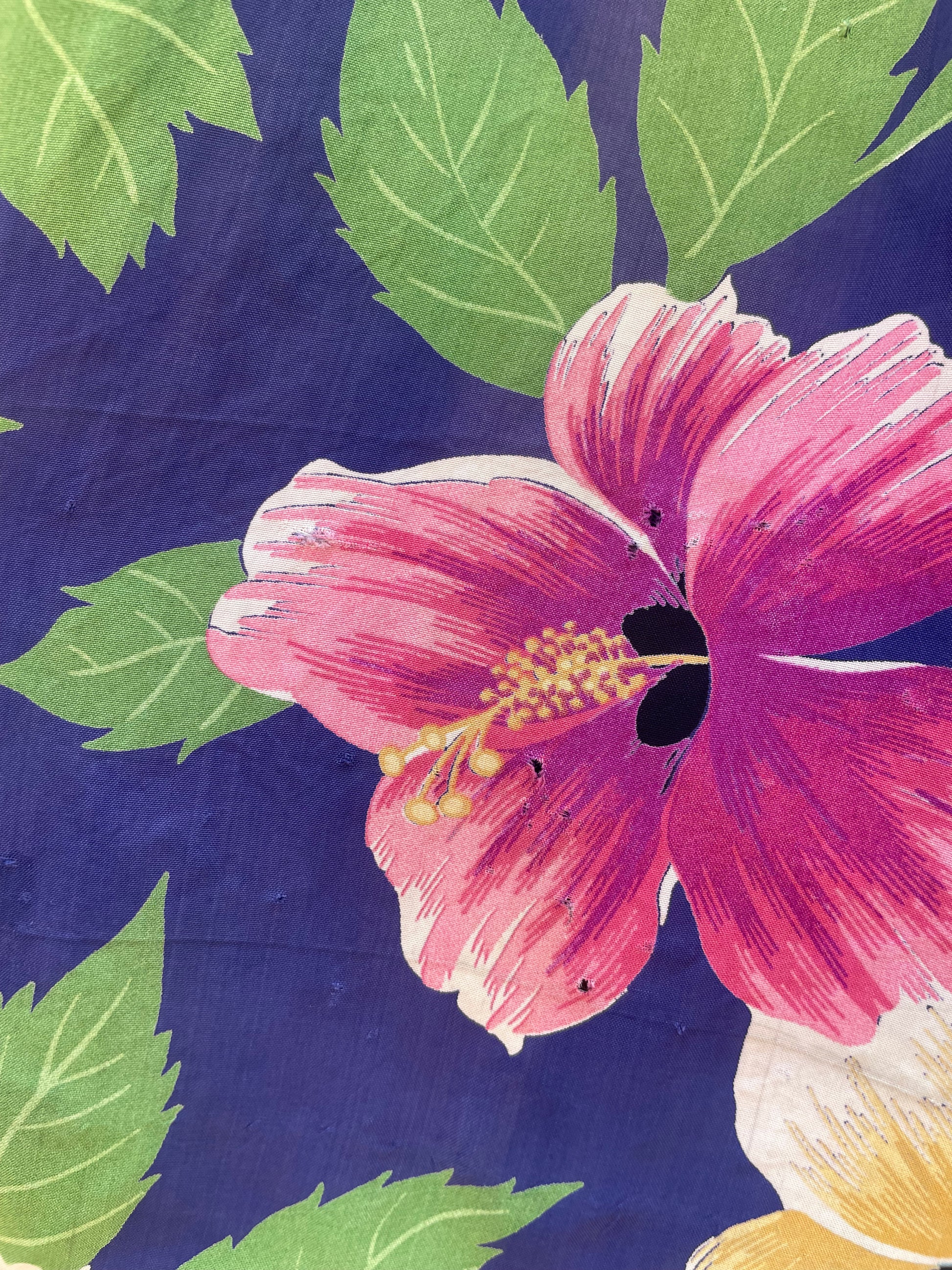Incredibly special and covetable 1940s jumpsuit made from a large scale tropical Hawaiiana print rayon with a deep navy blue base color. Features slightly puffed sleeves, large early plastic button closures up bodice with talon bell zipper from waist down with hook and eye at waistline, darting down legs and attached self ties at waist to adjust to desired fit